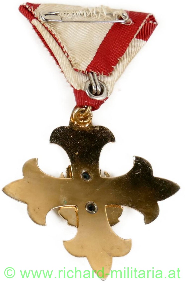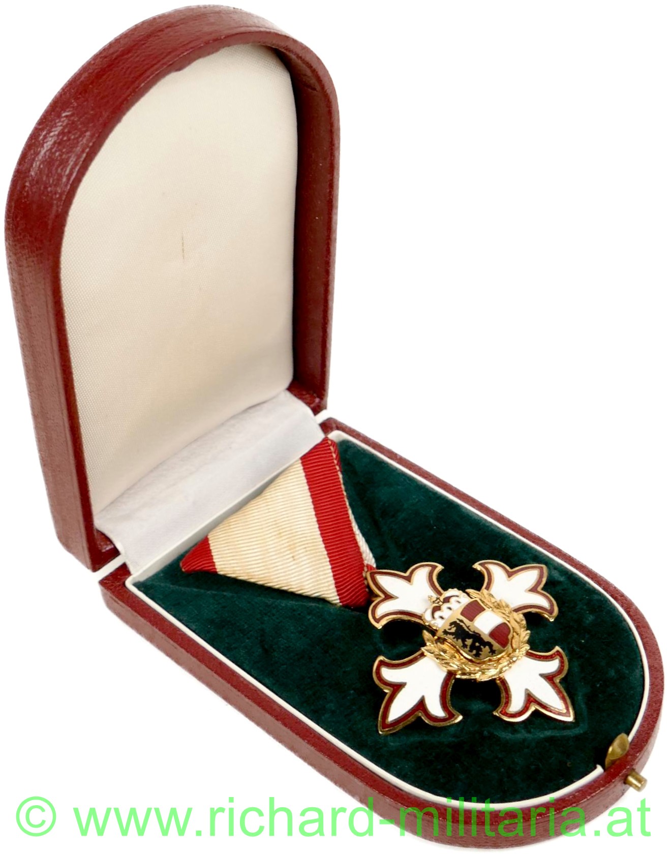 Goldenes Verdienstzeichen des Landes Salzburg mit Etui, Tombak vergoldet und emailliert, mit dazugehörigem Dreiecksband und Etui, Etui mit Goldaufdruck des Salzburger Wappens;