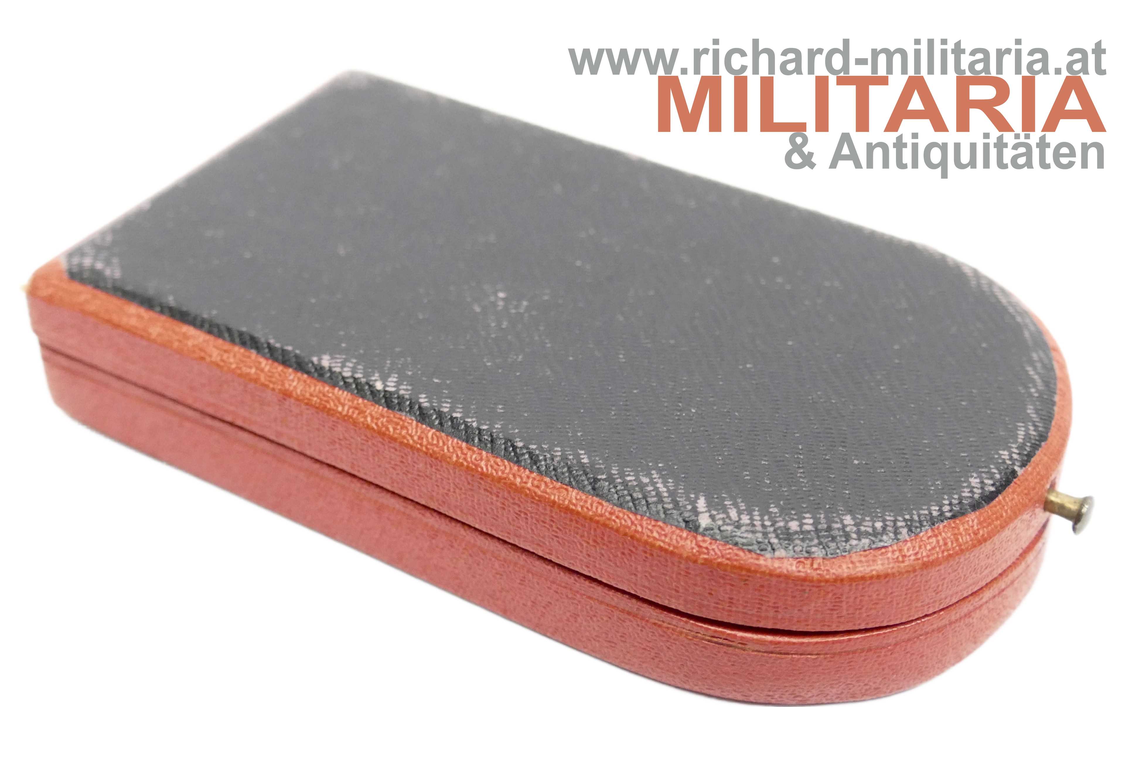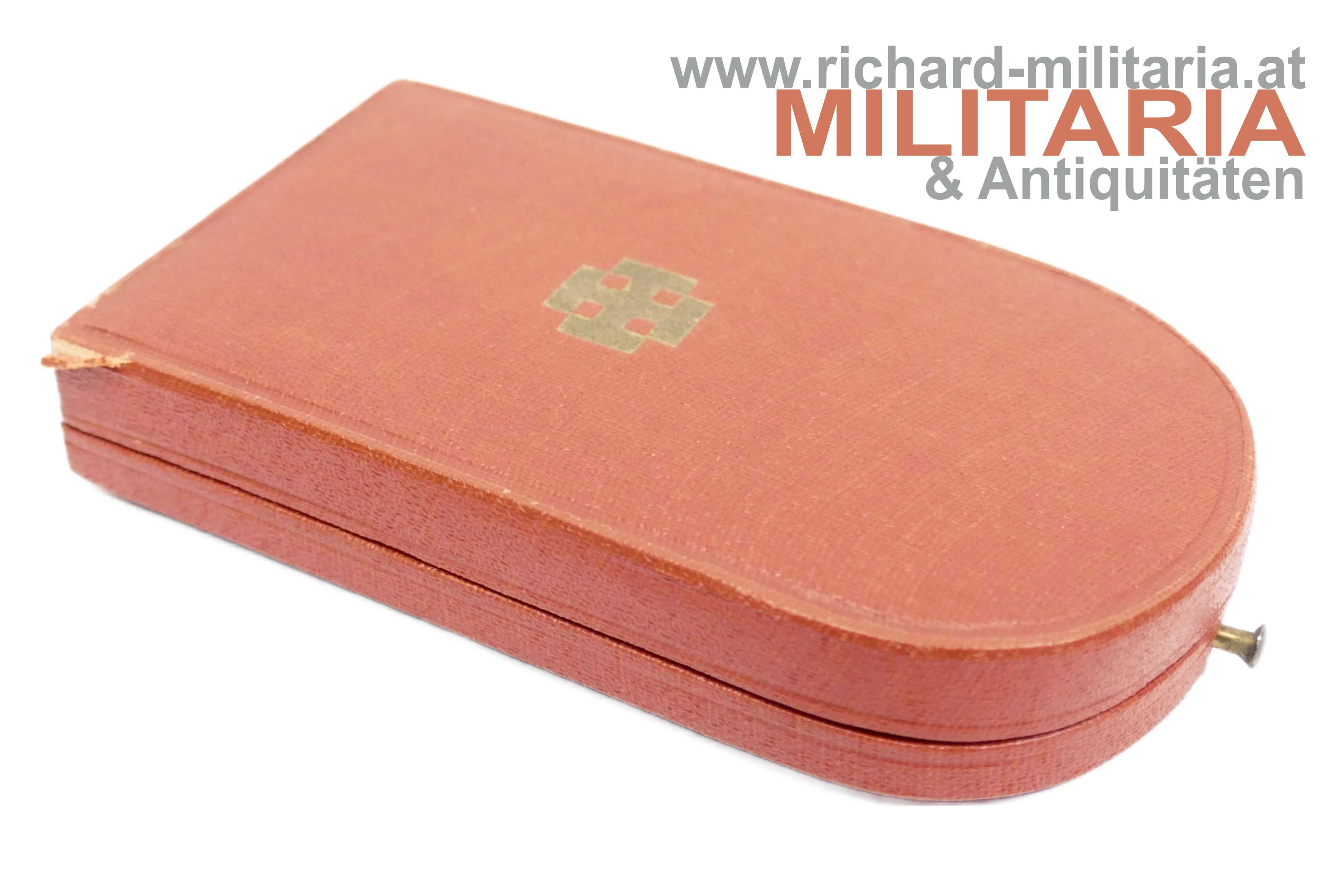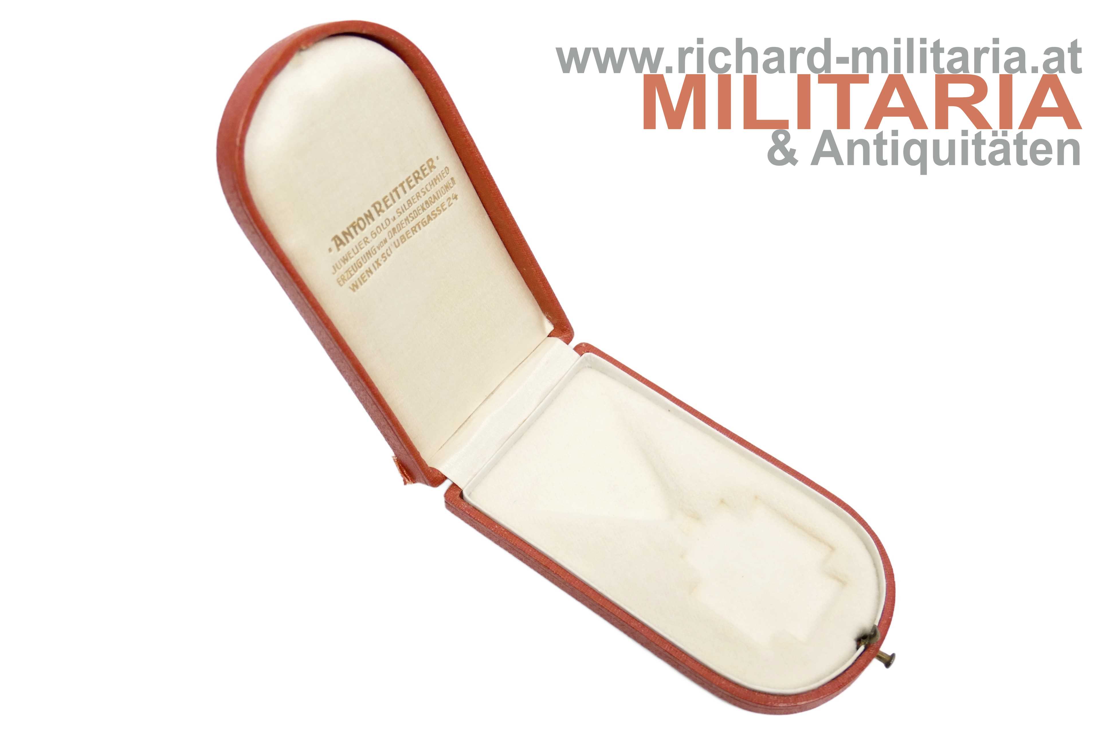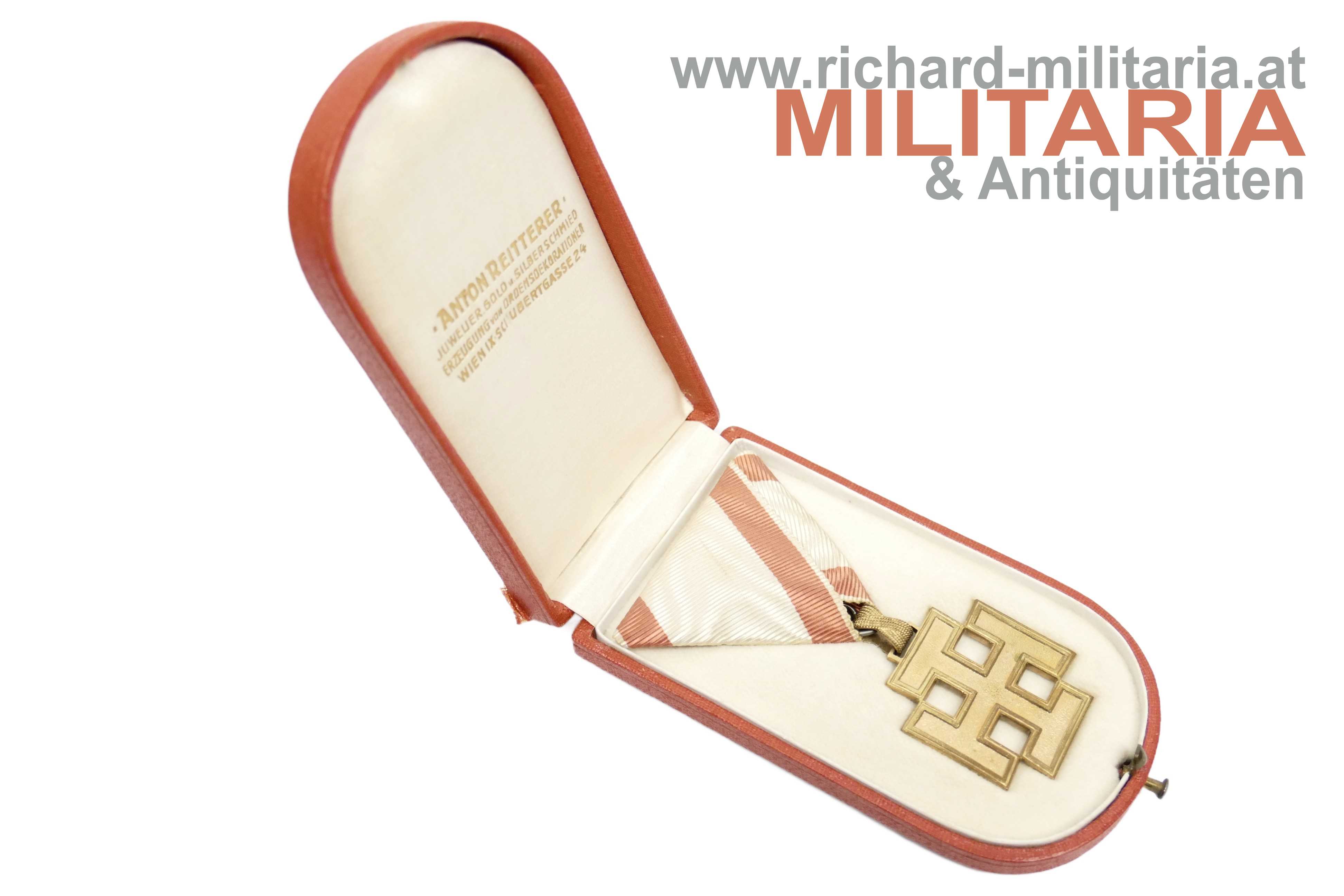 Österreich 1. Republik bzw. Bundesstaat: Goldenes Verdienstzeichen bzw. Goldenes Verdienstkreuz; Tombak; dünne Variante; am originalen Band im originalen Etui von Anton Reitterer mit Goldaufdruck.