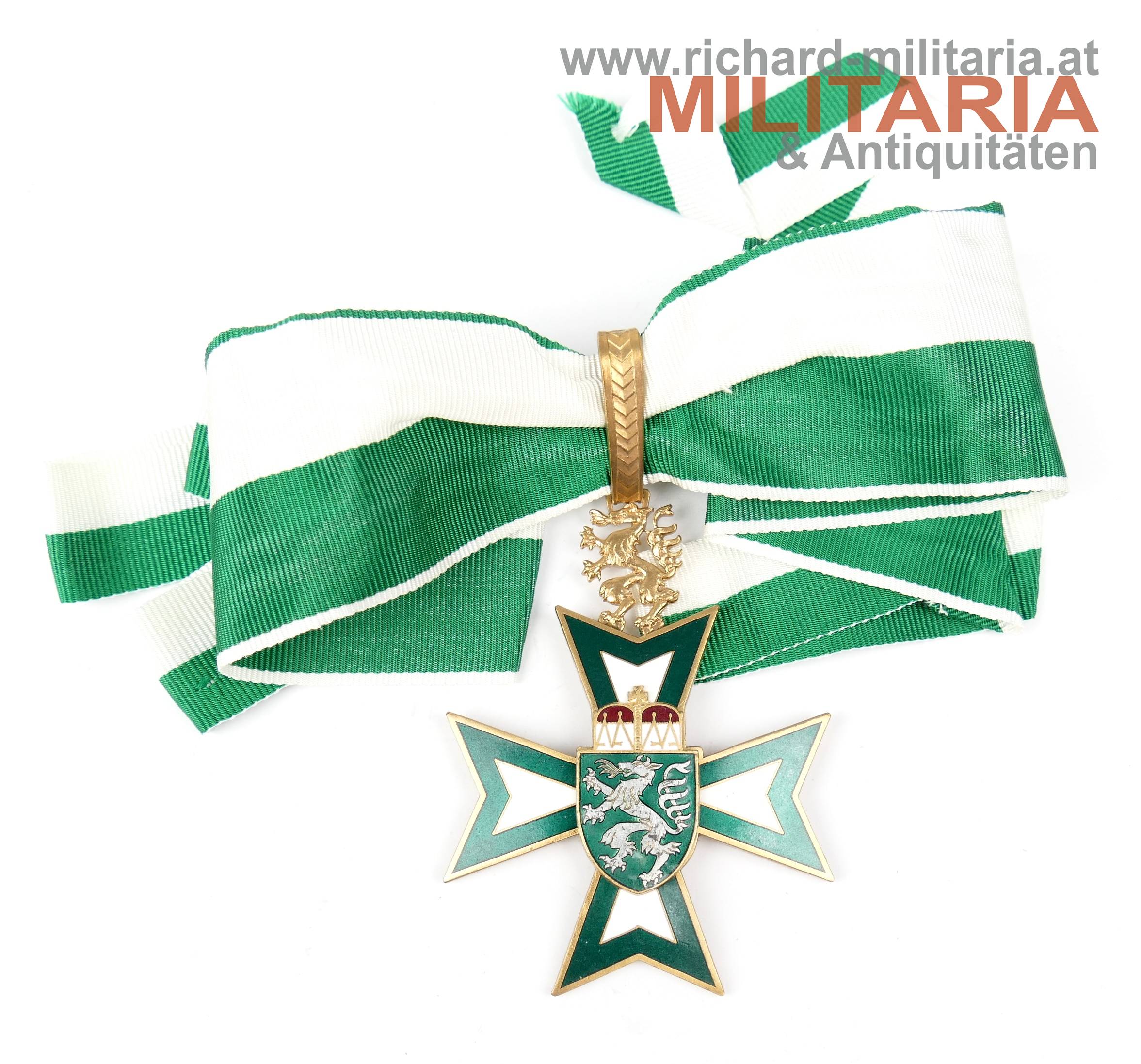Großes Goldenes Ehrenzeichen des Landes Steiermark, Halsdekoration mit langem Band und Rosette, emaillierte und vergoldete Fertigung mit aufgelegtem Wappenschild, ungetragen im originalen Etui - dieses auf der Oberseite etwas zerkratzt;