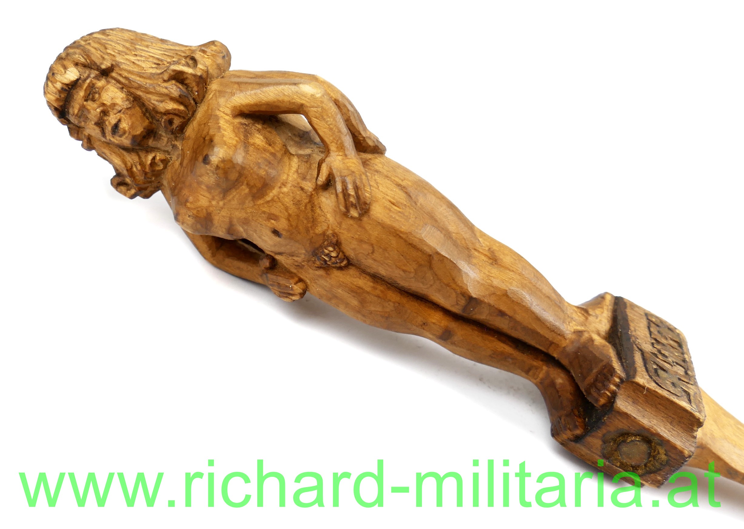 Handgeschnitzter Brieföffner, komplett aus Holz; Griff mit gegengleicher Darstellung zweier nackter Frauen, Klinge am Spitz abgebrochen, aufwendige/stilvolle Schnitzerei, in der Parierstange eingeschnitzte Buchstaben und Ziffern "K 4.VI 39" bzw. Initialen - siehe Bilder;