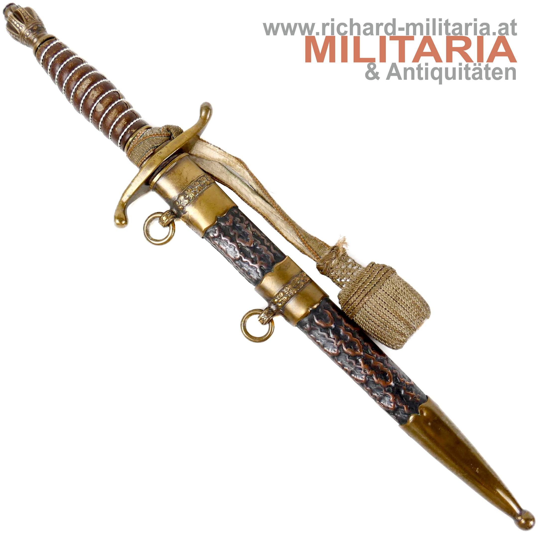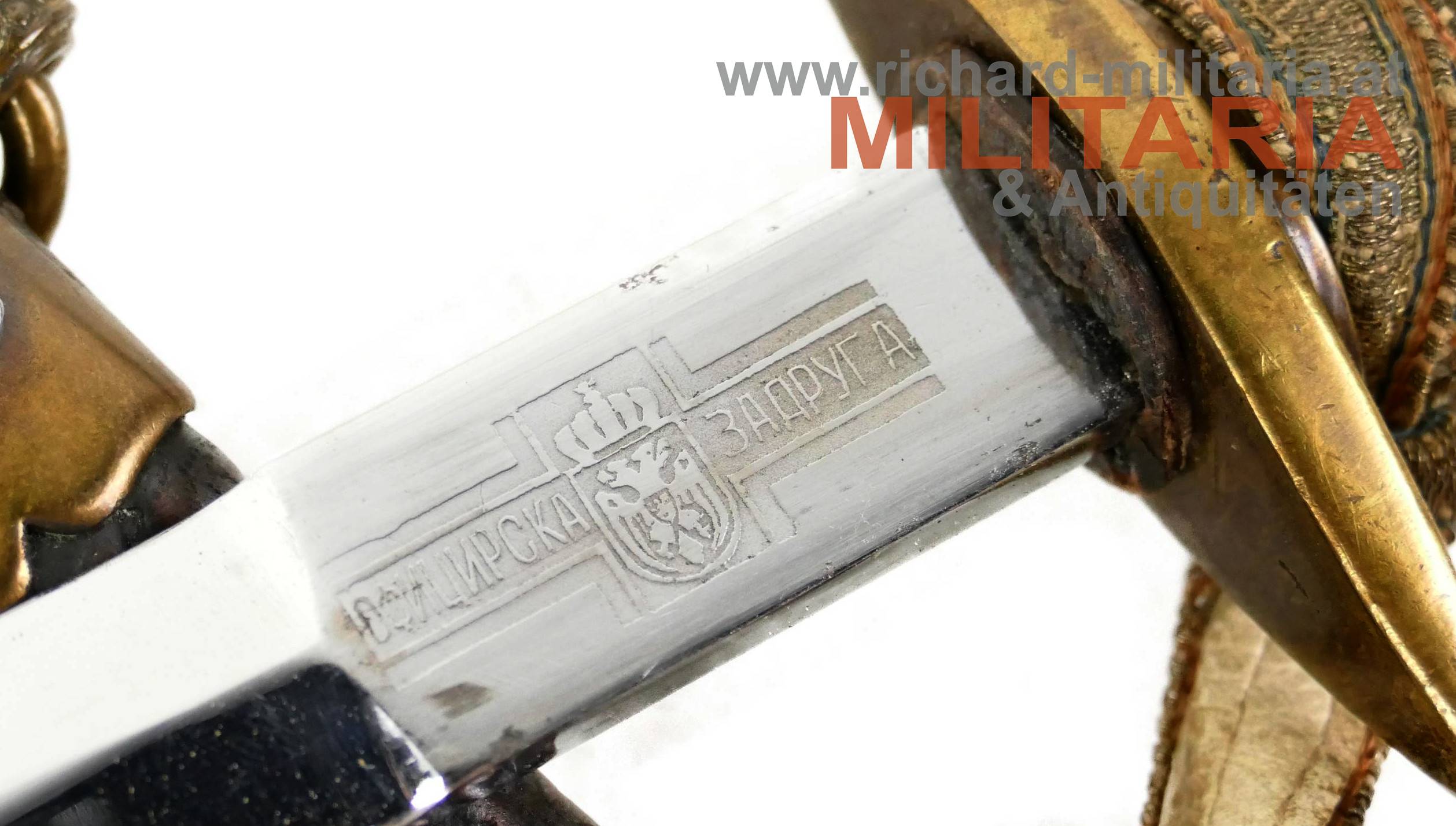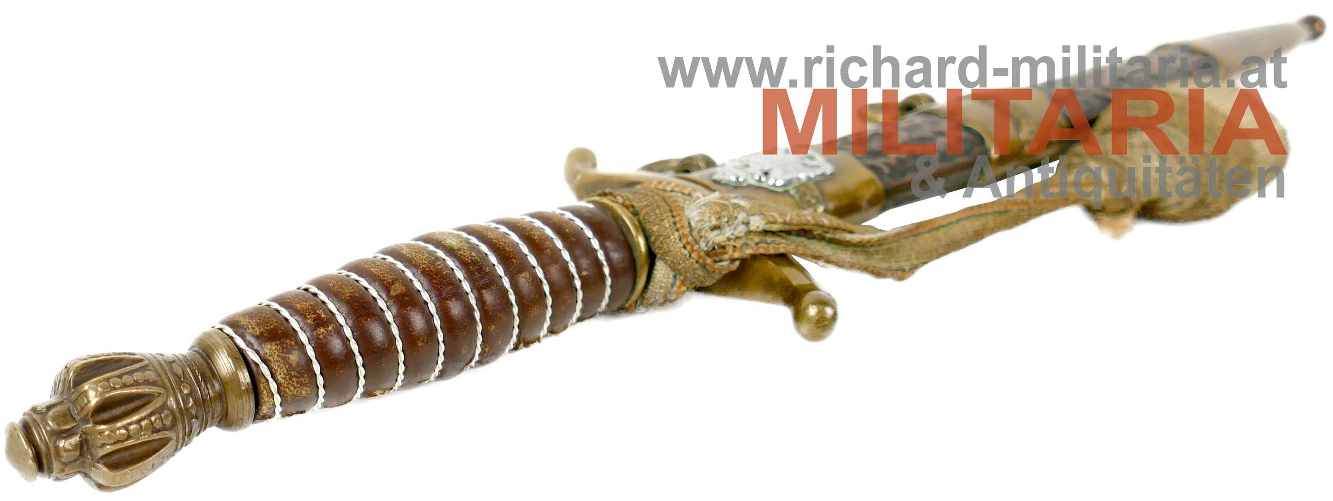 Königreich Jugoslawien - Heeresoffiziersdolch M39; die blanke vernickelte Klinge ist zweischneidig ausgeführt und auf der Vorderseite befindet sich das Jugoslawische Staatswappen: Adler mit Krone geätzt, und auf der gegenüberliegenden Seite Inschrift in kyrillischer Schrift "OFICIRSKA ZADRUGA [ОФИЦИРСКА ЗАДРУГА]" - ebenfalls geätzt; der Holzgriff mit Leder ummantelt und mit zweifacher Drahtwicklung versehen, geschwungene Parierstange aus Messing, der Knauf ebenfalls aus Messing, Scheide mit Eichenlaubdekor und mit aufgelegtem silbernen Emblem; dazugehöriges seltenes Portepee mit Trage-/Gebrauchsspuren - eine Reparaturstelle;