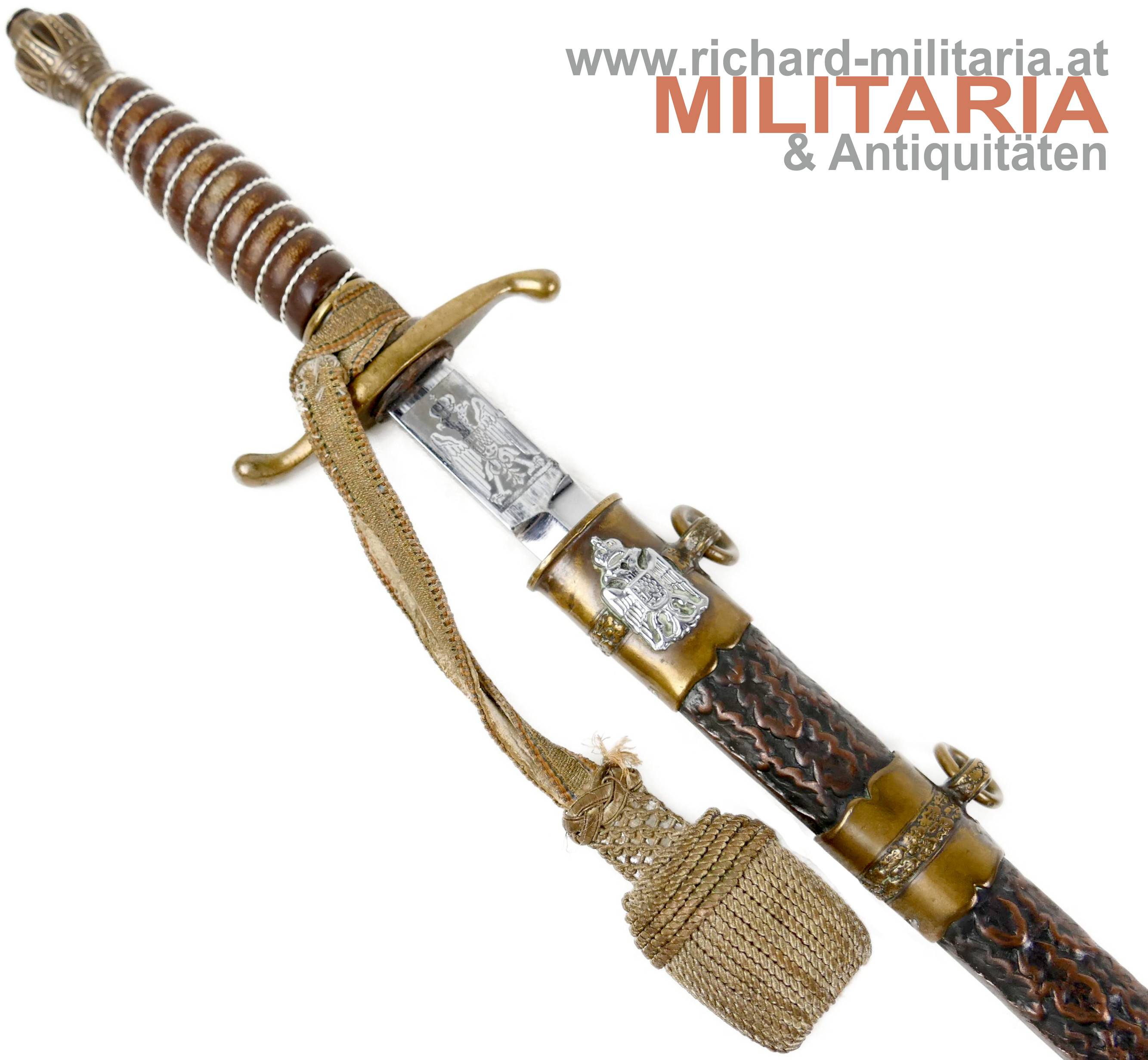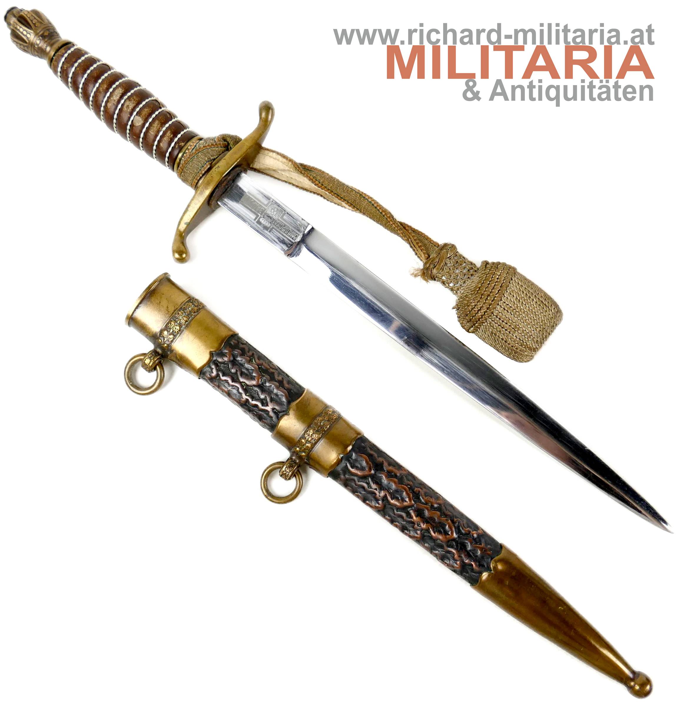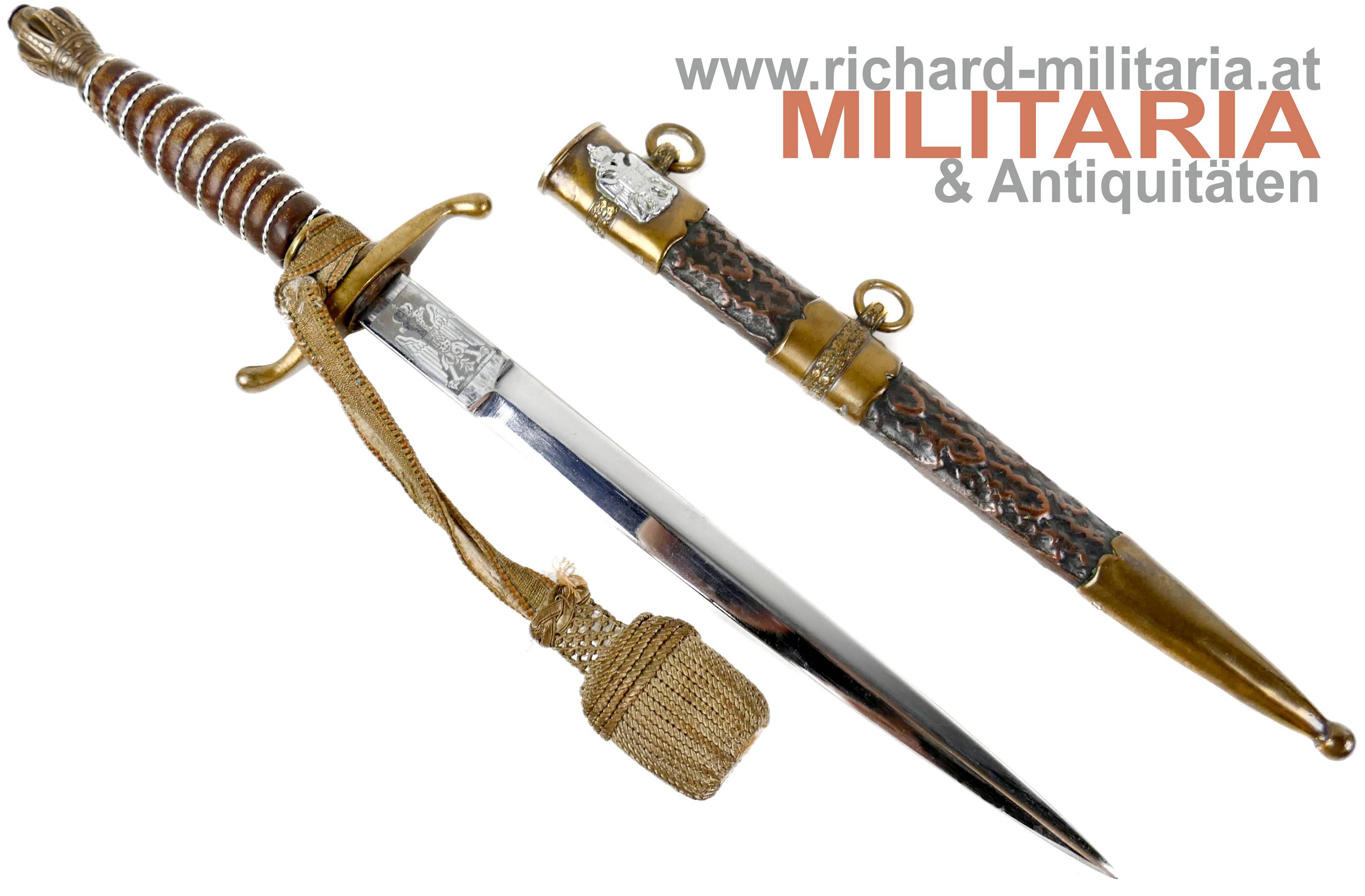 Königreich Jugoslawien - Heeresoffiziersdolch M39; die blanke vernickelte Klinge ist zweischneidig ausgeführt und auf der Vorderseite befindet sich das Jugoslawische Staatswappen: Adler mit Krone geätzt, und auf der gegenüberliegenden Seite Inschrift in kyrillischer Schrift "OFICIRSKA ZADRUGA [ОФИЦИРСКА ЗАДРУГА]" - ebenfalls geätzt; der Holzgriff mit Leder ummantelt und mit zweifacher Drahtwicklung versehen, geschwungene Parierstange aus Messing, der Knauf ebenfalls aus Messing, Scheide mit Eichenlaubdekor und mit aufgelegtem silbernen Emblem; dazugehöriges seltenes Portepee mit Trage-/Gebrauchsspuren - eine Reparaturstelle;