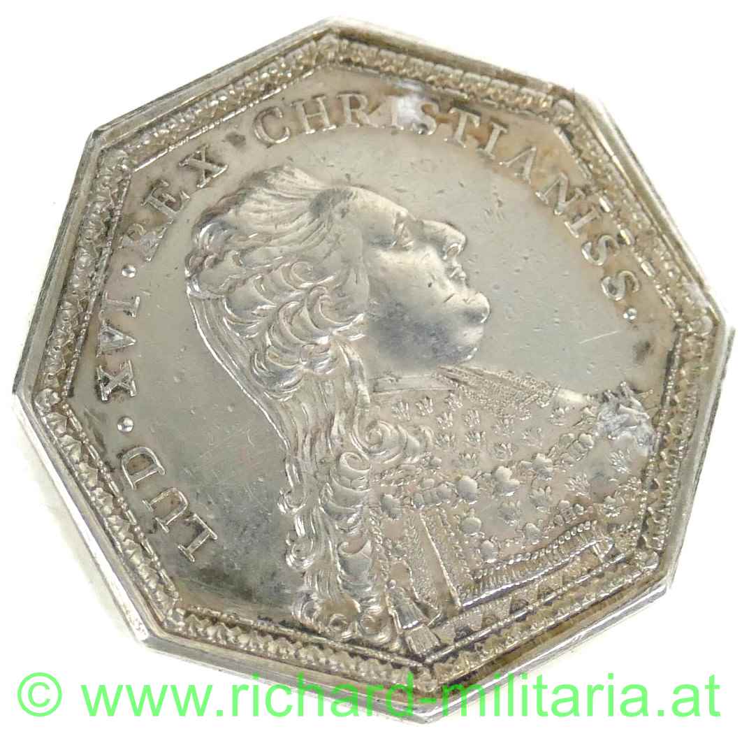 Heiliger-Geist-Orden - achteckige Medaille - Silber, Ludwig XVI. nach rechts im Ordensmantel, nicht signiert "LUD. XVI. REX CHRISTIANISS.", Rückseite mit der Taube auf Glorien, gegürtet mit der Ordenskette und Umschrift "ORDRE ET MILICE DU SAINT ESPRIT", DM: 36 mm