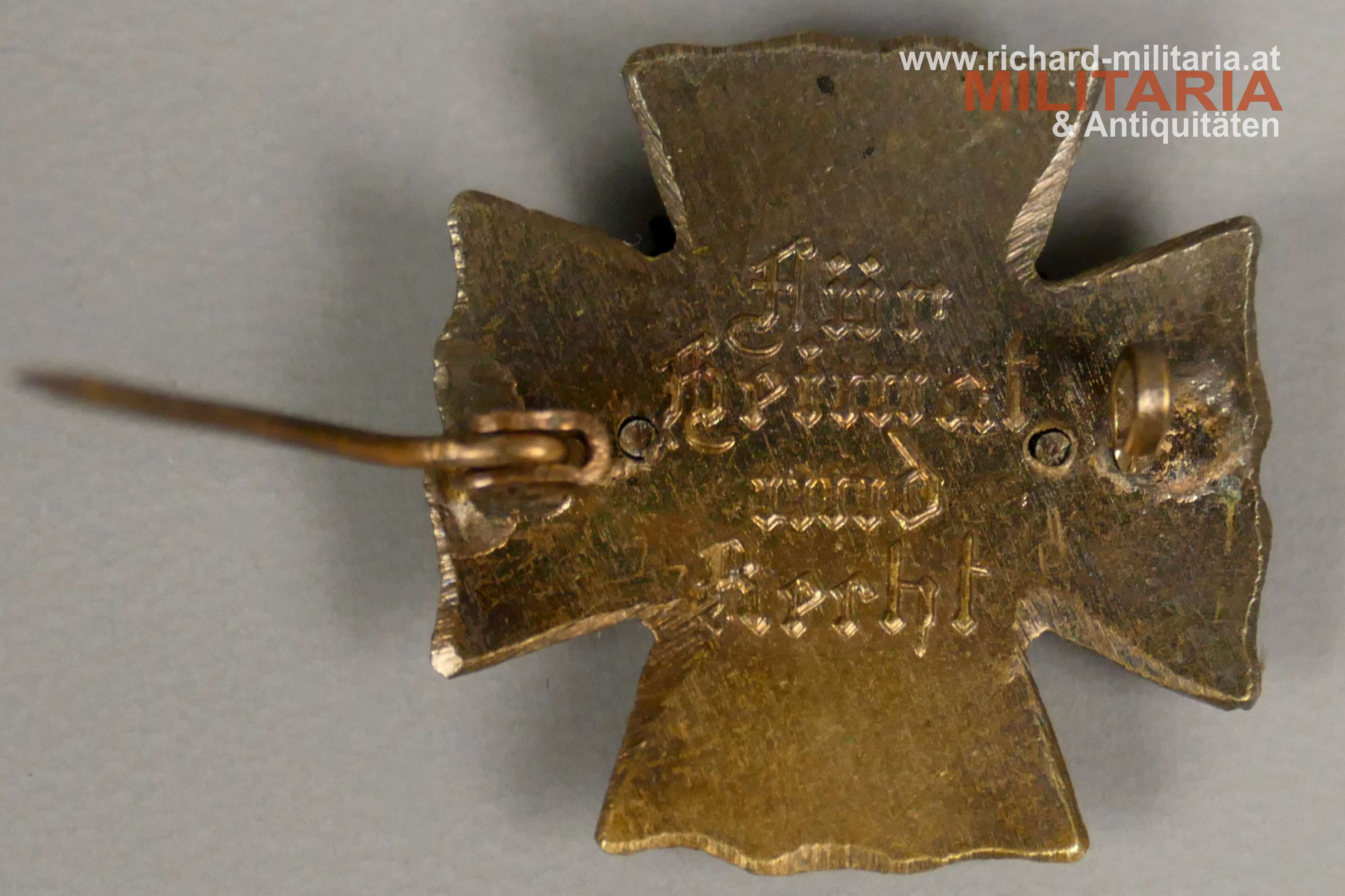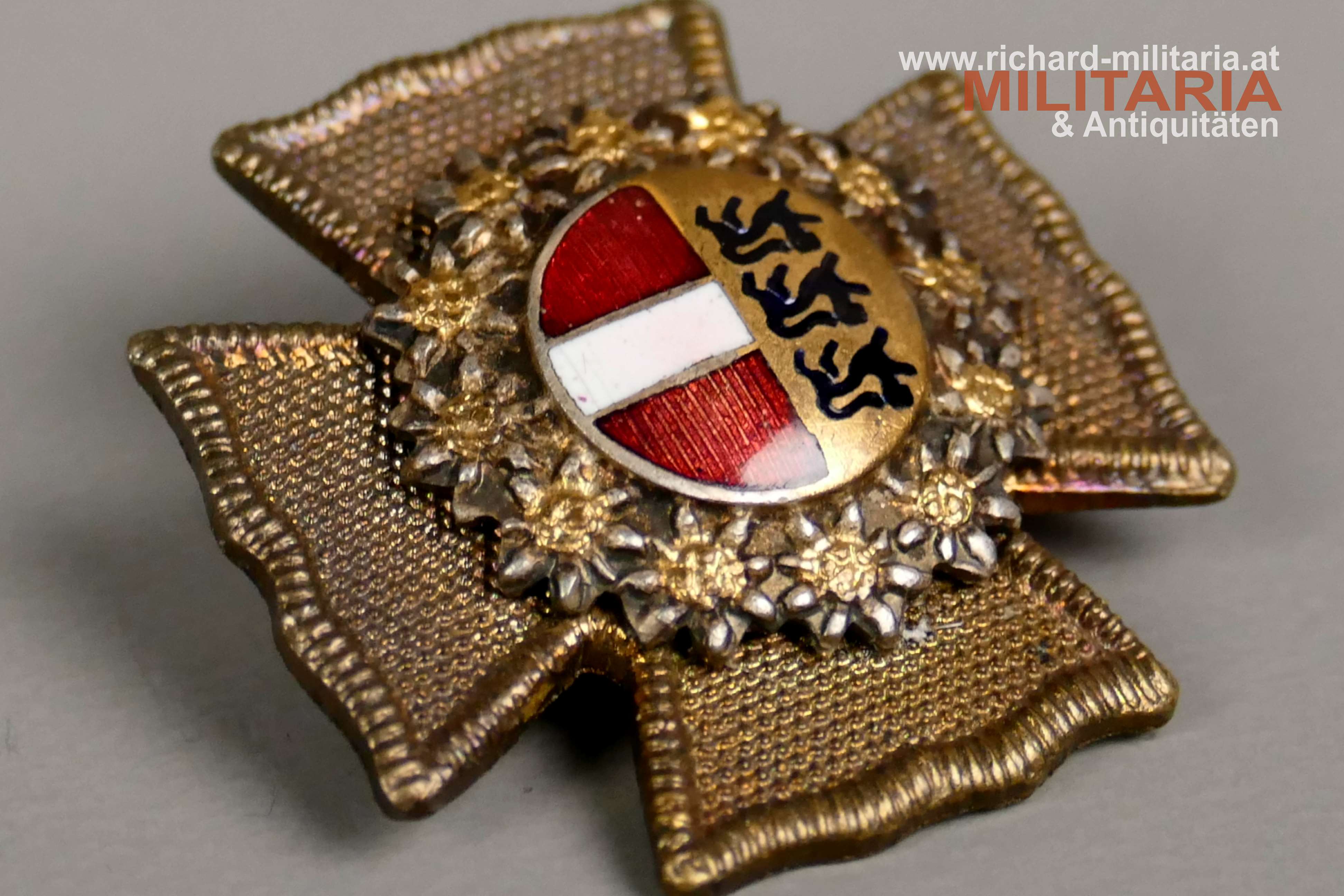 Heimwehr Kärnten - Mitgliedsabzeichen, Tombak versilbert/vergoldet teilweise emailliert, 2-teilige Fertigung, mitgeprägter Leitspruch auf der Rückseite: "Für Heimat und Recht", originales Nadelsystem;