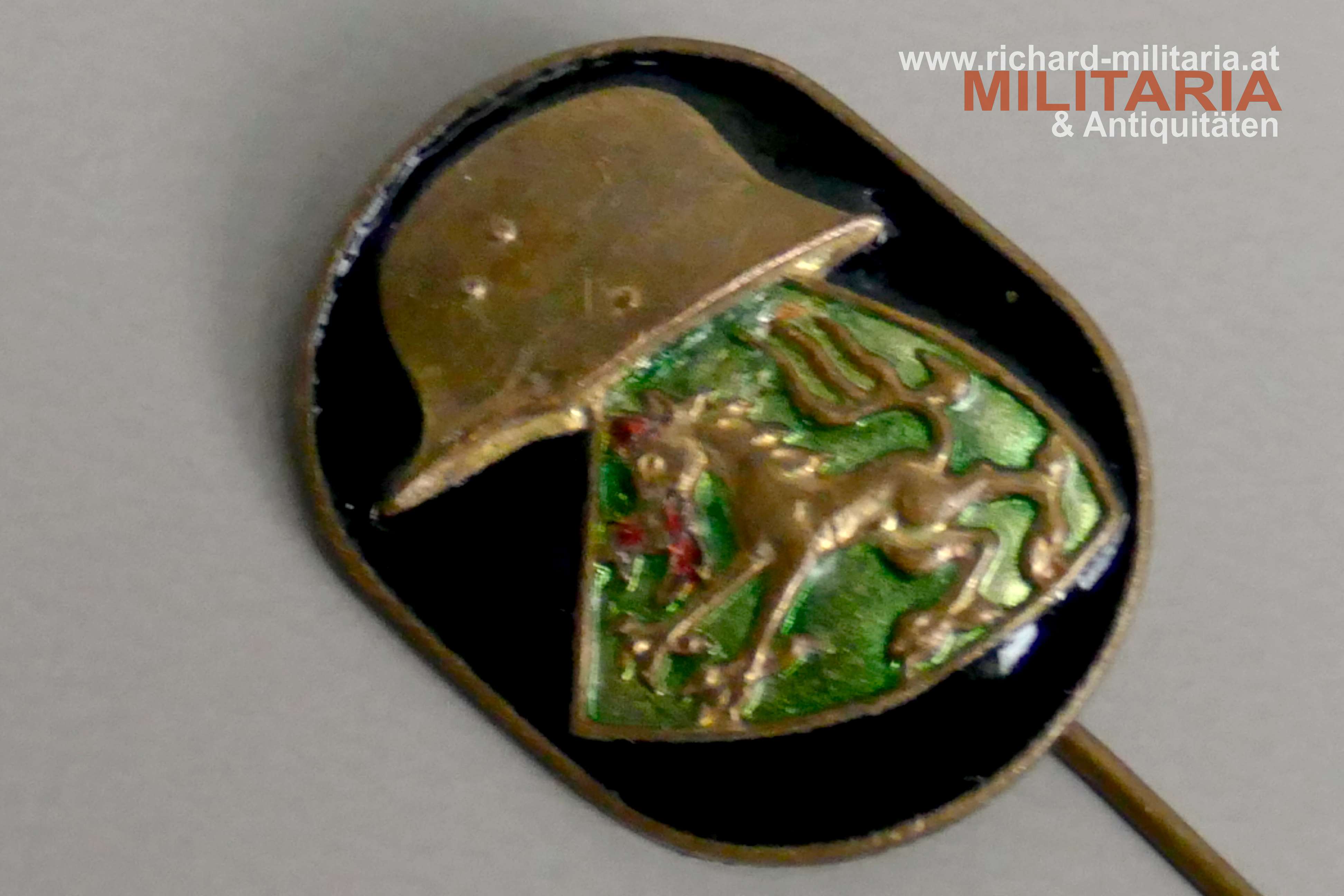 Heimwehr Steiermark Mitgliedsabzeichen - Variante mit langer Nadel, Buntmetall emailliert, originale lange Tragenadel, Herstellerstempel: "Schwertner, Graz" Abmessungen ca.: 24 x 18 mm;