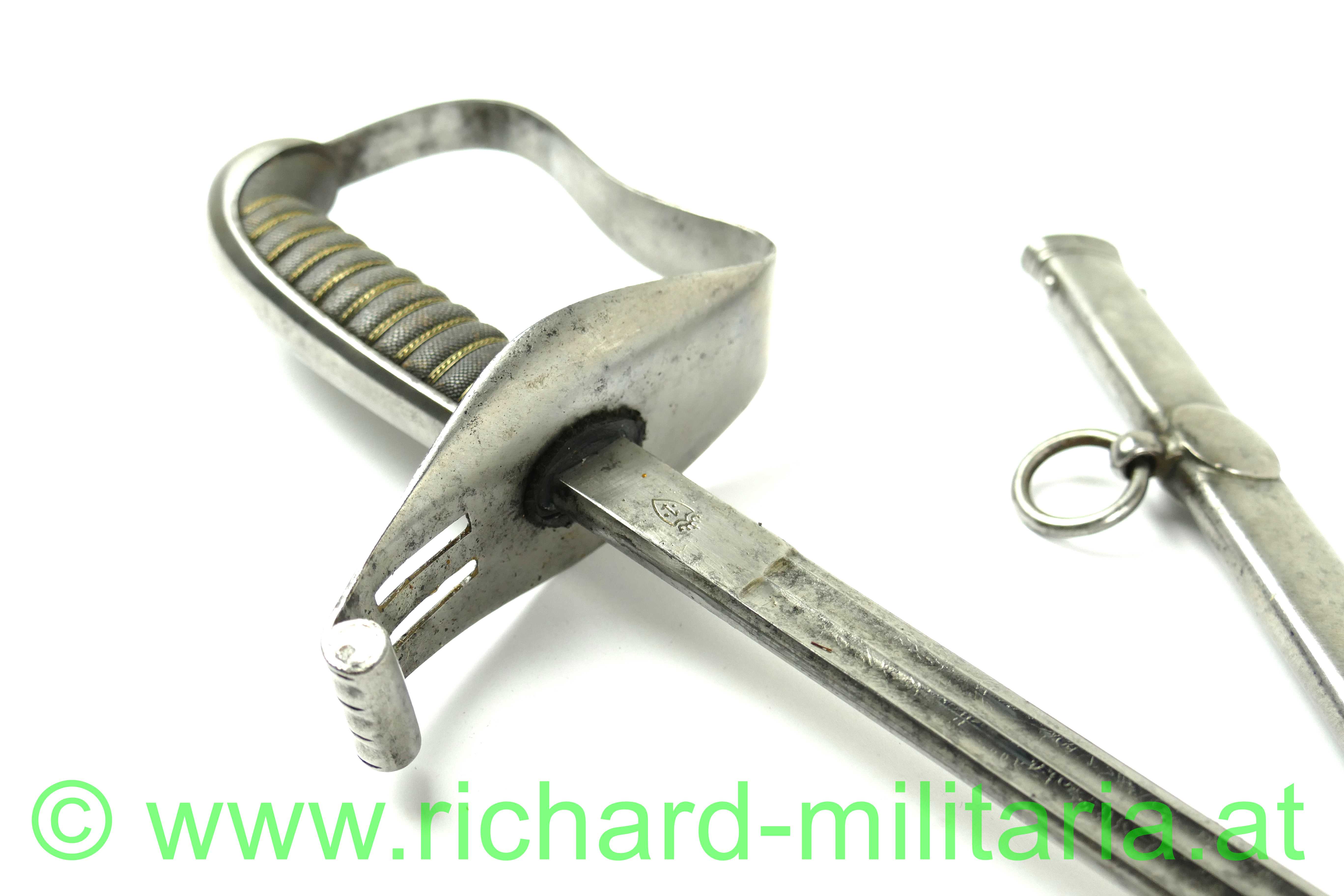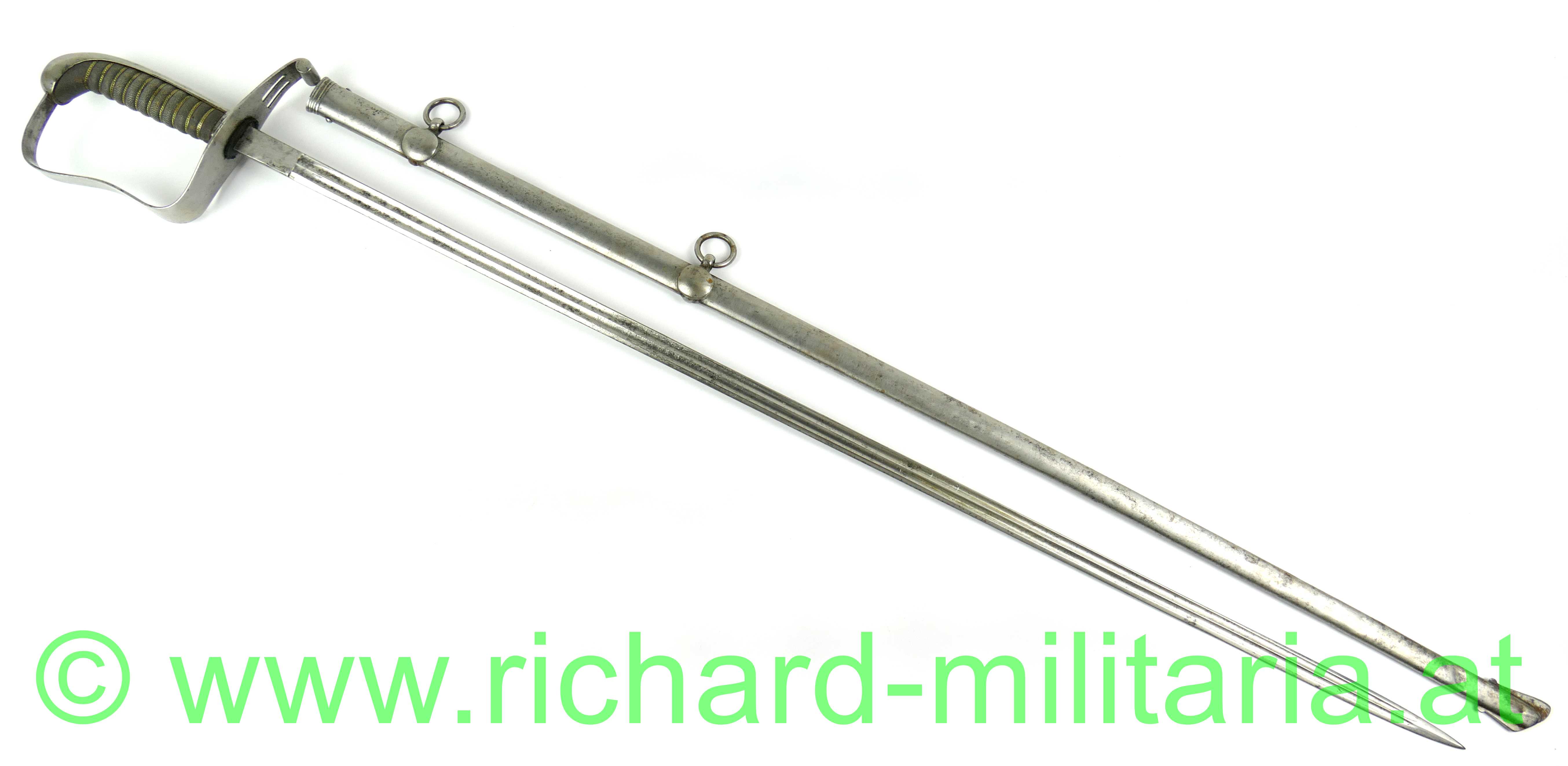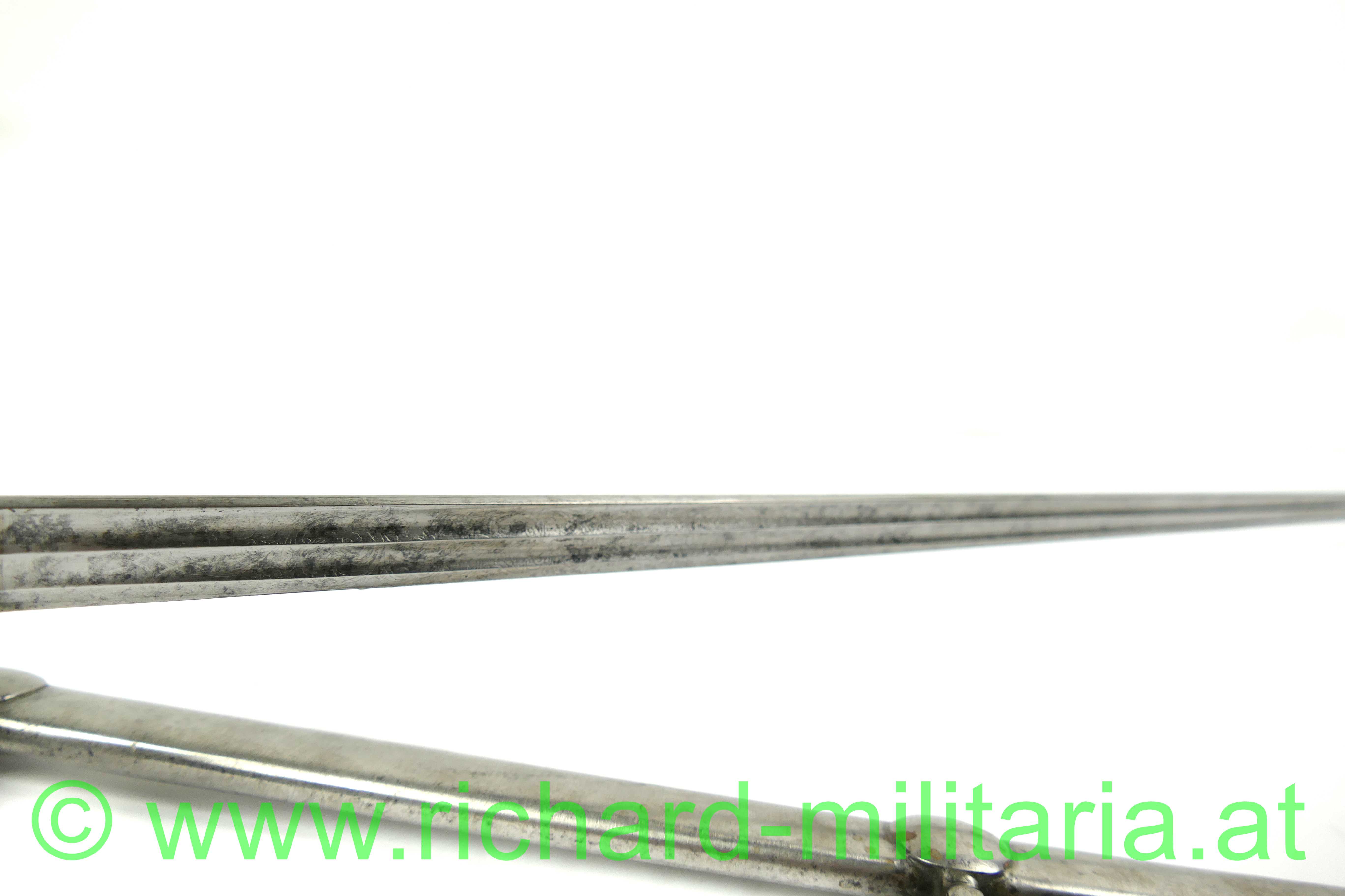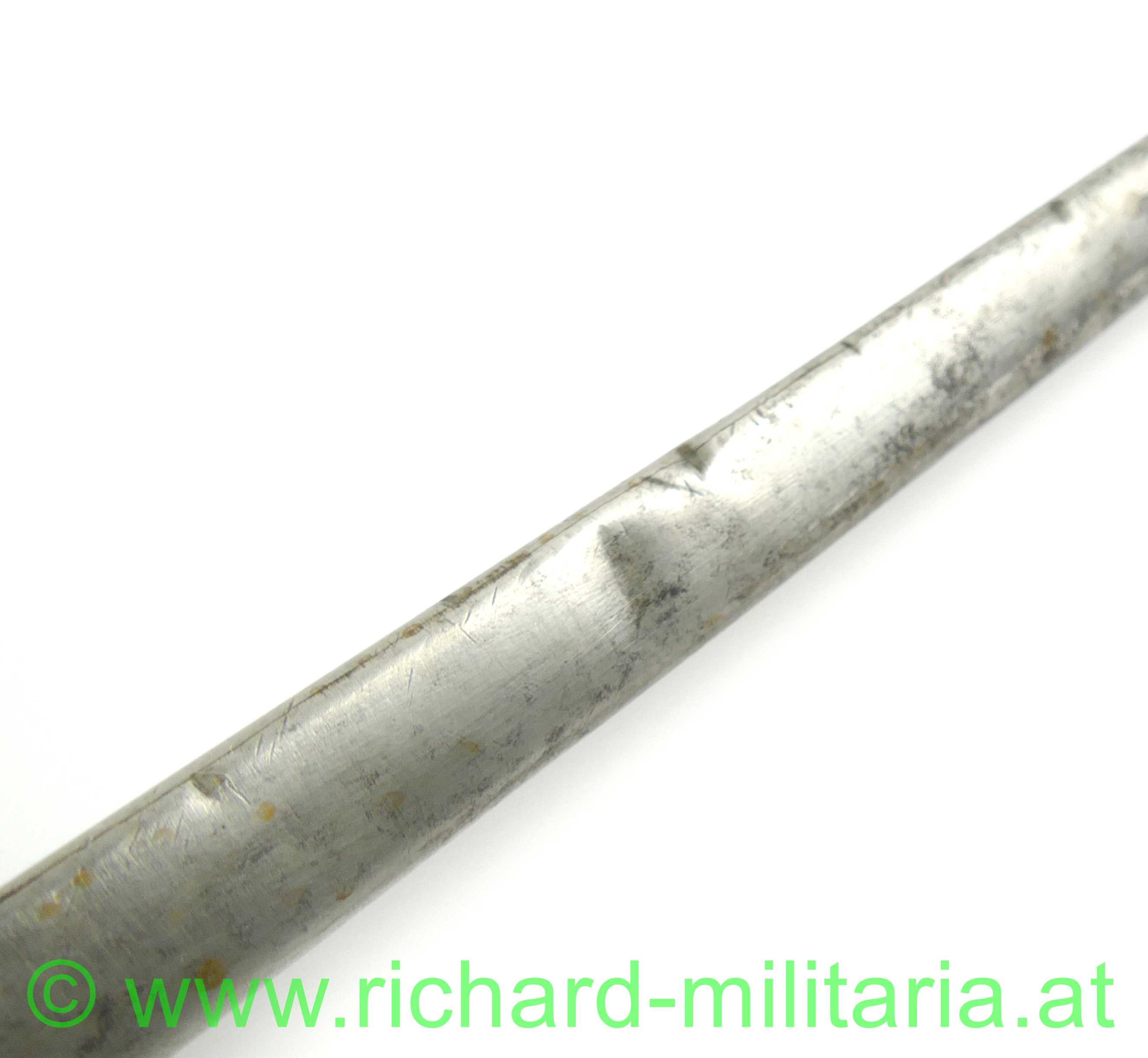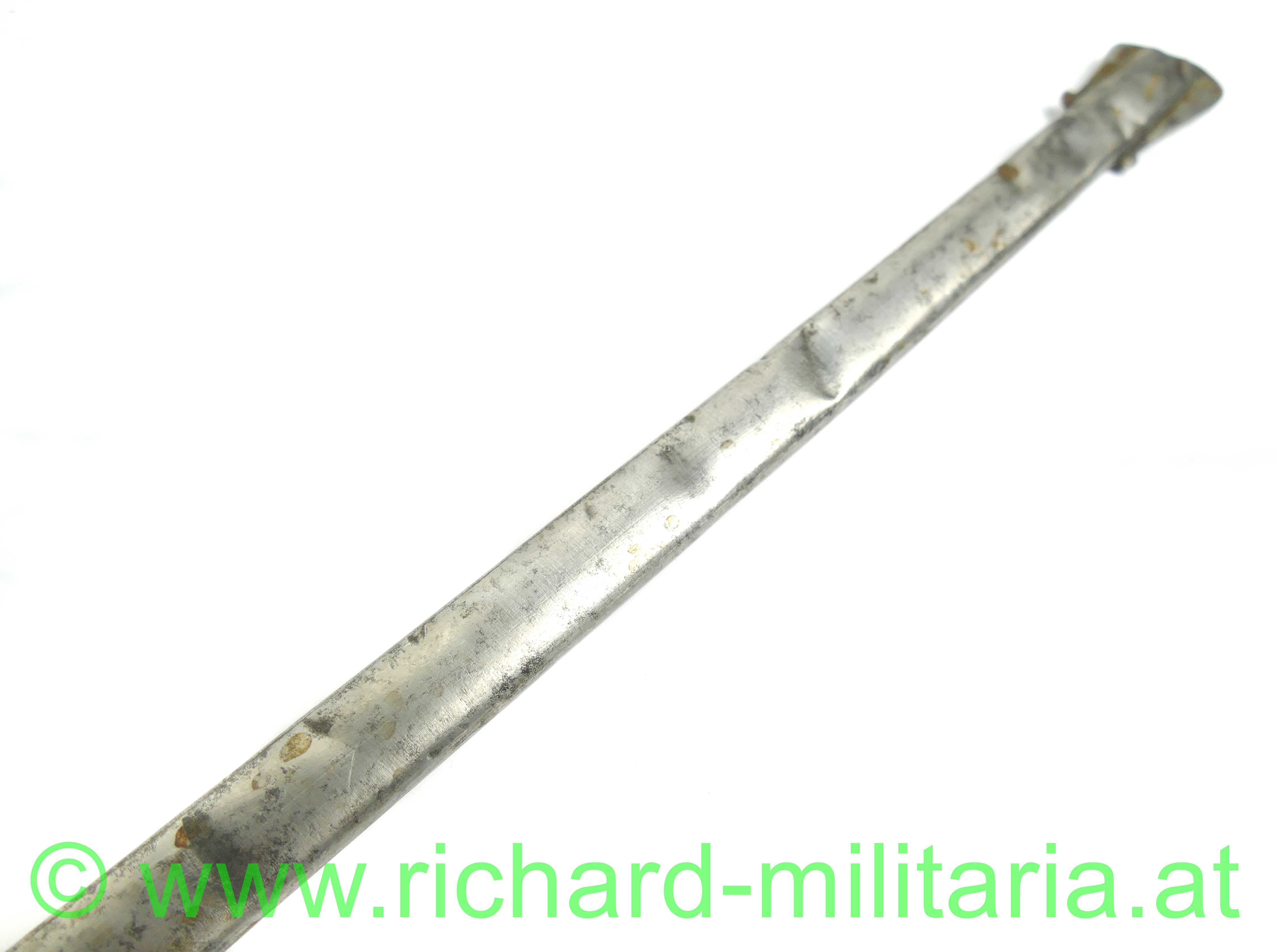 Infanterie-Offizierssäbel Muster 1850 mit außergewöhnlicher Klinge; beidseitig doppelt gekehlte gerade Klinge (Breite: 18mm) und an der Spitze zweischneidig; Klinge mit Herstellerstempel: "Jung", im oberen Drittel ist die Klinge mit Zierätzungen versehen - ebenfalls am Klingenrücken; Klinge und Scheide gereinigt/gebürstet, einfaches festsitzendes Bügelgefäß auf der linken Seite etwas mehr aufgebogen, Holzgriff überzogen mit Fischhaut und 3-teiliger Messingdrahtwicklung; einfacher Abschluss am Knauf; originale dazugehörige Scheide mit deutlichen Tragespuren und mehreren Dellen - Schleifeisen durchs Tragen komplett schräg abgewetzt - Scheide somit unten etwas offen (!); extrem feine Ausführung;