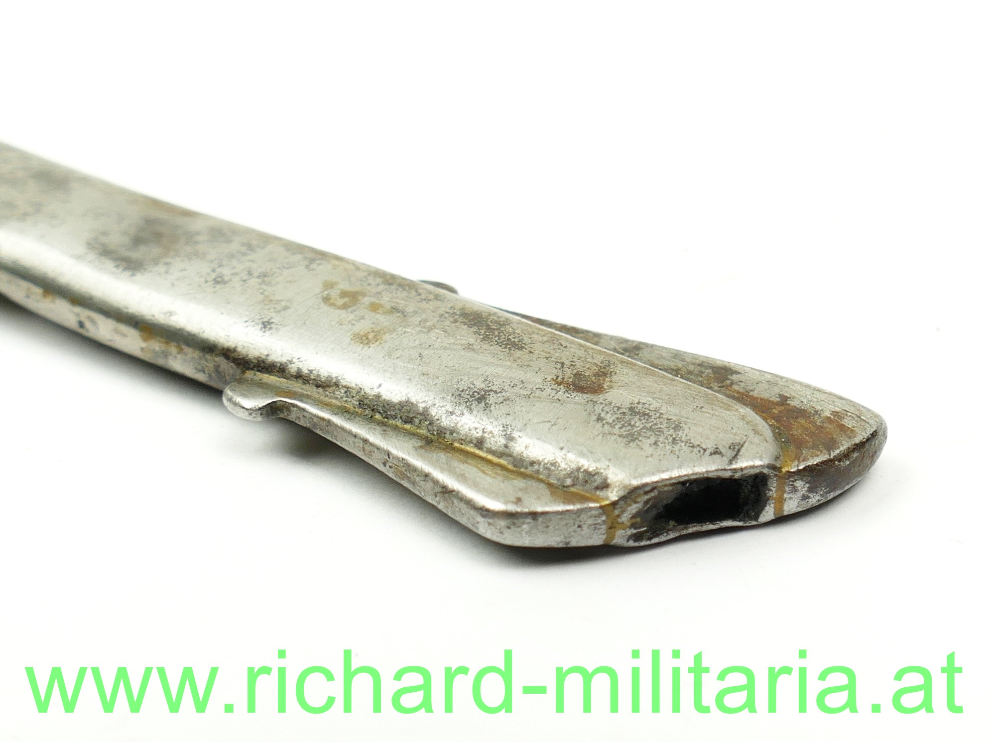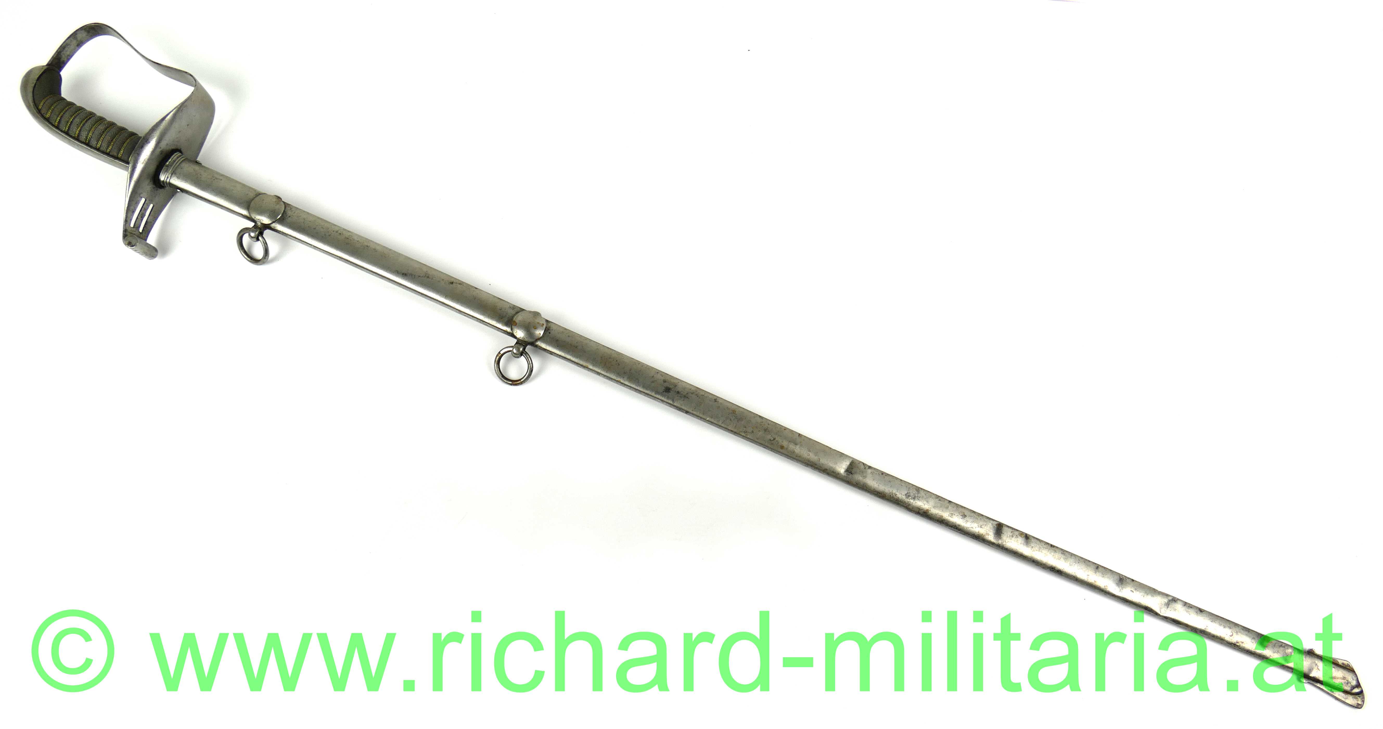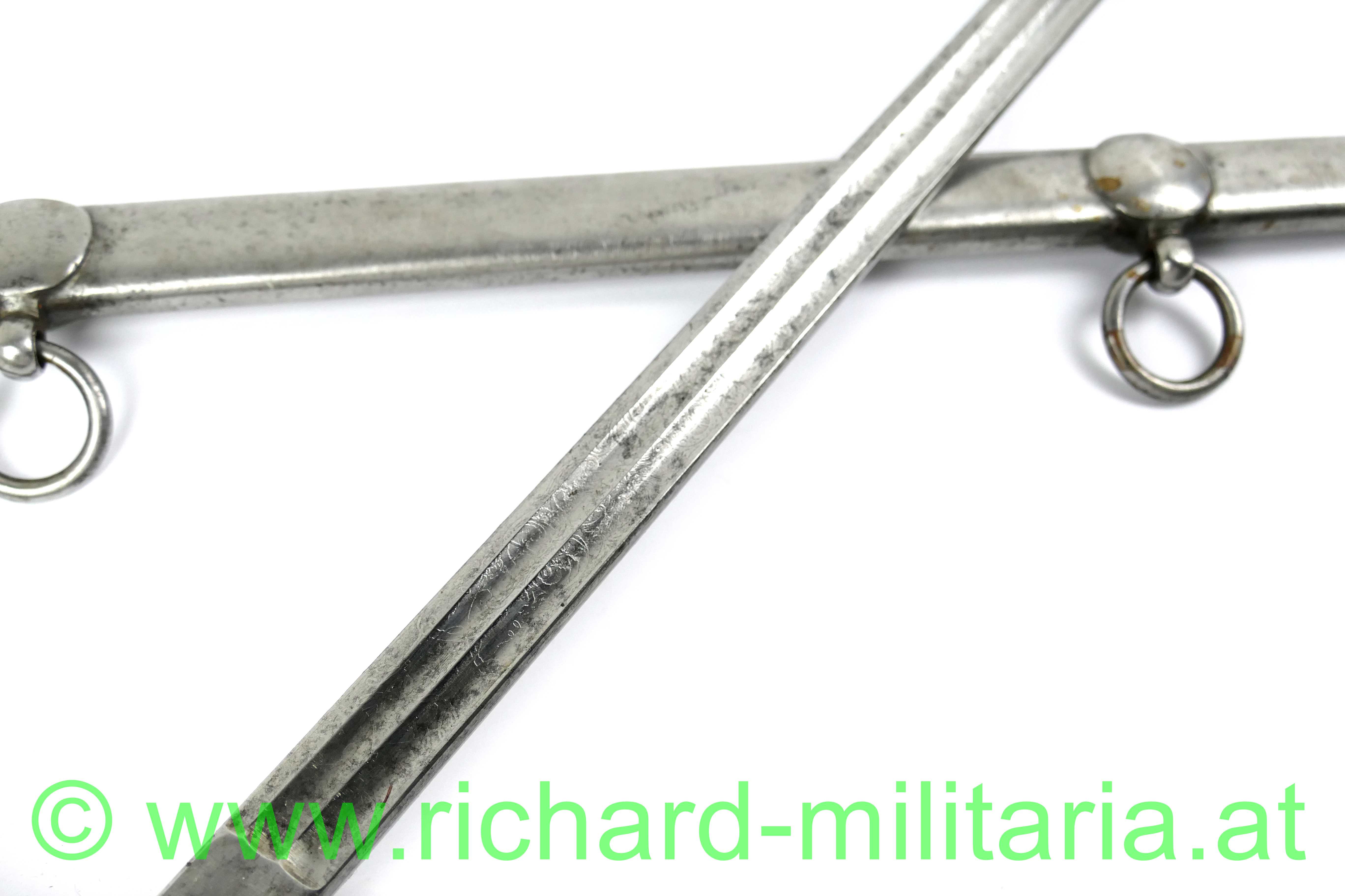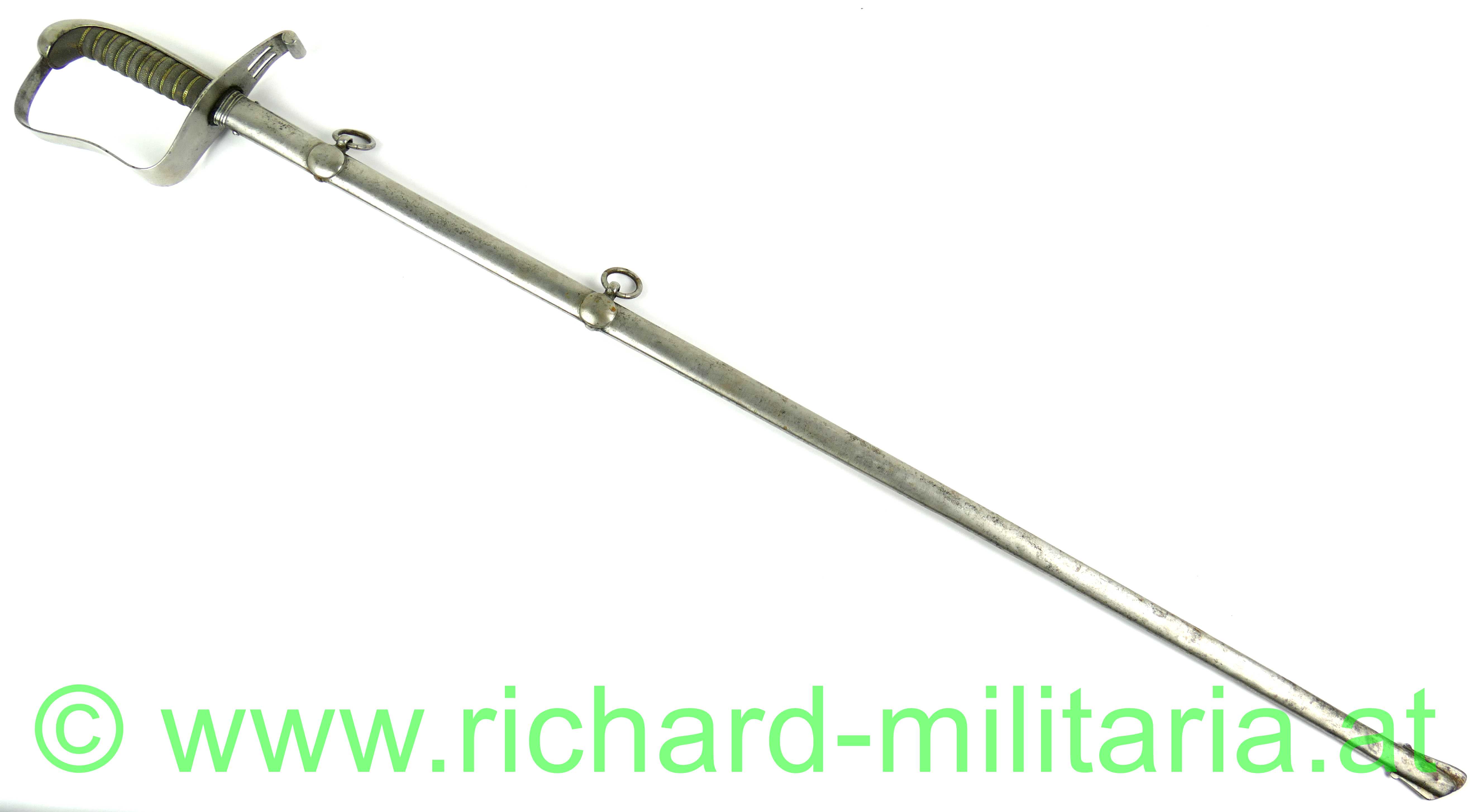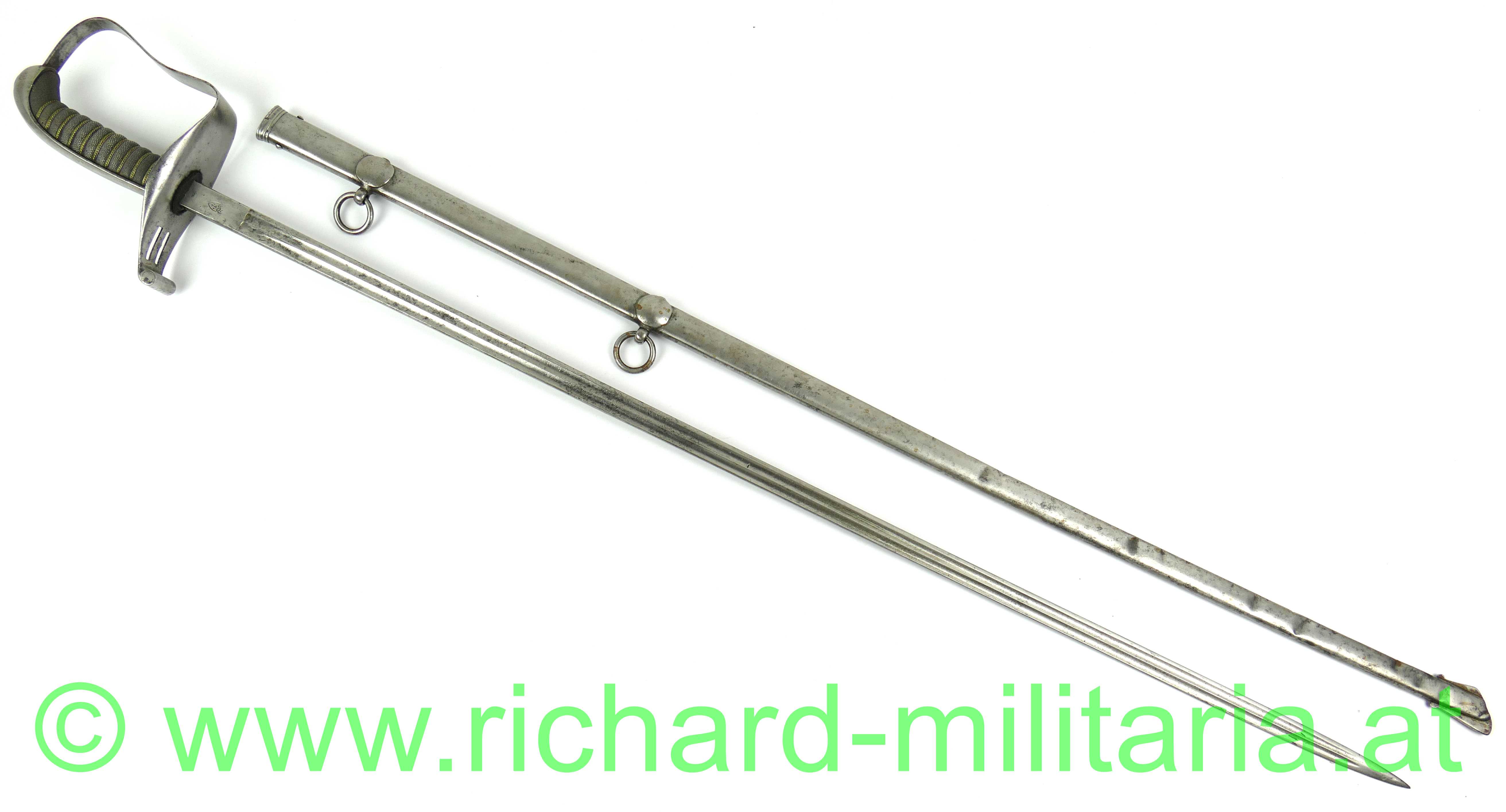 Infanterie-Offizierssäbel Muster 1850 mit außergewöhnlicher Klinge; beidseitig doppelt gekehlte gerade Klinge (Breite: 18mm) und an der Spitze zweischneidig; Klinge mit Herstellerstempel: "Jung", im oberen Drittel ist die Klinge mit Zierätzungen versehen - ebenfalls am Klingenrücken; Klinge und Scheide gereinigt/gebürstet, einfaches festsitzendes Bügelgefäß auf der linken Seite etwas mehr aufgebogen, Holzgriff überzogen mit Fischhaut und 3-teiliger Messingdrahtwicklung; einfacher Abschluss am Knauf; originale dazugehörige Scheide mit deutlichen Tragespuren und mehreren Dellen - Schleifeisen durchs Tragen komplett schräg abgewetzt - Scheide somit unten etwas offen (!); extrem feine Ausführung;
