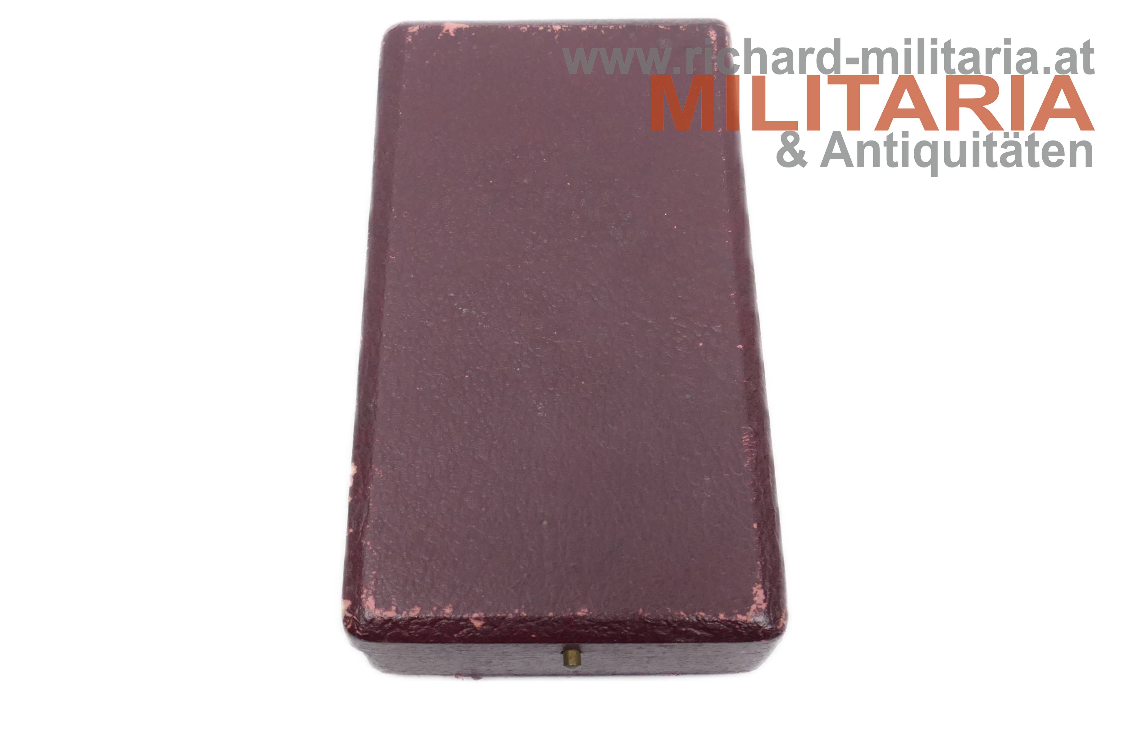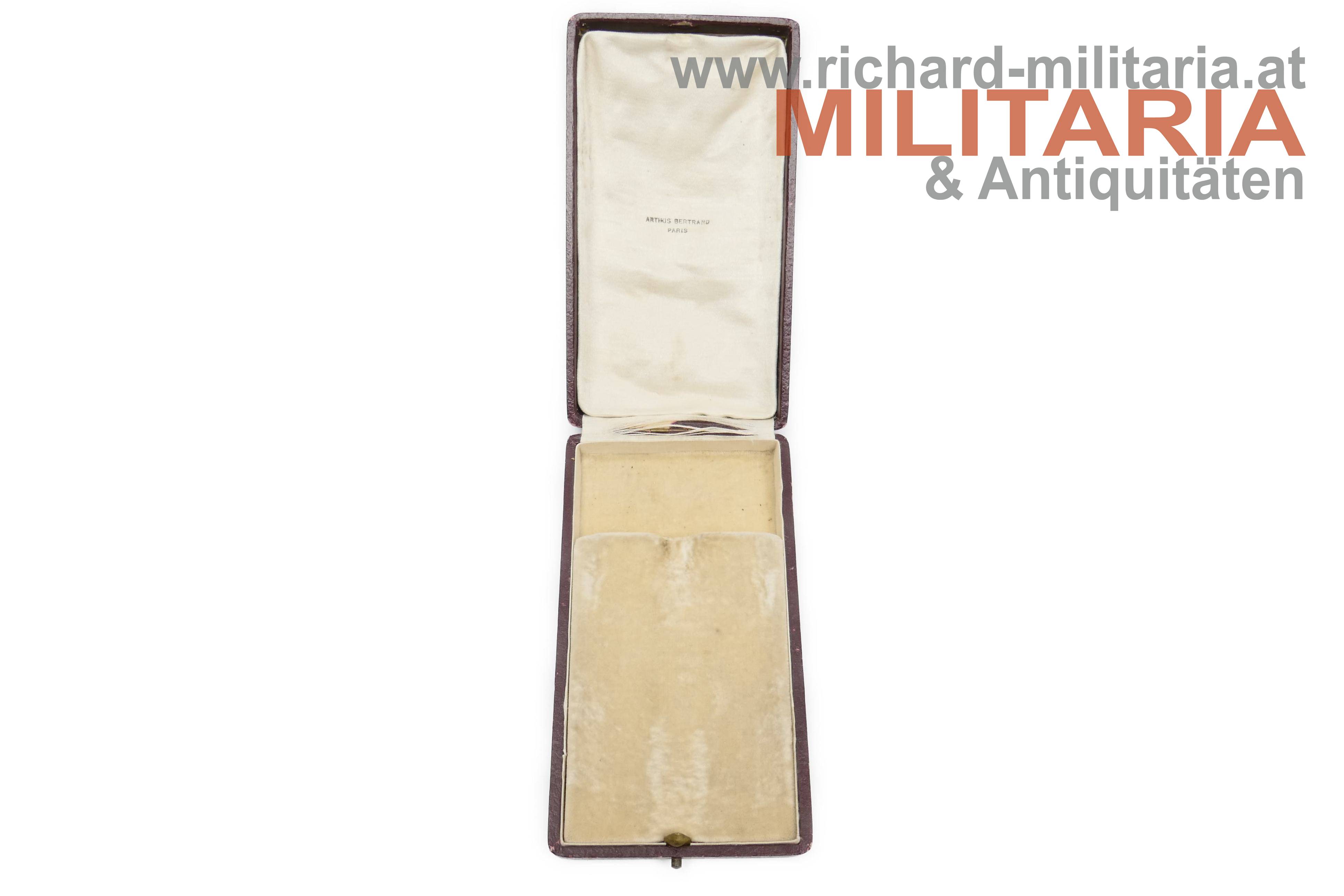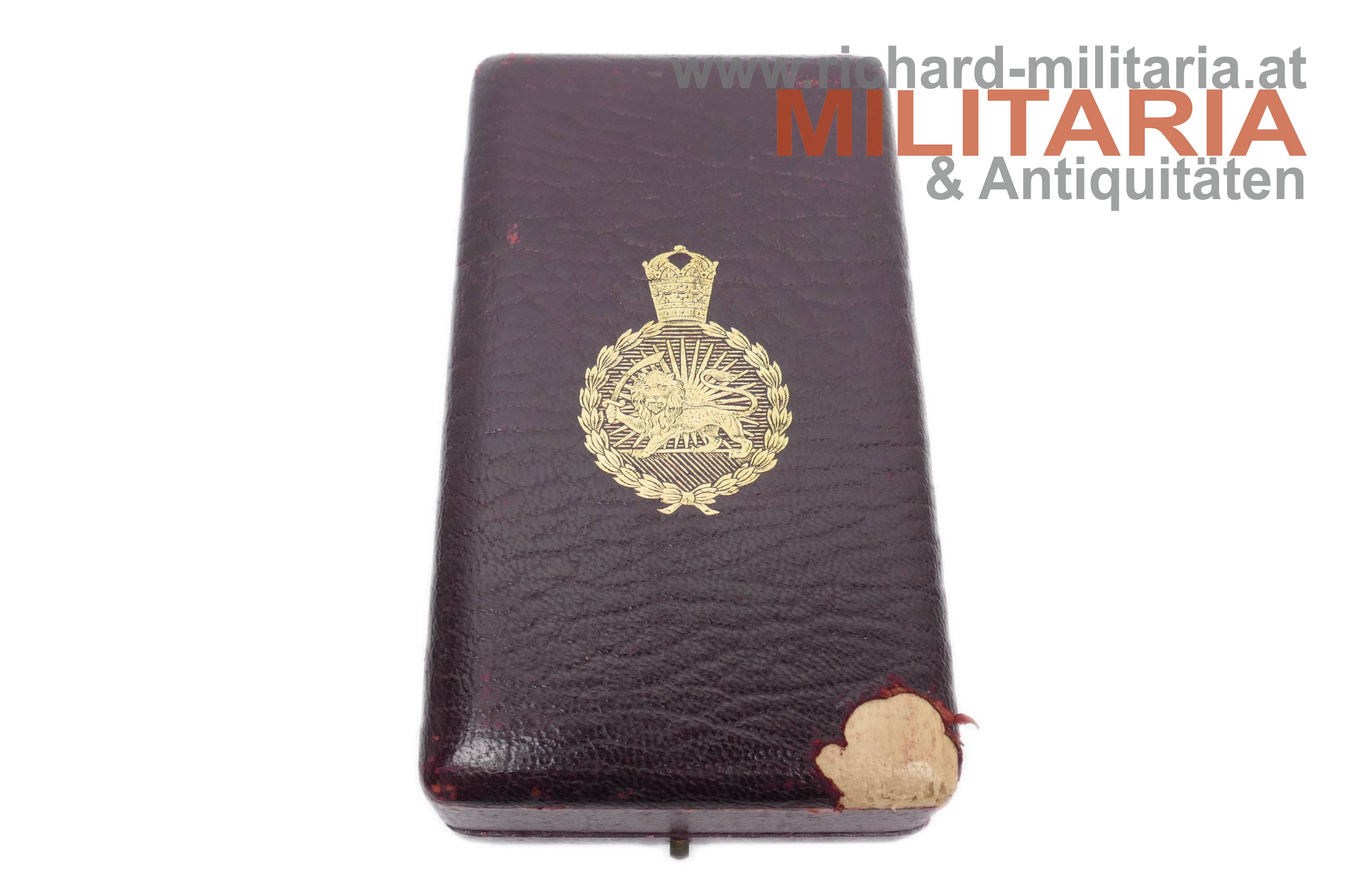 Iran - Homayoun-Orden Kommandeurkreuz (3. Klasse) - Sonnen-und Löwenorden; Silber emailliert; Emaillierung einwandfrei; revers der Hersteller "Arthus Bertrand Paris"; am originalen zugehörigen Band; rotes Etui in Lederoptik; vorne rechts mit einer Fehlstelle im Etuibezug; innen am Etuideckel der Hersteller "Arthus Bertrand Paris";
