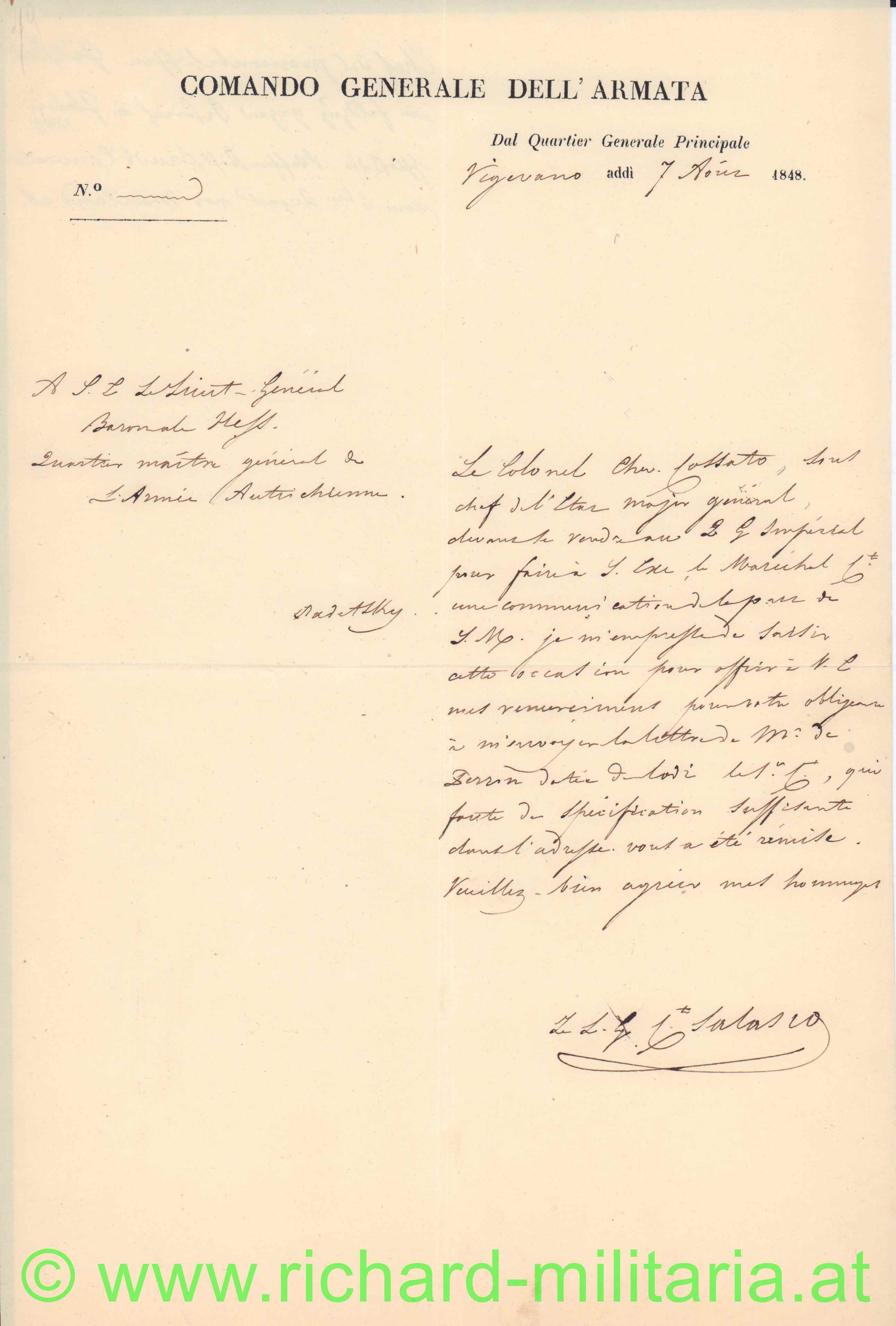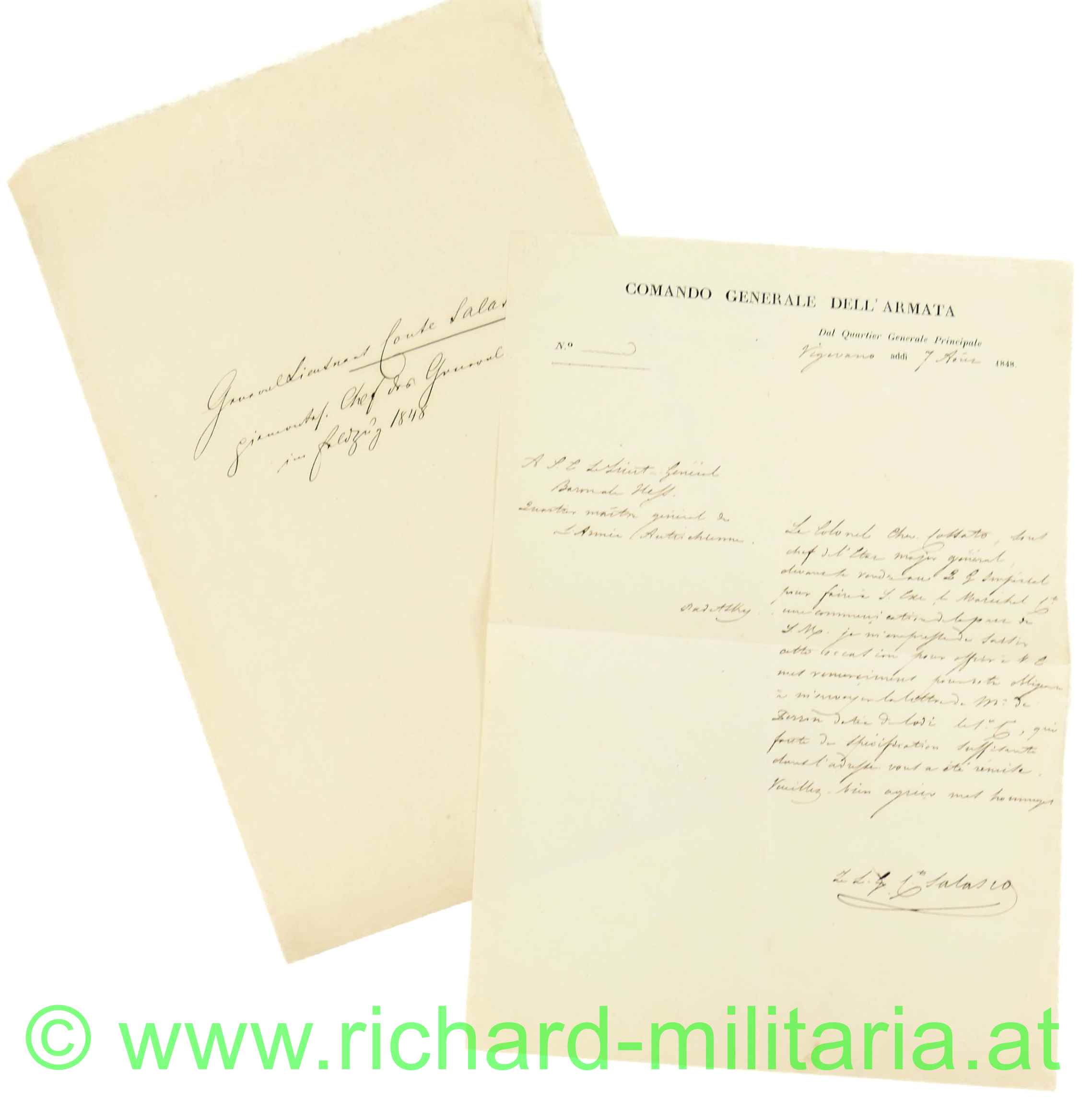 Schreiben des COMANDO GENERALE DELL`ARMANTA von 1848 mit originaler Unterschrift von Generalleutnant Conte Salasco (Carlo Canera di Salsco); gerichtet an den Chef des k.k. Generalstabes; Überformat A4, italienisch; in beschriftetem Umschlagblatt