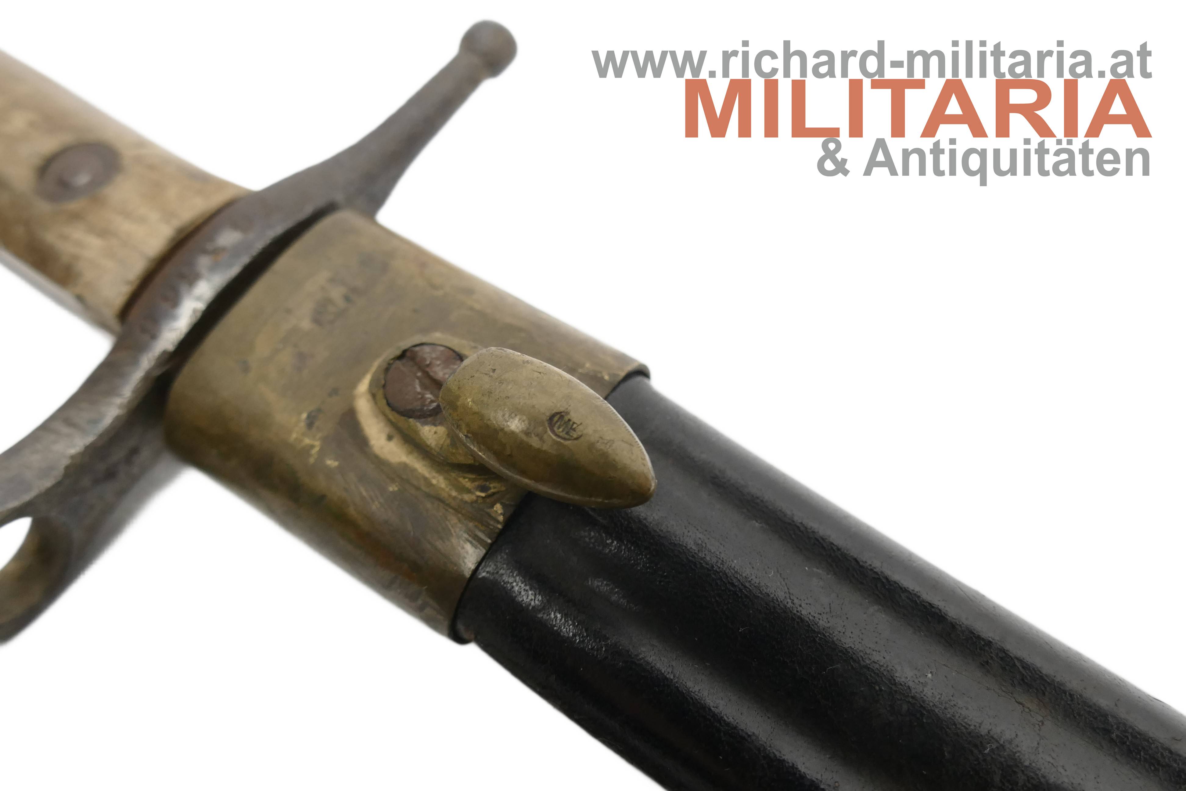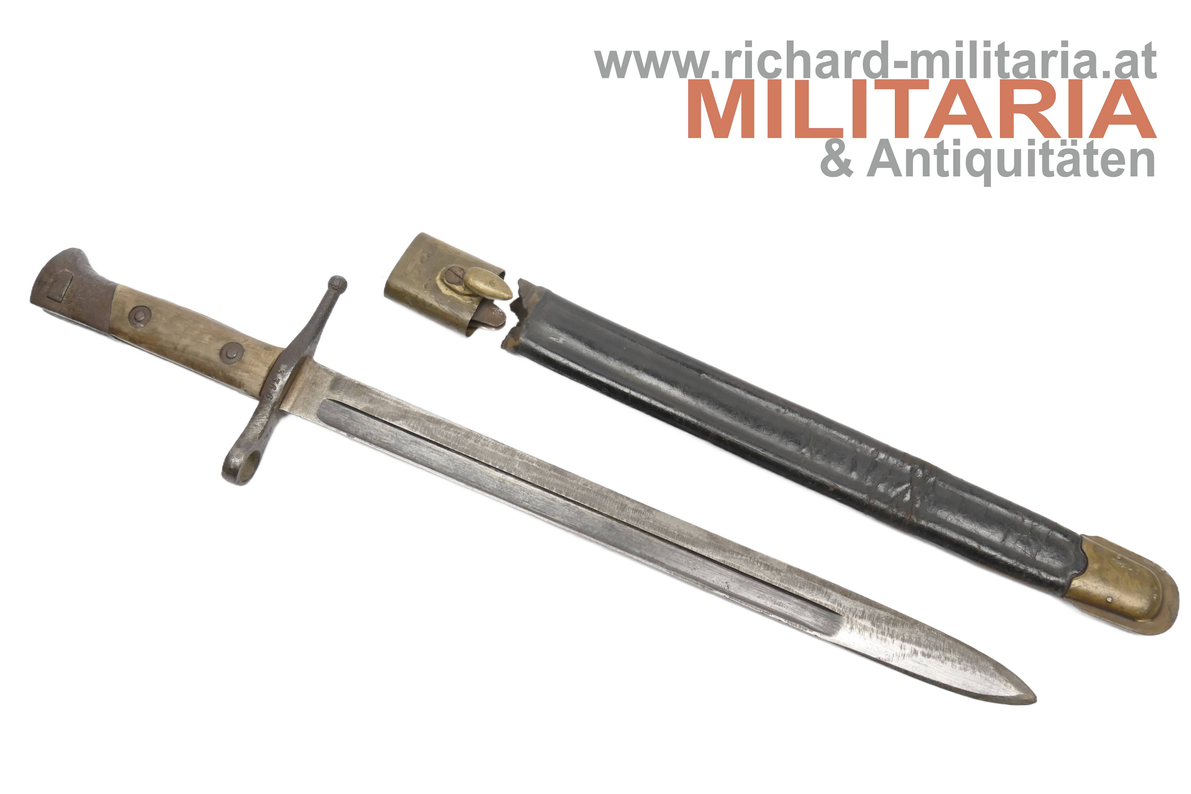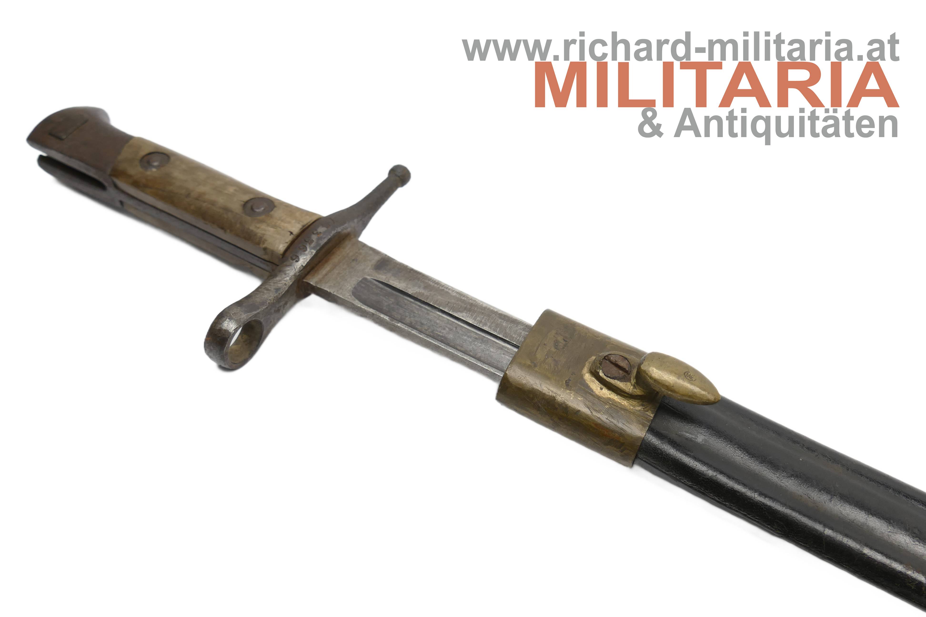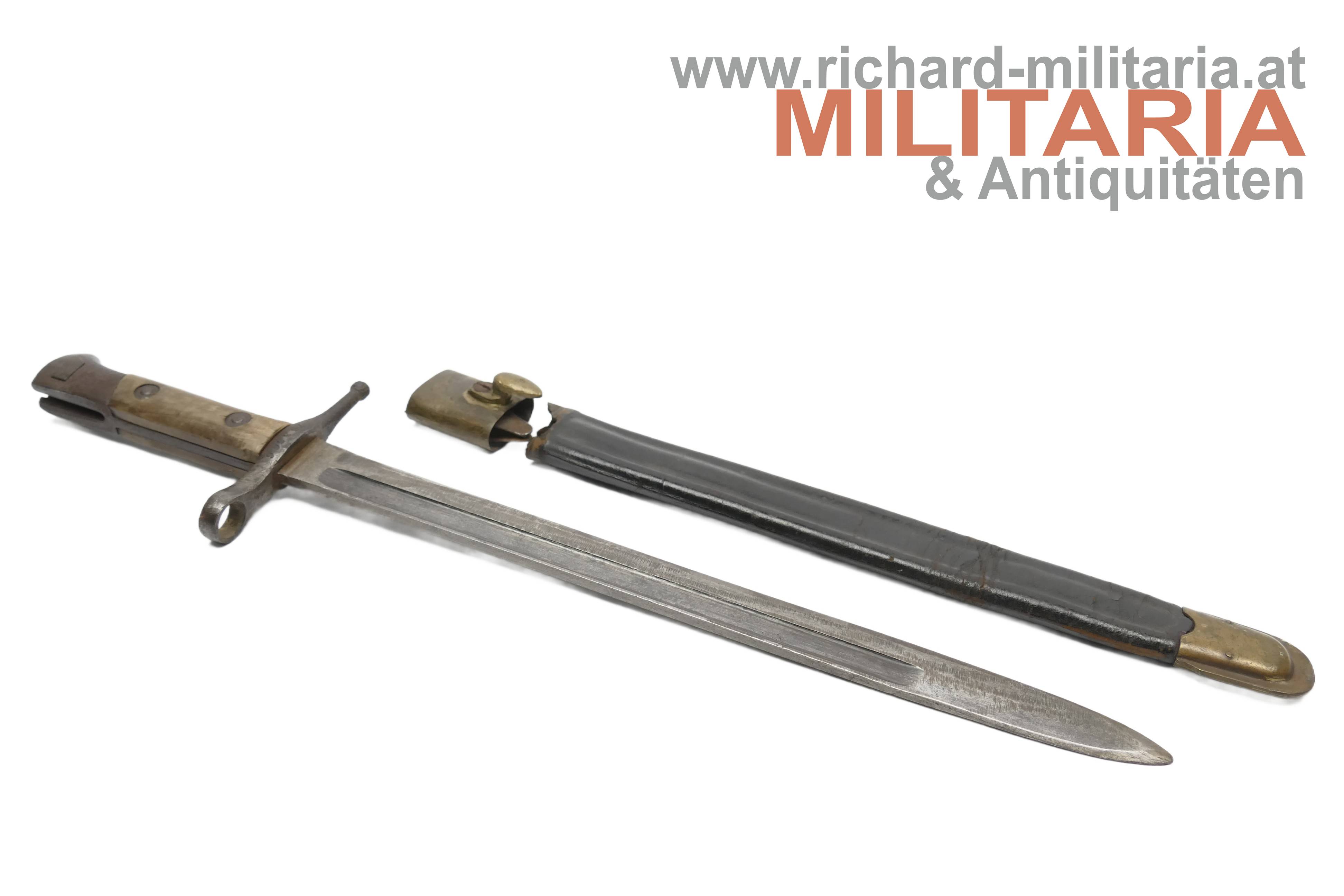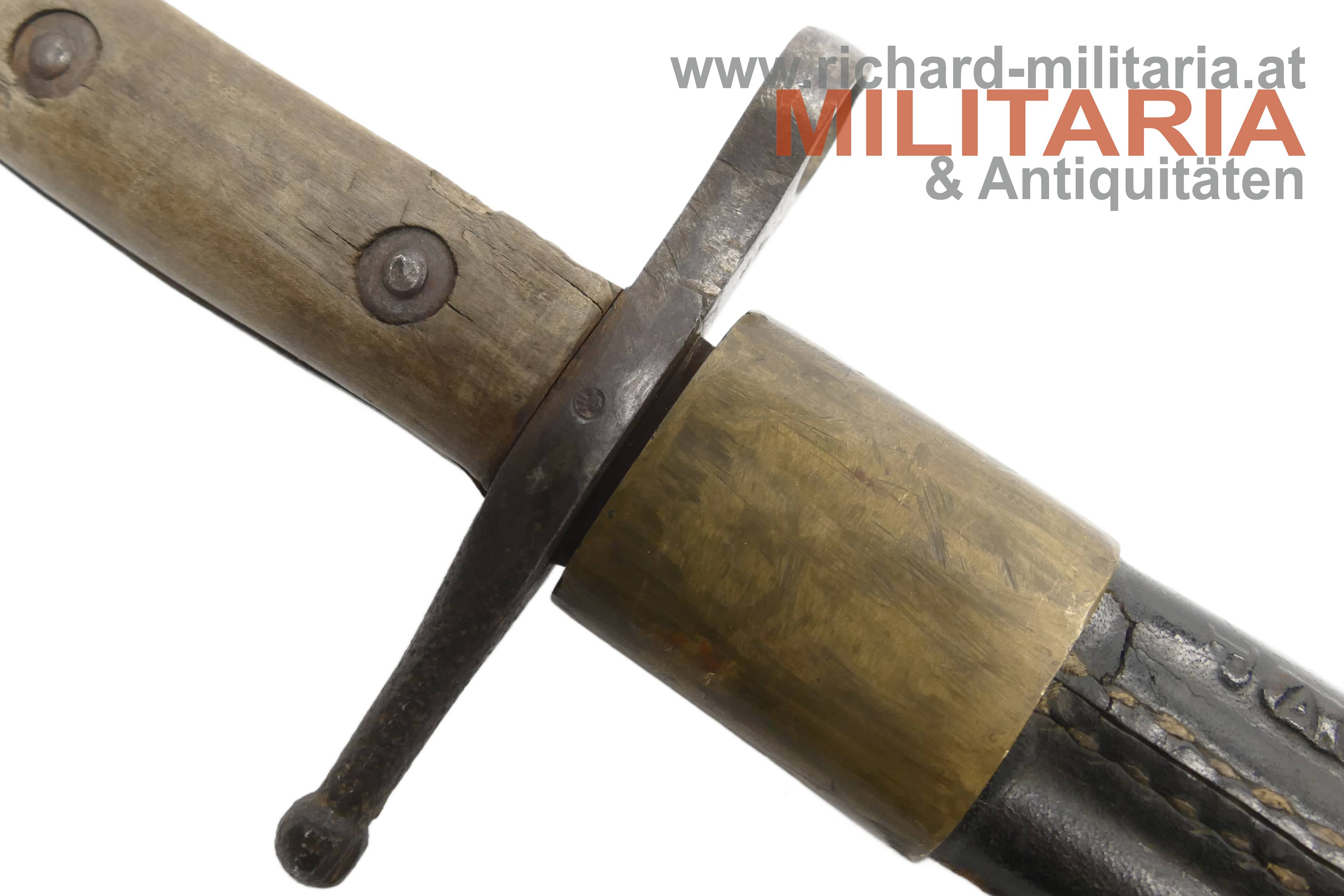 Italien - Bajonett Vetterli-Terni; doppelt vernietete Holzgriffschalen; Eisenteile angerostet und teilweise narbig; an der Parierstange Waffennummer ZG3366; beschliffene Klinge; schwarze Lederscheide mit Prägung P A.C.I. 1915 und am Tragehaken ME; Mundblech lose; reinigungs- und pflegebedürftig.