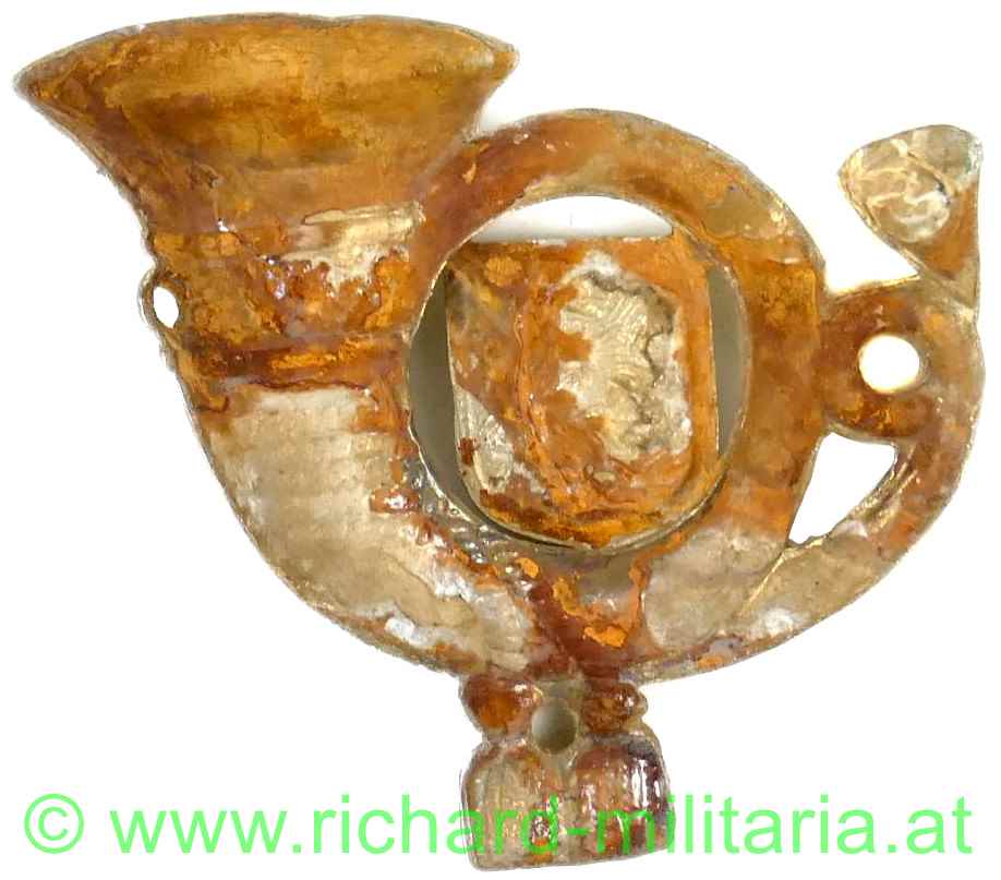 Jägerhorn für die Kappe - Steiermark 1. Republik, Tombak versilbert/vergoldet, einteilige Fertigung, Steirischer Panther, zum Aufnähen