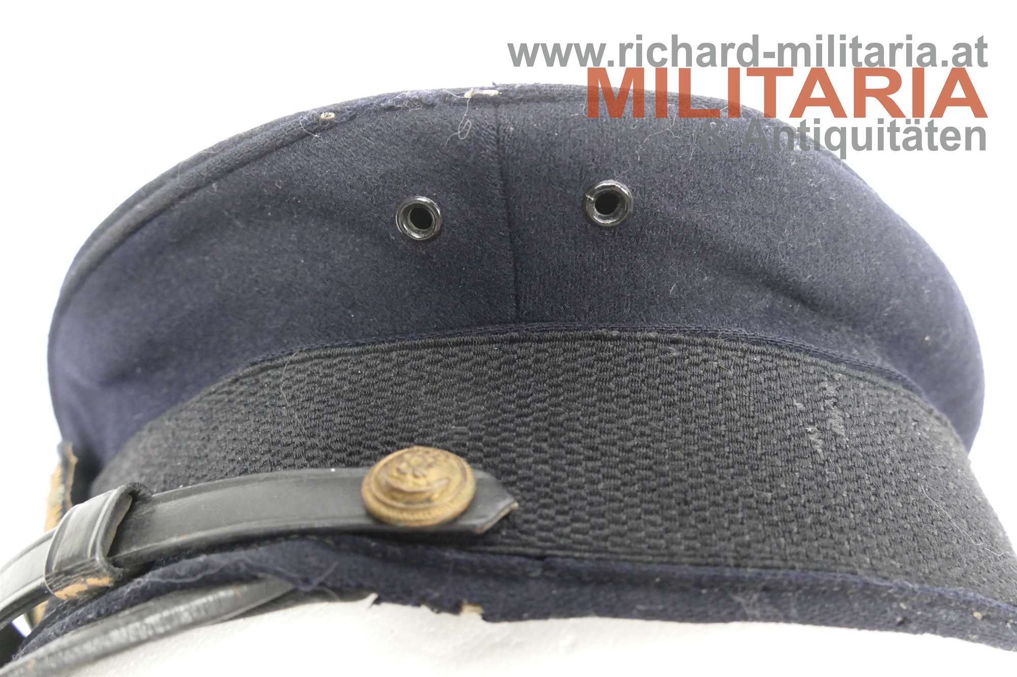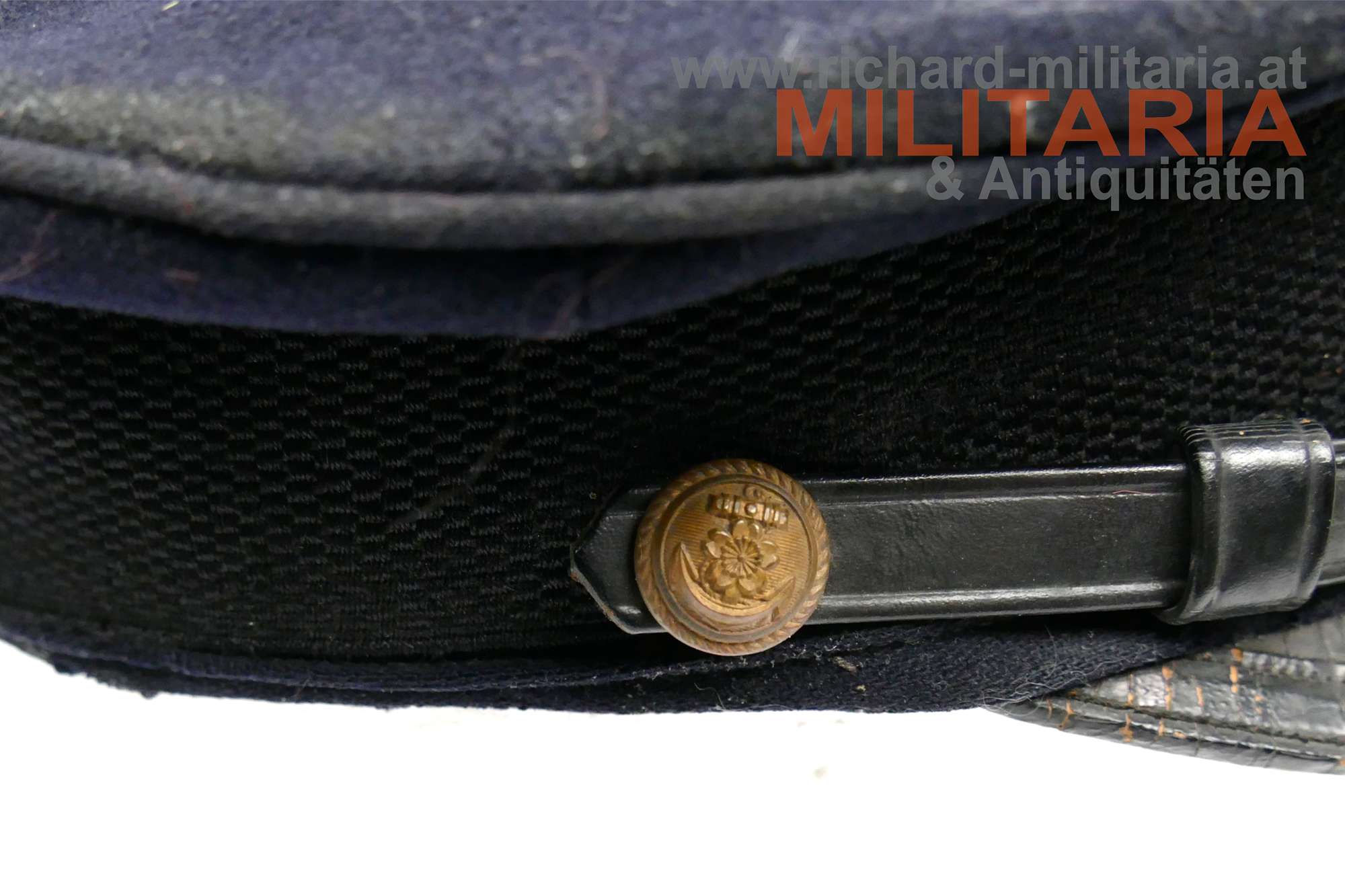Japan - 2. Weltkrieg: Schirmmütze für einen Marineoffizier; dunkelblauer Wollstoff mit umlaufender schwarzer breiter Borte Rippstoff; vorne mittig das große, handgestickte Abzeichen für Offiziere der kaiserlichen Marine; mehrteilig sehr plastisch aus Gold- und Silberfaden gestickt mit silberner Lotusblüte und goldenem Anker; Sturmriemen von 2 vergoldeten Knöpfen mit Anker und Lotusblüte gehalten; schwarzer Lacklederschirm - krakeliert; Stirnleder fehlt komplett; innen in auf der schwarzen Futterseite eine aufgestickte Leinenraute mit japanischer Beschriftung; leichte Trage- und Gebrauchspuren und einige, kleine Mottenlöcher.