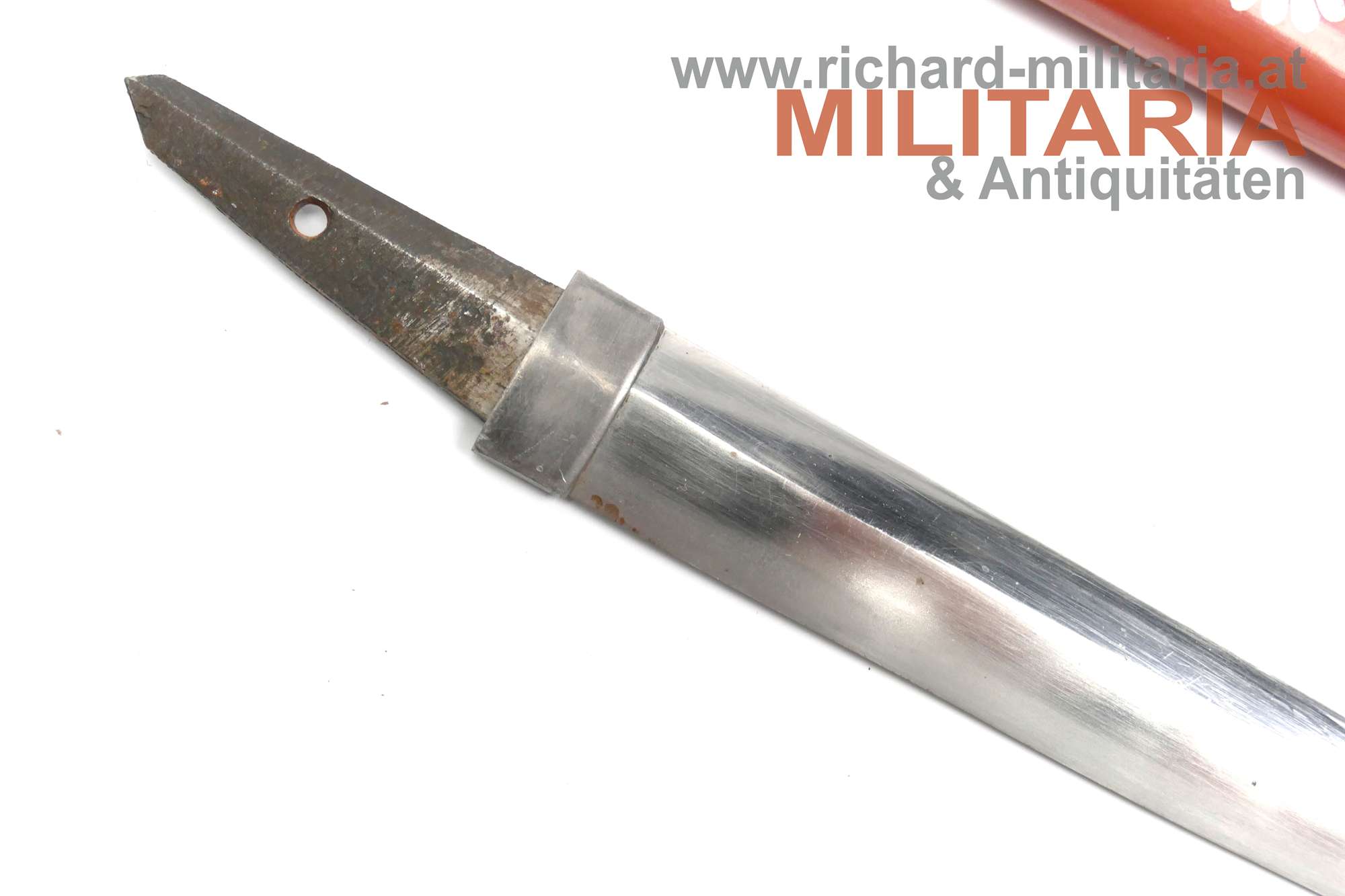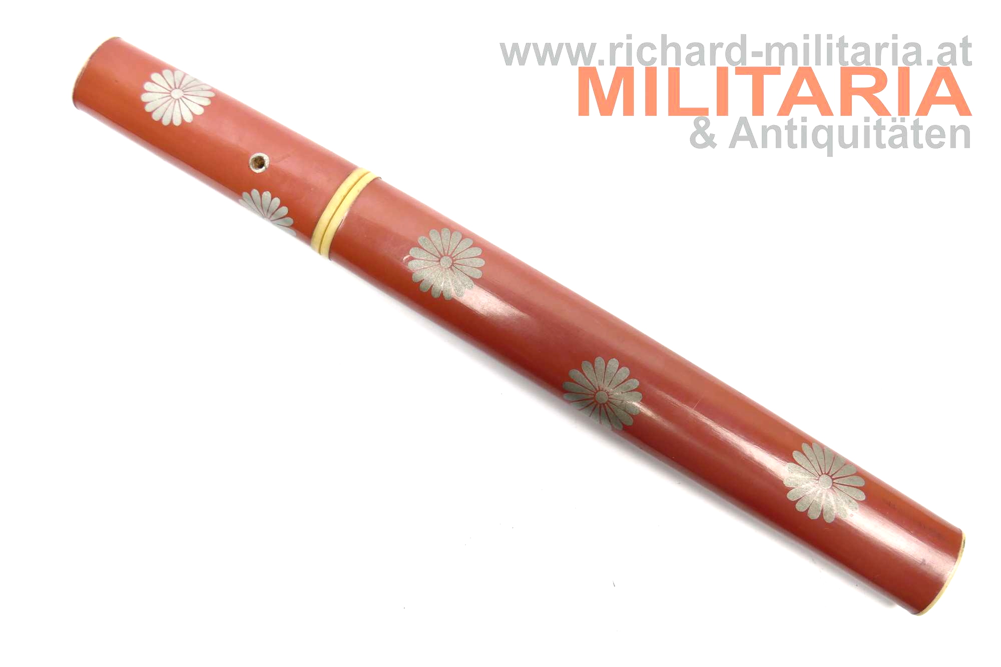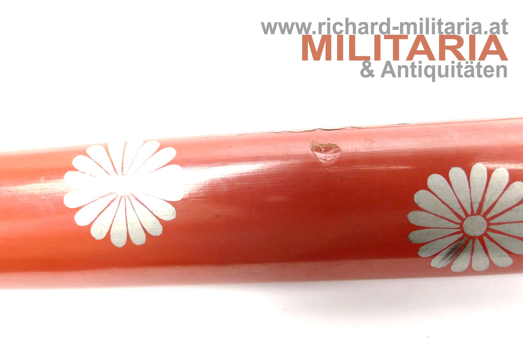 Japan - Tanto in lackierter Holzsaya; sehr schöne unsignierte gerade Klinge mit nioi suguha - hamon; habaki aus Weißmetall; Tsuka und Saya aus rötlich-braun lackiertem Holz mit silbernem Blütendekor; eingesetzte Beinscheiben an beiden Enden von Tsuka und Saya; Saya mit 2 kleinen Druckstellen und feinem Sprung in der Lackierung im Bereich einer Druckstelle. Die größere Druckstelle hat einen Durchmesser von 5mm. An der unteren Endscheide der Saya aus Bein fehlt ein kleines Stück.