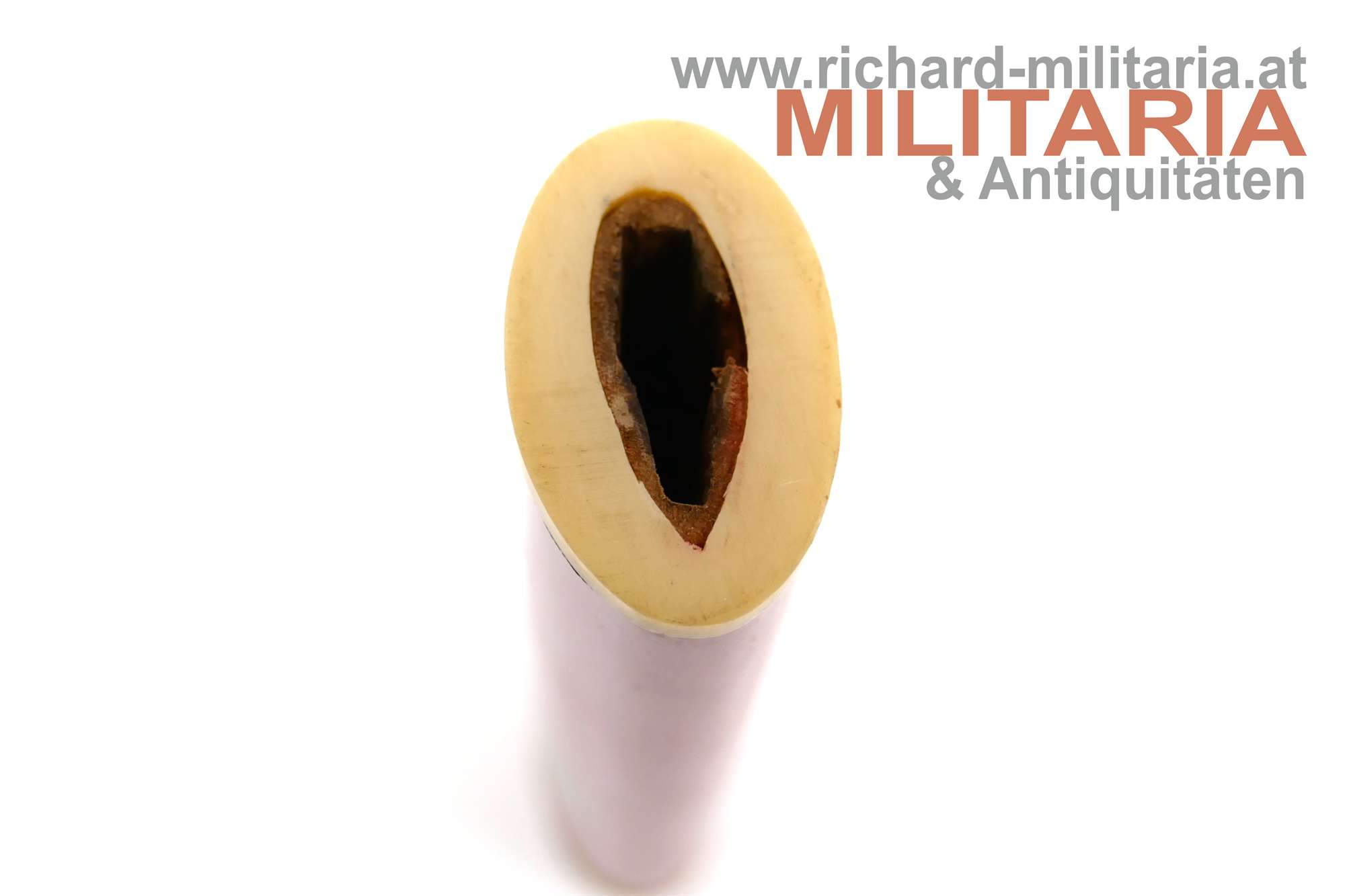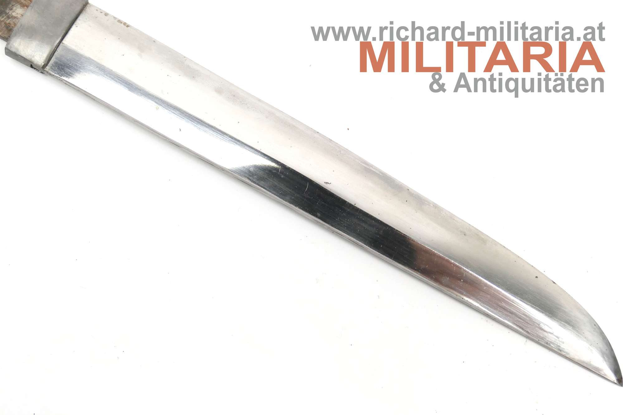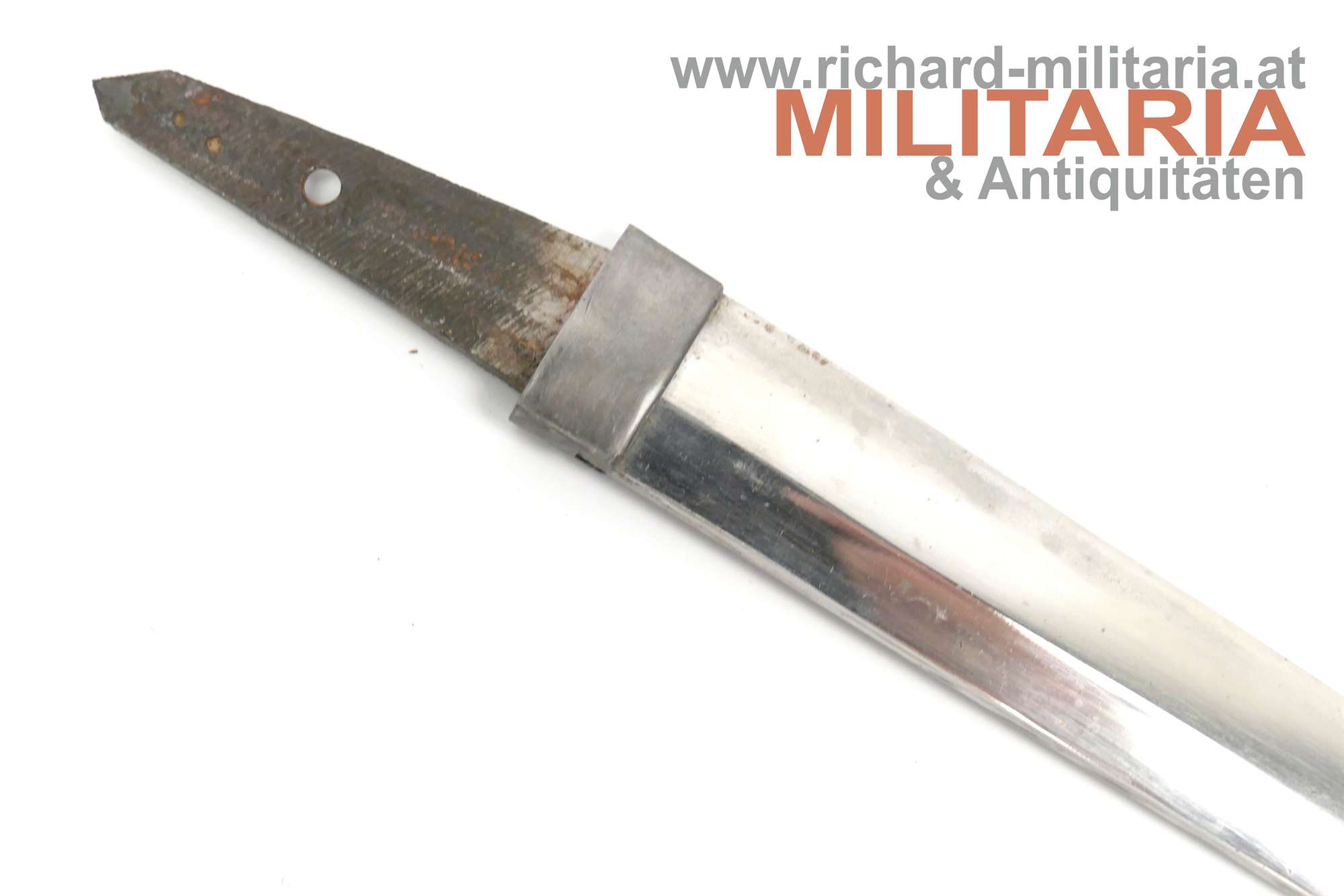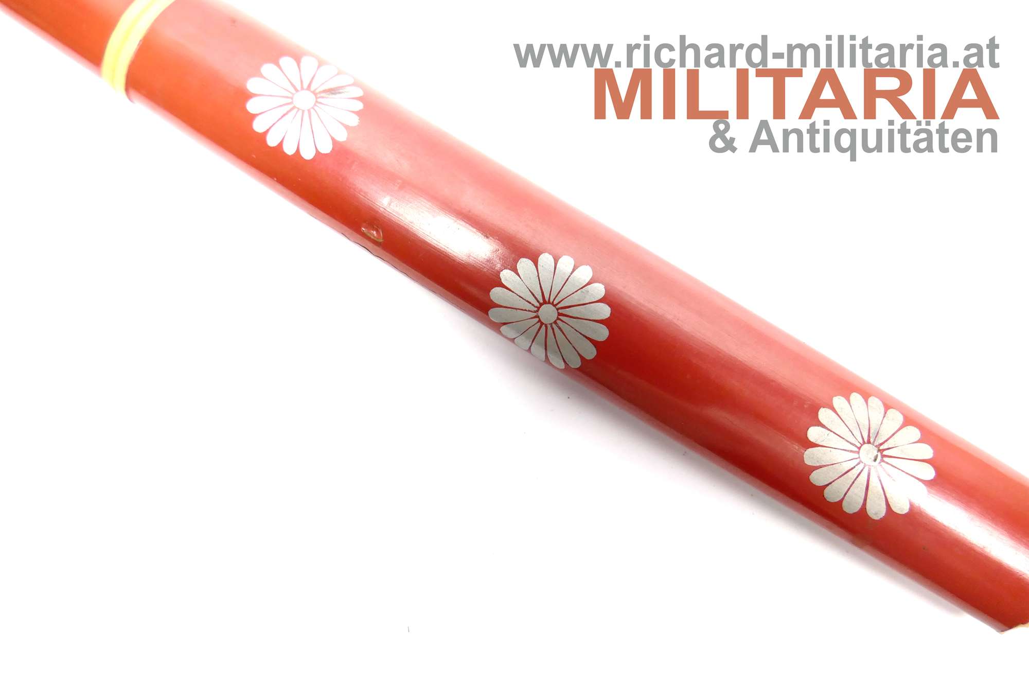 Japan - Tanto in lackierter Holzsaya; sehr schöne unsignierte gerade Klinge mit nioi suguha - hamon; habaki aus Weißmetall; Tsuka und Saya aus rötlich-braun lackiertem Holz mit silbernem Blütendekor; eingesetzte Beinscheiben an beiden Enden von Tsuka und Saya; Saya mit 2 kleinen Druckstellen und feinem Sprung in der Lackierung im Bereich einer Druckstelle. Die größere Druckstelle hat einen Durchmesser von 5mm. An der unteren Endscheide der Saya aus Bein fehlt ein kleines Stück.