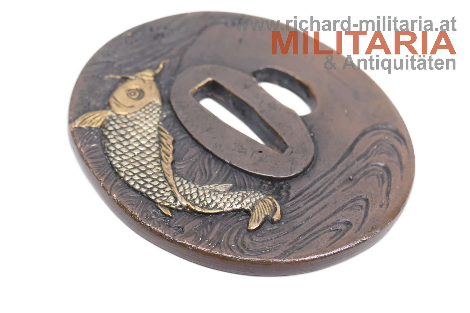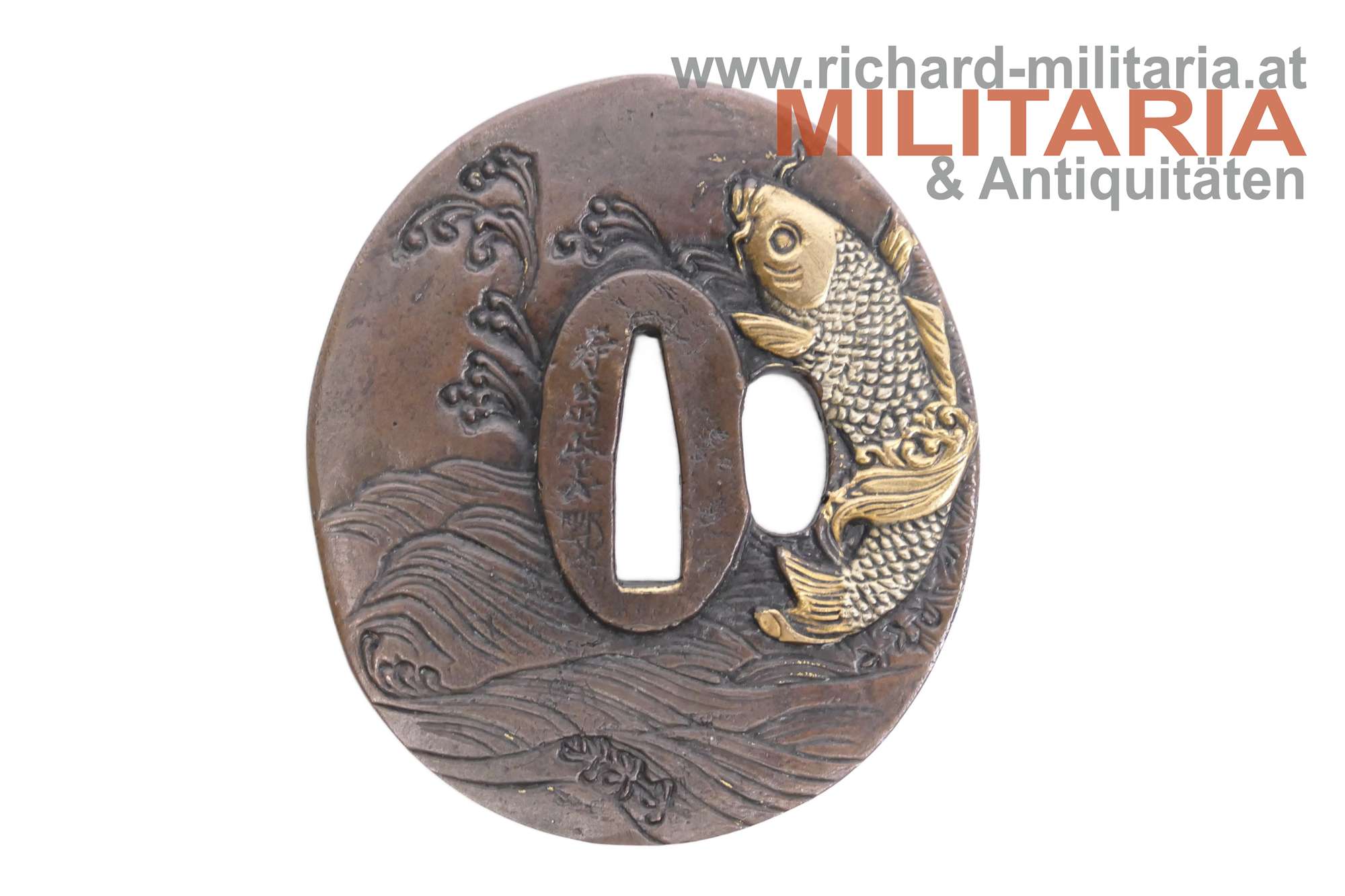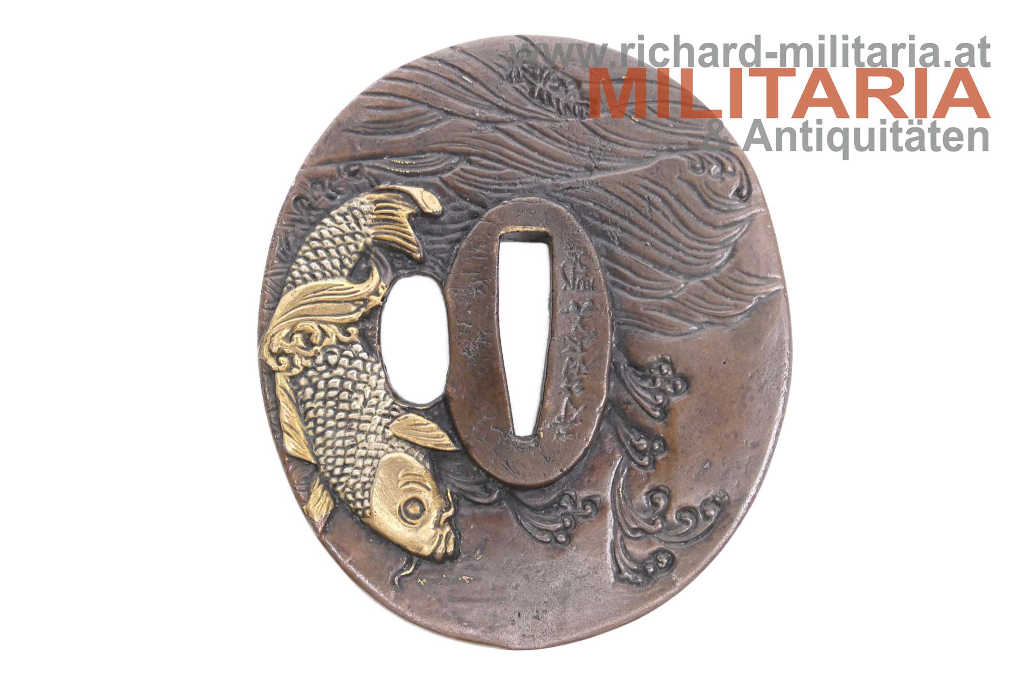 Japan - Tsuba für einen Katana; Bronze mit Goldeinlagen; beidseitige (!) unterschiedliche Darstellung eines Schuppenkarpfen im Wasser; signiert;
