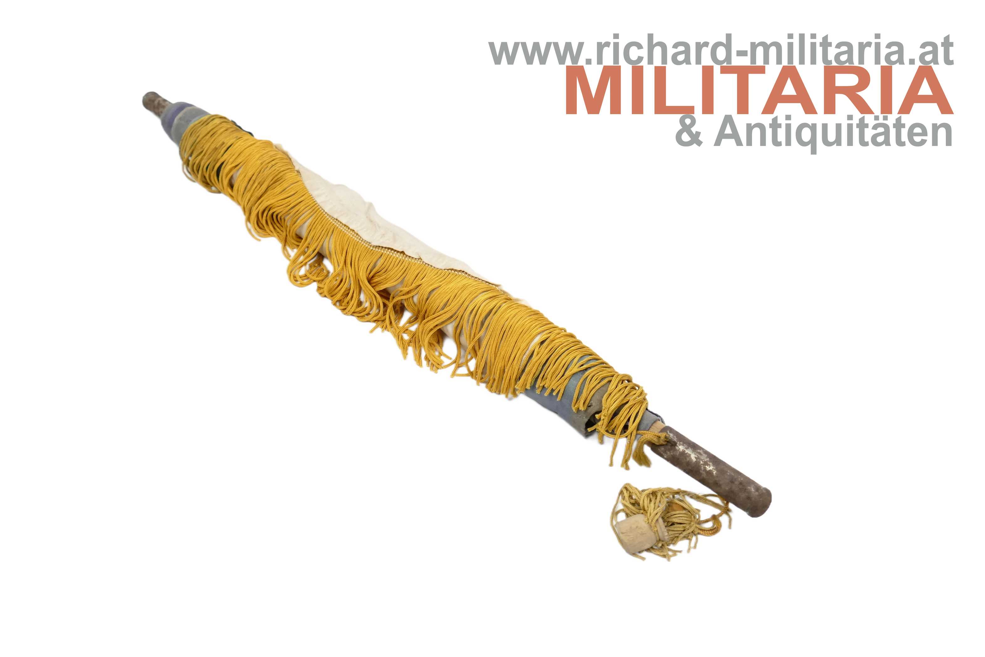 Japan 2. Weltkrieg: sogenanntes shussei nobori (Auf in den Krieg)-Banner; Seide handgemalt; mit originaler Trage- bzw. Aufhängvorrichtung; handbemaltes Seidentuch mit kanji die sich auf die Marine-Infanterie von Kure bezieht. Der Name der geehrten Soldaten lautet Shinichi Shibata und Morimukai Takeyo. An unteren Ende aufgenähte gelbe Franzen;