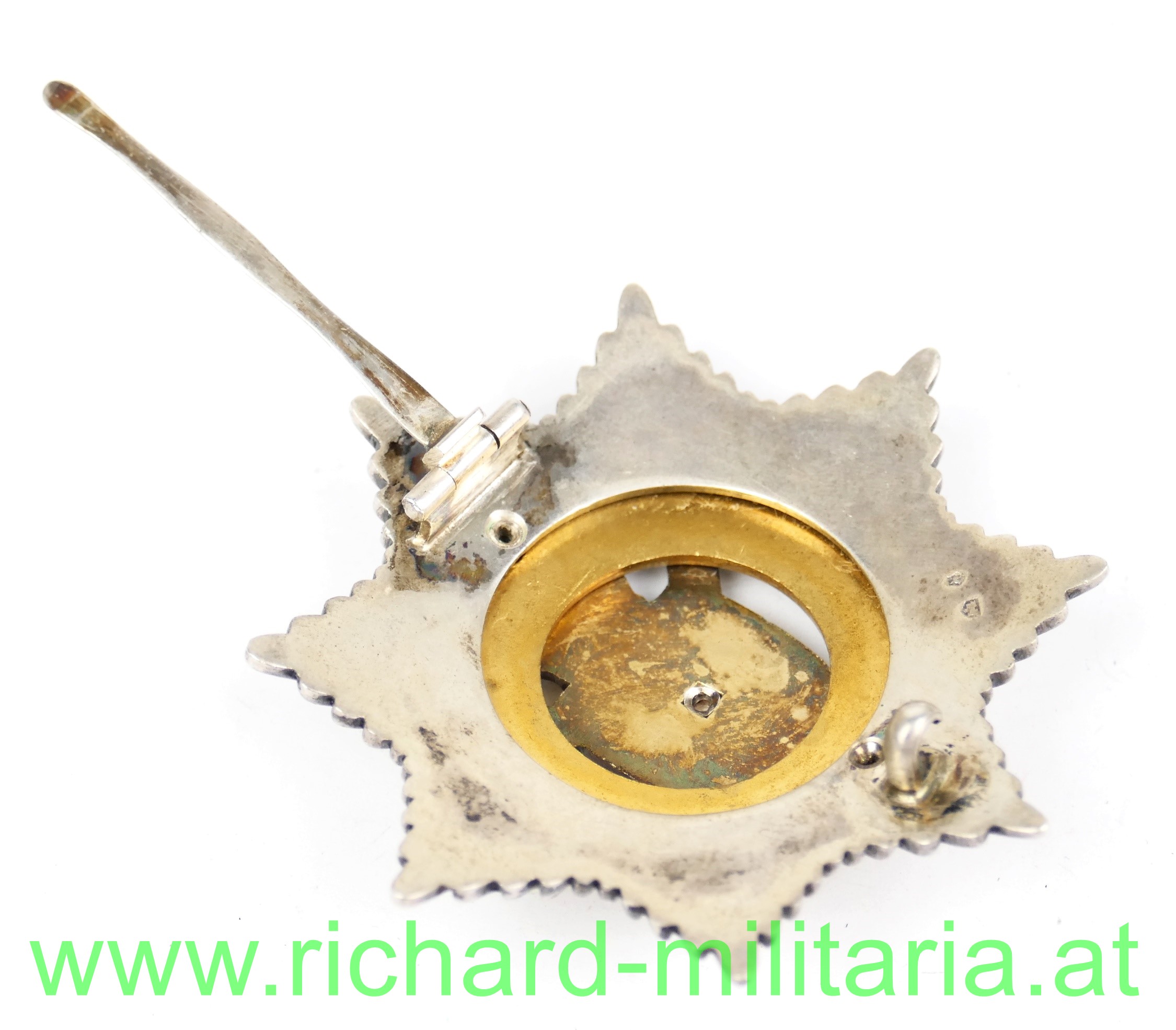 Jugoslawien - Orden Militärische Verdienste 2. Klasse, mit komplettem Nadelsystem; SILBER - zweifach Silber punziert; Variante 1 mit 5 Fackeln (1. Form - Kosovo ist noch nicht bei Jugoslawien), teilweise emailliert; Fackeln, Kranz und Schwerter vergoldet, Eichenlaubkranz grün emailliert;