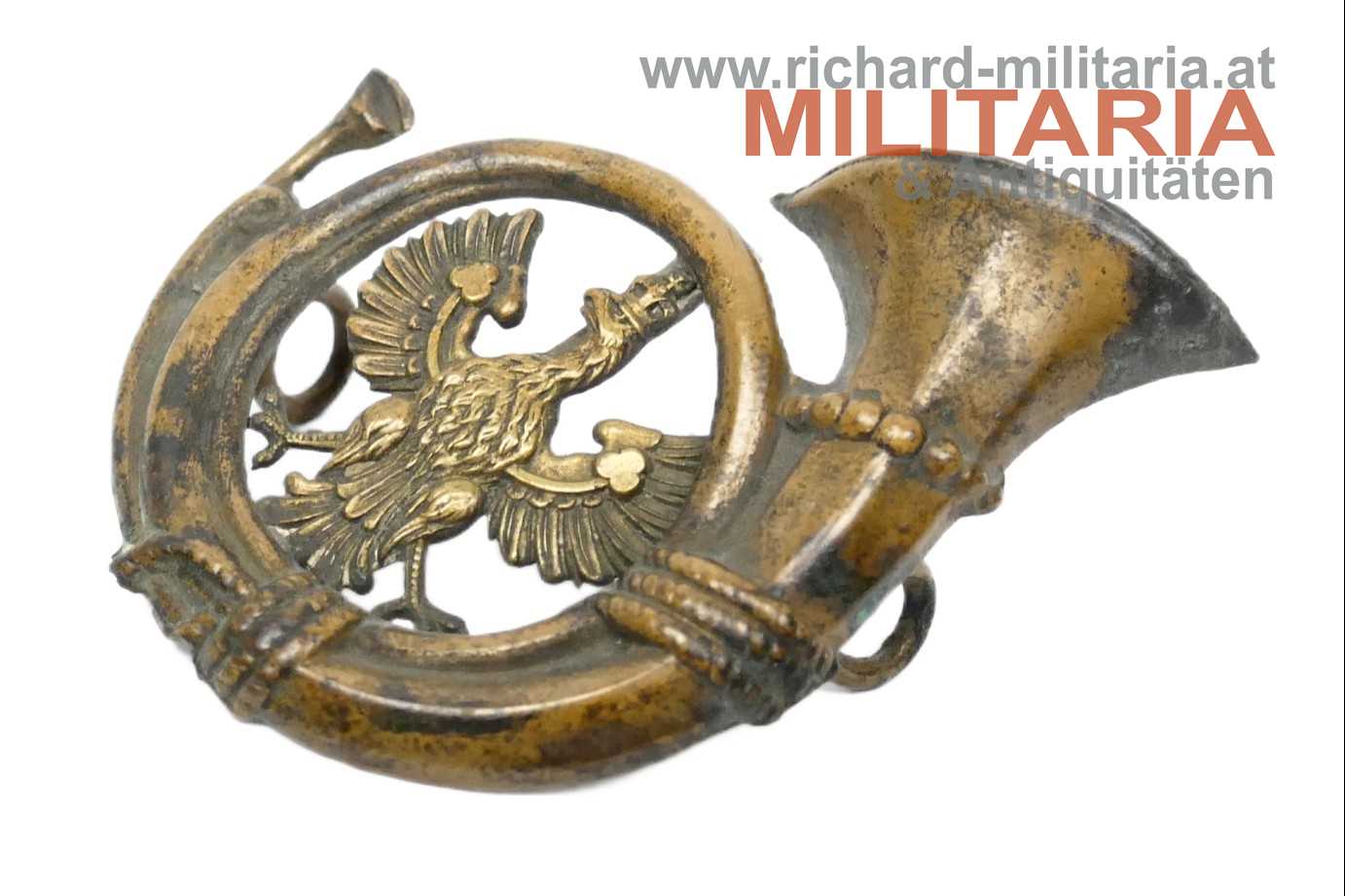 k.(u.)k. Jägerhorn für den Jägerhut der Tiroler Kaiserjäger & Landes- bzw. Kaiserschützen; Tombak; revers mit zwei Tombakschlaufen zum Fixieren mittels Lederdurchzugsband;