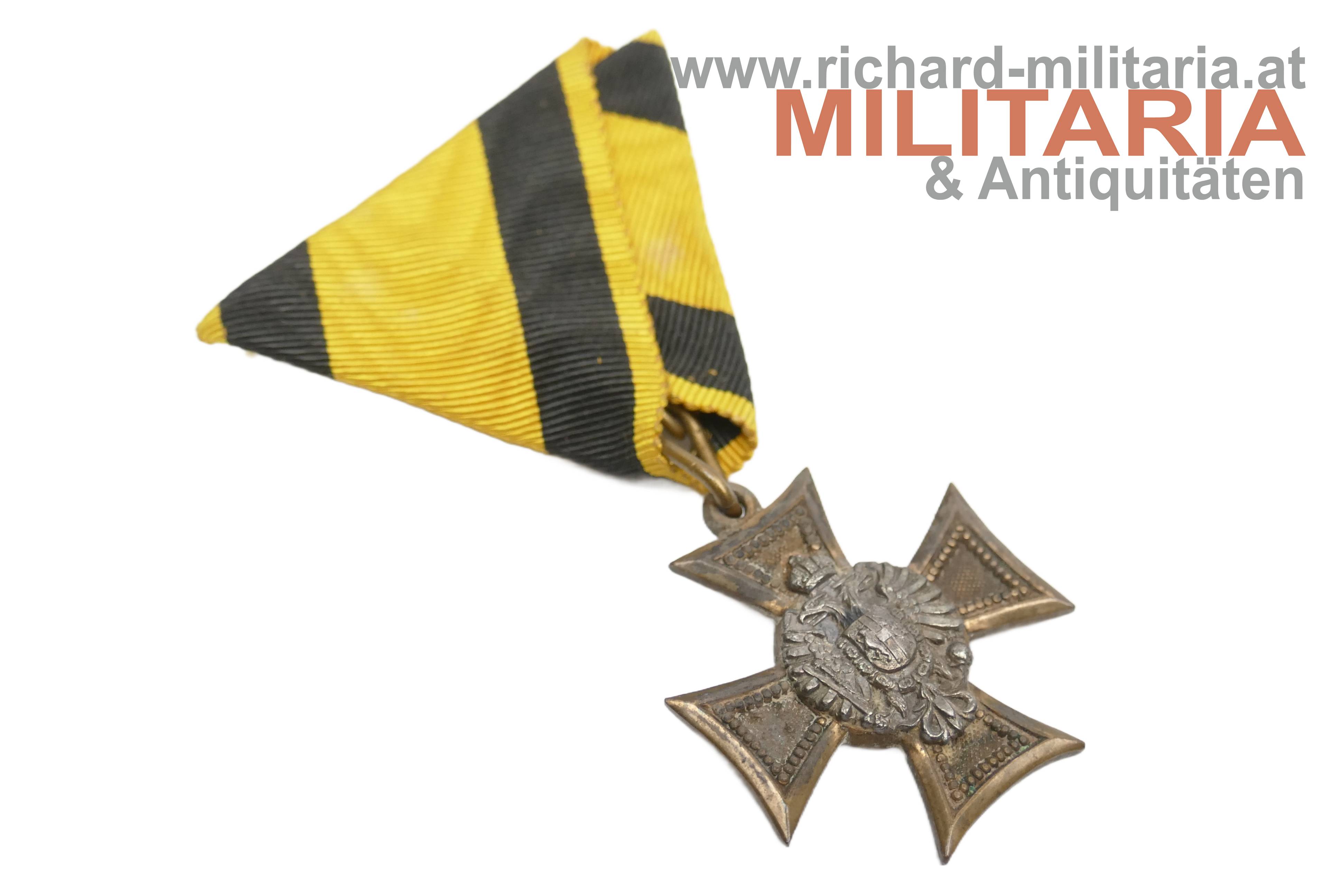 k.(u.)k. Militärdienstzeichen Offizier - 1. Klasse (25 Jahre); Modell 1849-1890; Bronze; etwas angeschmutzt; mit silbernen unbekrönten Dopeladler; mit langem einfachen Bandring; am originalen jedoch späteren Dreiecksband;