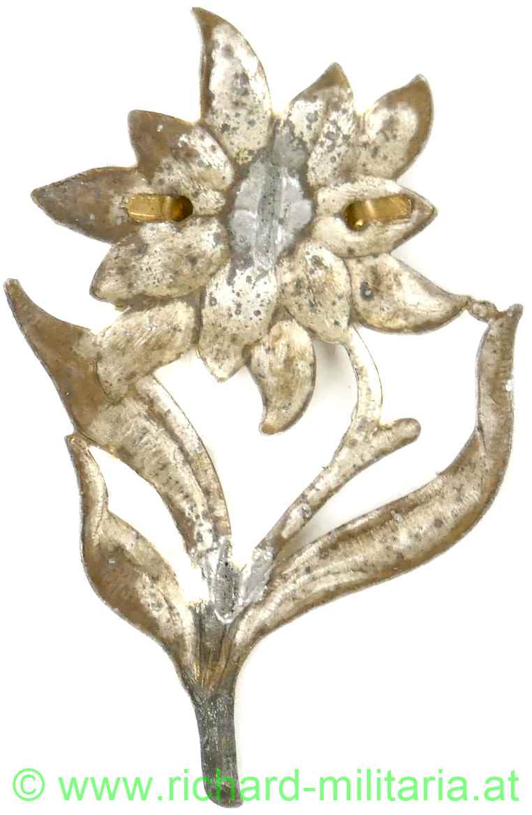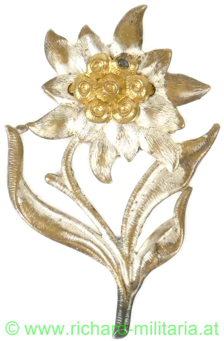 Edelweiss für den Kragen der k.k. Landwehr-Gebirgstruppen; Tombak versilbert; Blütenkranz aufgeklammert; sehr guter Zustand
