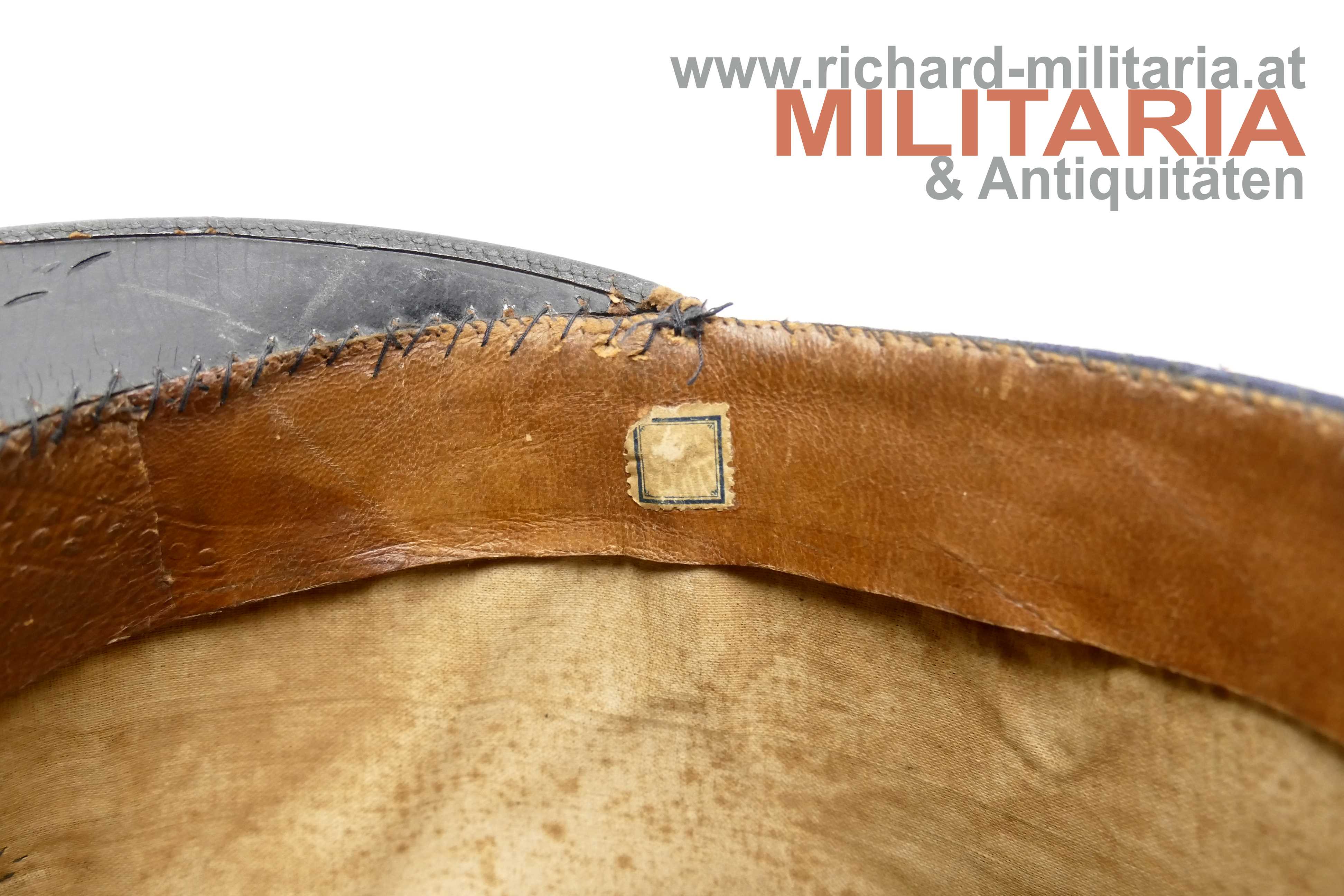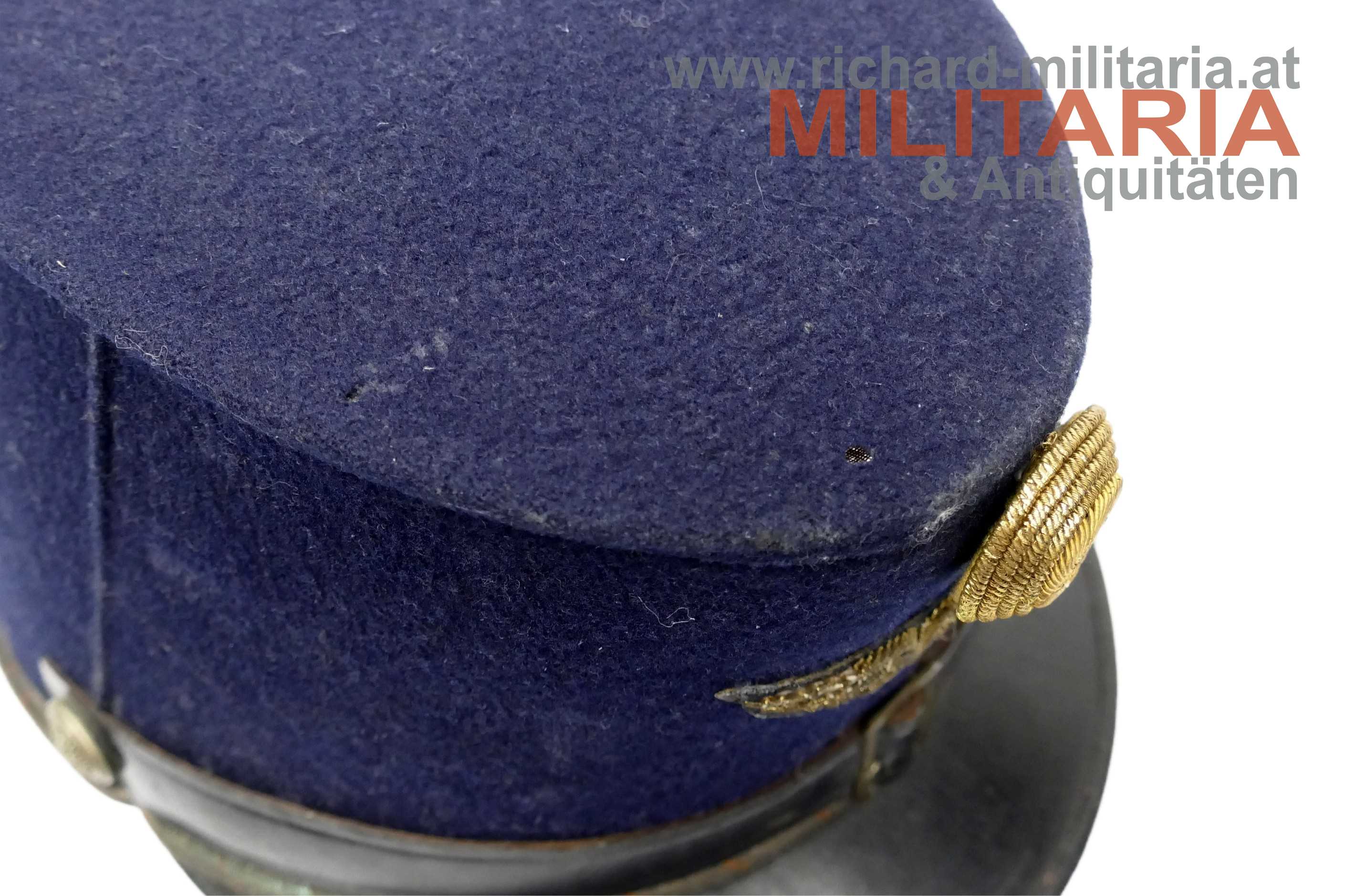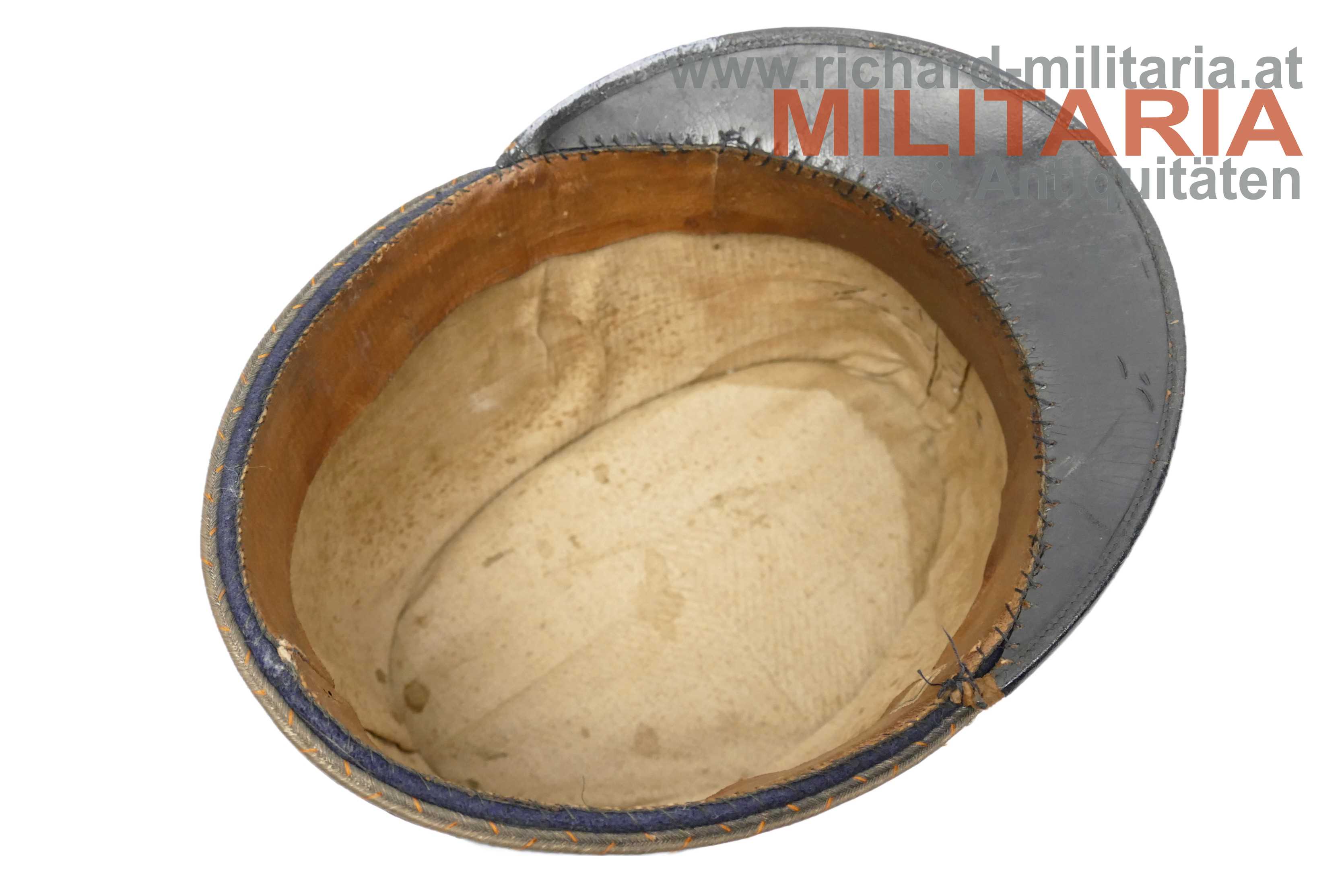k.k. blaue steife Kappe für Staatsbahnbeamte; steifer Korpus mit blauem Filz überzogen; umlaufende orange geritzte Kappenschnur - gedunkelt; seitlich je ein versilberter Knopf mit kaiserlichem Doppeladler; vorne mittig das aufgelegte Emblem der Eisenbahner überhöht von einer Offizierskokarde; braunes Stirnleder; innen mit beigem fleckigen Stoff ausgelegt; kleinere Mottenaufrauungen und ein kleines Loch am Deckel; das Foto vor der Lok dient nur zur Veranschaulichung und ist nicht Teil des Angebots;