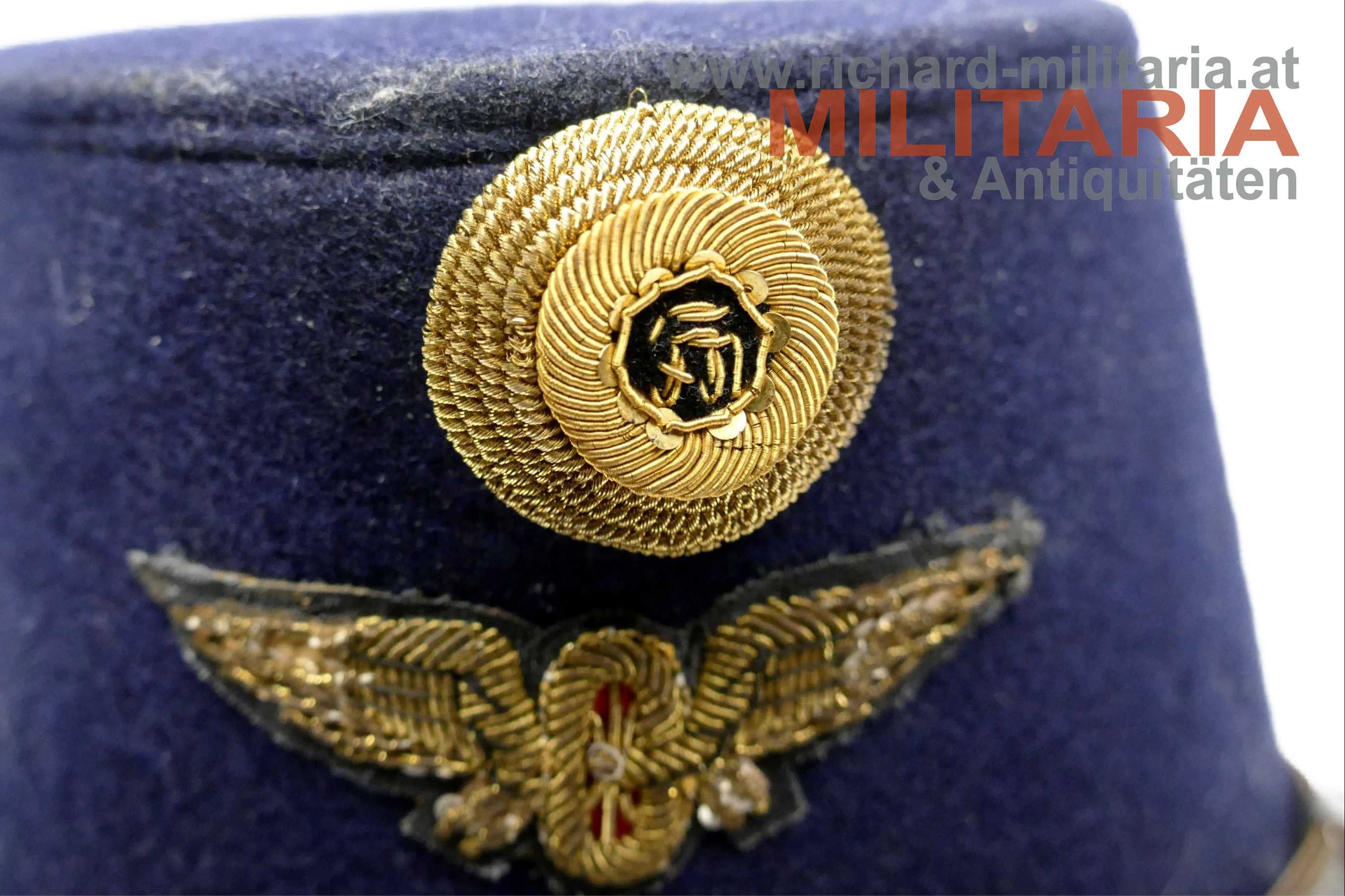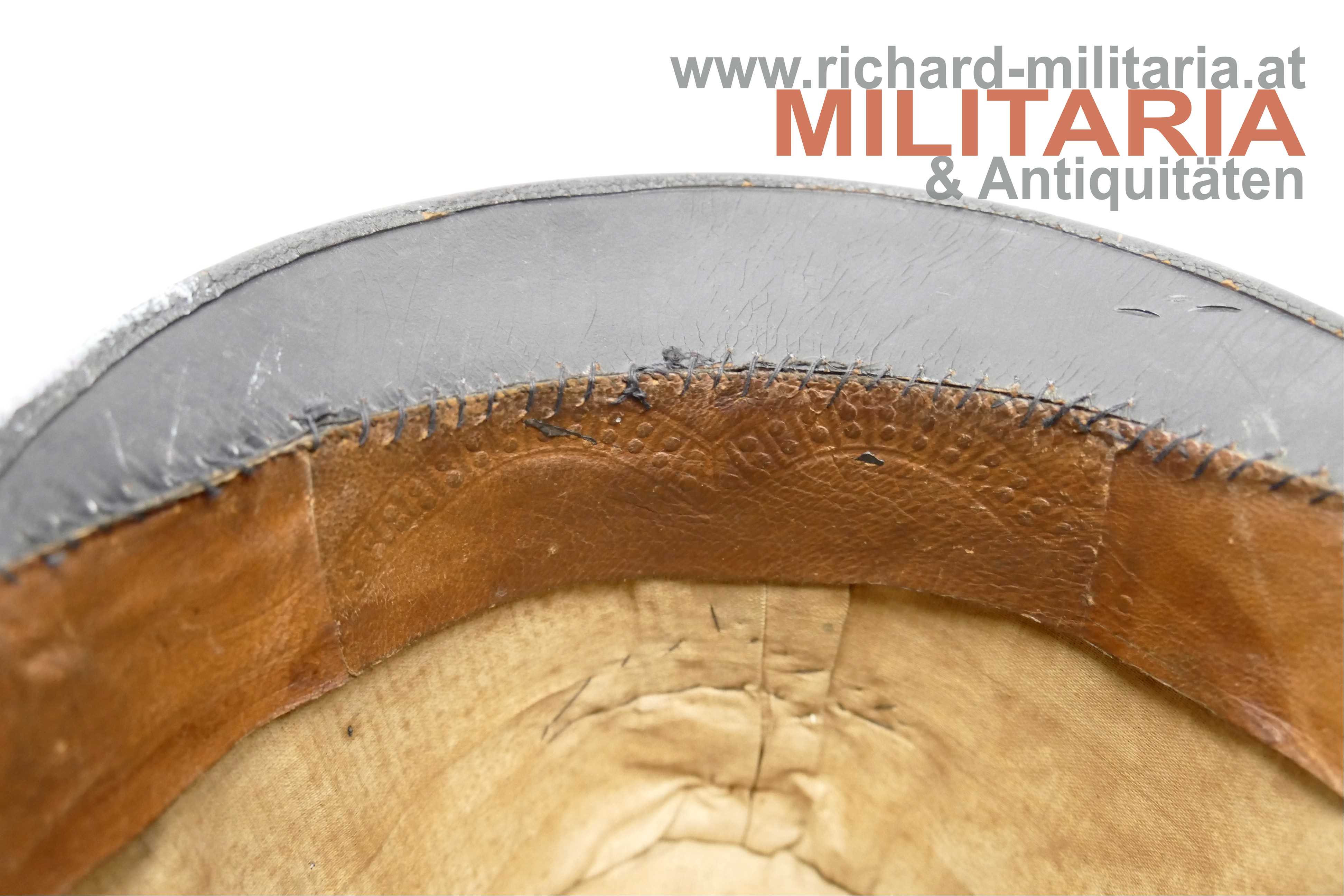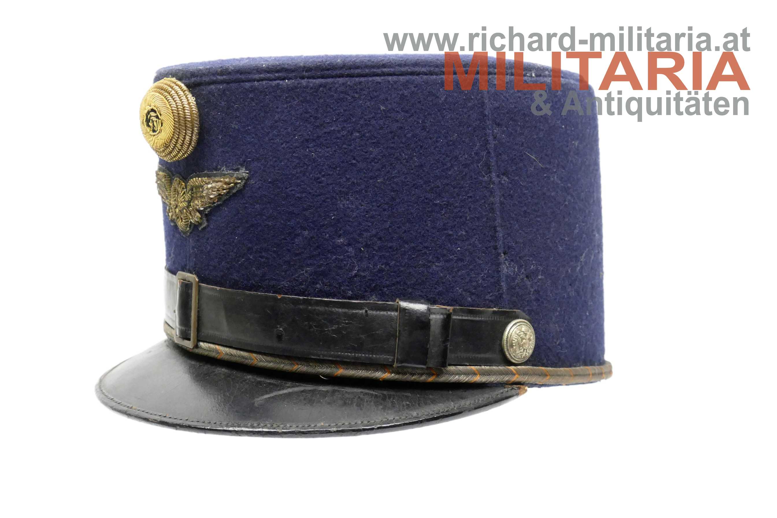 k.k. blaue steife Kappe für Staatsbahnbeamte; steifer Korpus mit blauem Filz überzogen; umlaufende orange geritzte Kappenschnur - gedunkelt; seitlich je ein versilberter Knopf mit kaiserlichem Doppeladler; vorne mittig das aufgelegte Emblem der Eisenbahner überhöht von einer Offizierskokarde; braunes Stirnleder; innen mit beigem fleckigen Stoff ausgelegt; kleinere Mottenaufrauungen und ein kleines Loch am Deckel; das Foto vor der Lok dient nur zur Veranschaulichung und ist nicht Teil des Angebots;