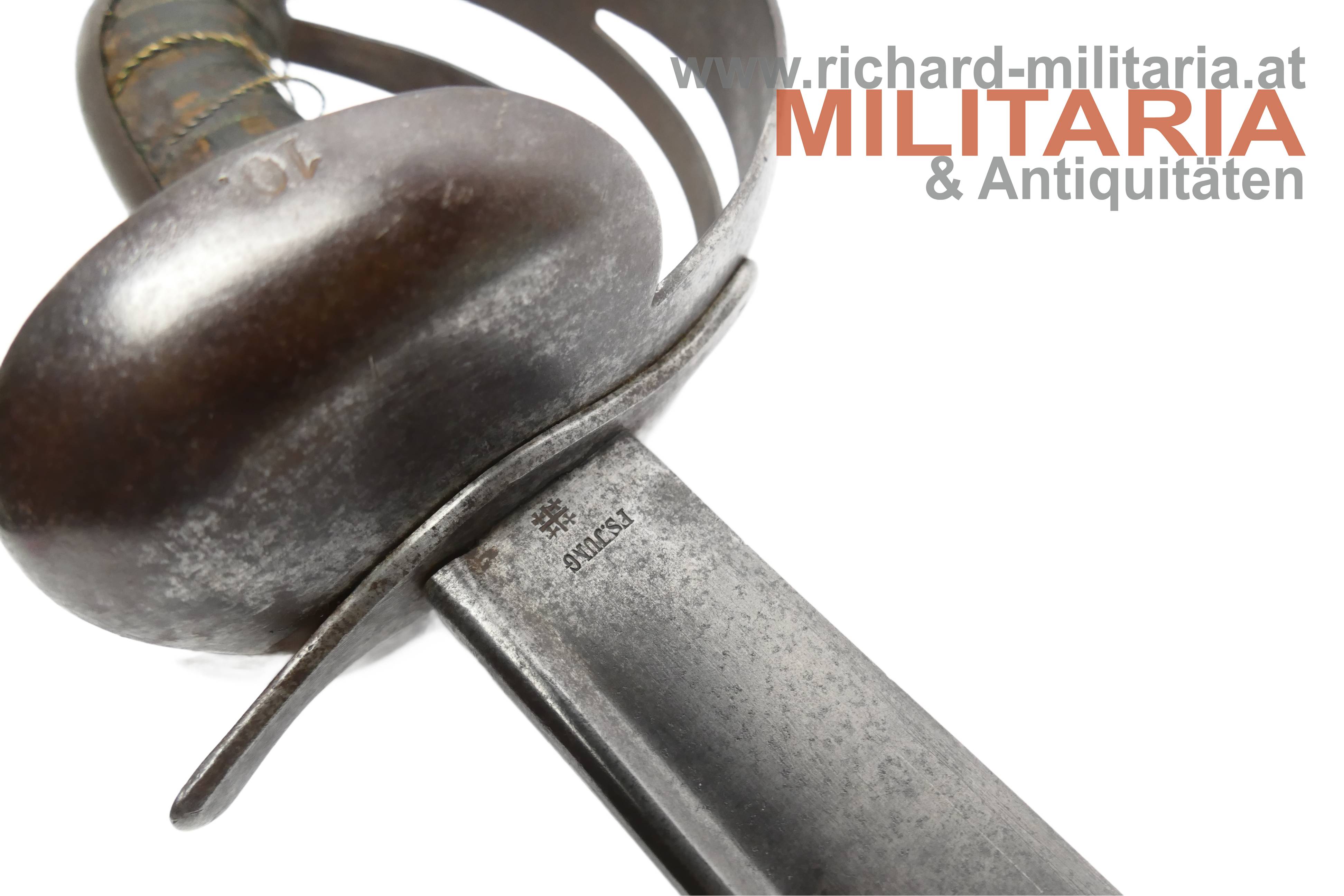 k.k. Bord- bzw. Entersäbel "neuer Art" M1858; Stabrückenklinge mit Schör; Klinge mit mehreren Kerben entlang der Schneide; Exemplar der ersten bestellten Charge mit der Jahreszahl "1858" am Klingenansatz; auf der anderen Seite des Klingenansatzes der Hertsellerstempel "F. S. Jung" und das Jerusalemkreuz; schalenförmiger durchbrochener Korb gestempelt mit "K.M." "F.S. Jung" und Inventarnummer "10"; auf der Parierstange eine "V"-Markierung; mit Leder bezogener Holzgriff (teilweise abgewetzt) - Reste der gedrillten Drahtwicklung vorhanden;