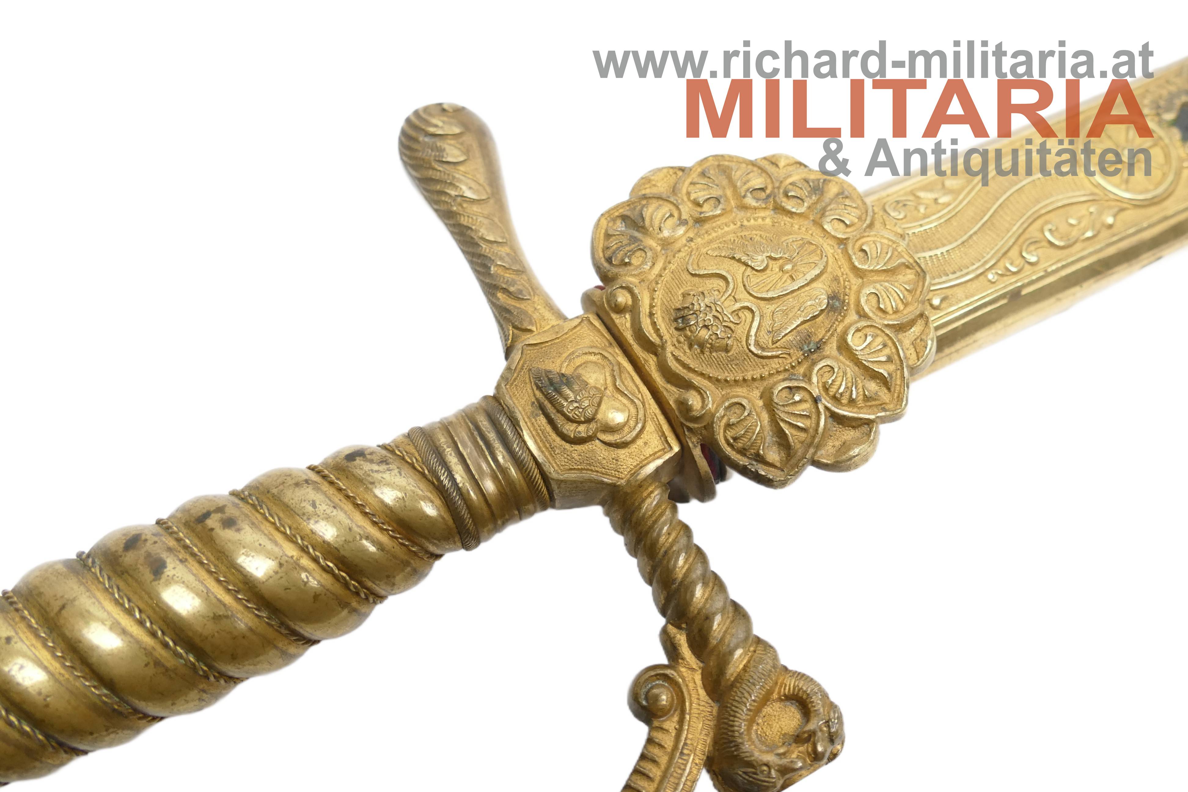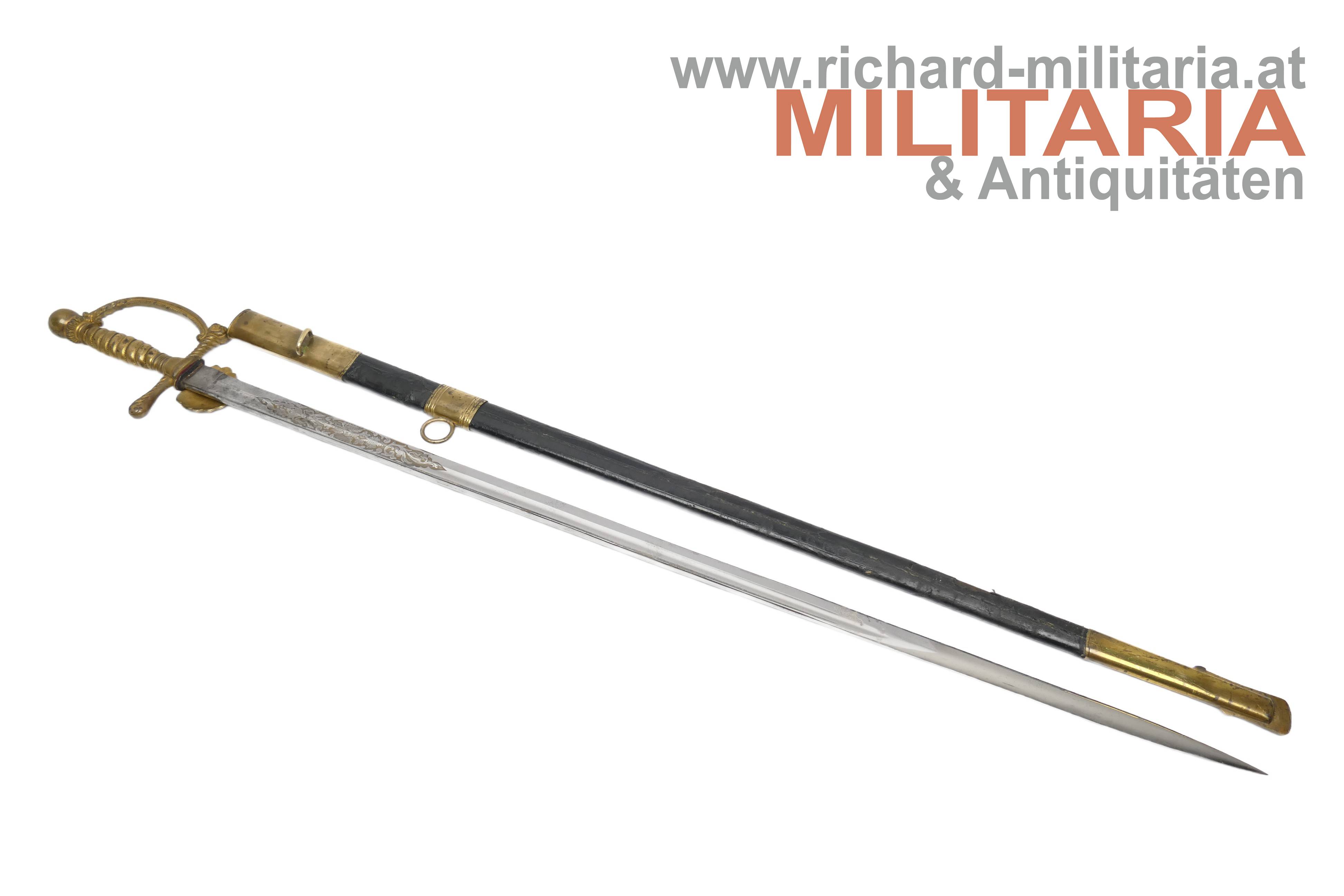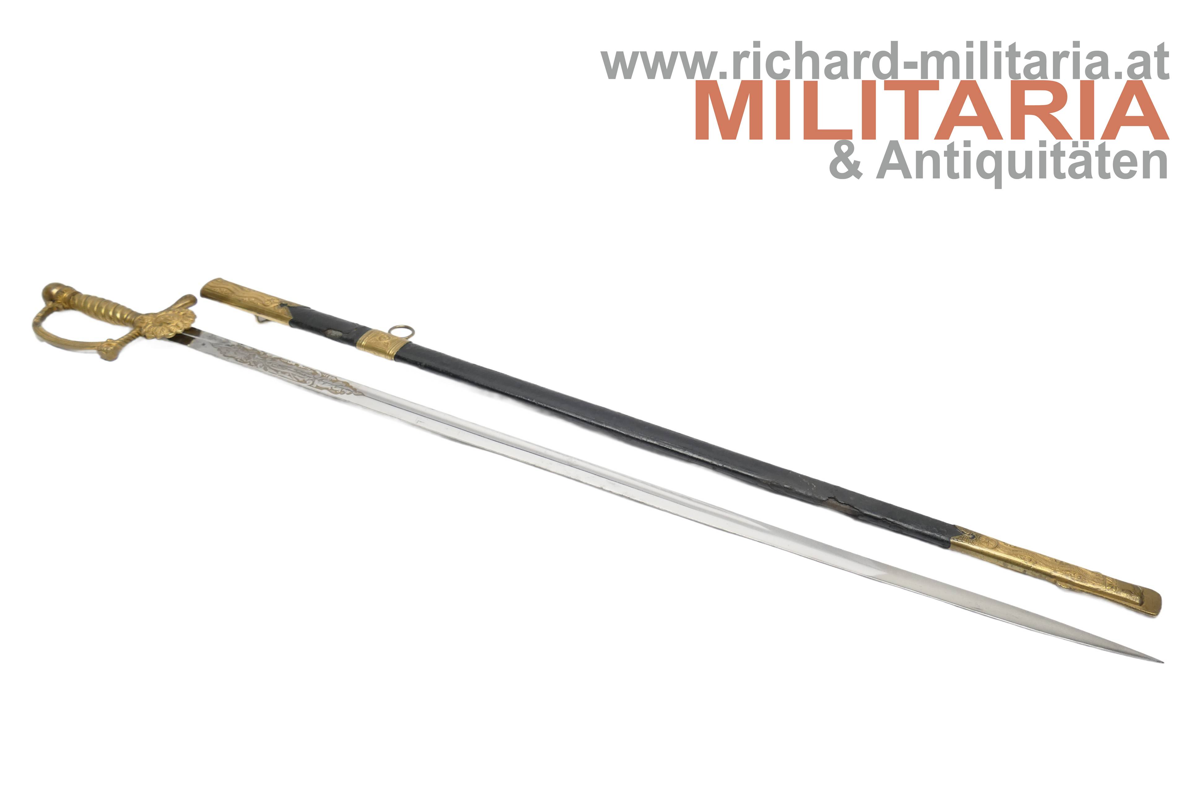 k.k. Degen für Eisenbahnbeamte der Staatsbahnen M1891; unüblich lange massive Rückenklinge; vernickelt und beidseitig gekehlt; im oberen Drittel der Klinge beidseitg eine Klingenätzung mit Goldtauschierung (!); der Allerhöchste Namenszug "FJ1" und auf der anderen Seite der kaiserlicher Doppeladler jeweils mit floralen Verzierungen; Klinge in sehr guter Erhaltung; vergoldetes Bügelgefäß; am Stichblatt das geflügelte Rad überhöht von der Kaiserkrone; der Knauf ist bei diesem Stück komplett glatt ausgeführt; üblicherweise wird der Knauf als Weltkugel ausgeführt; original belderte Scheide; Beldererung mit zwei Fehlstellen; vergoldete Messingbeschläge; unüblich lange Ausführung;
