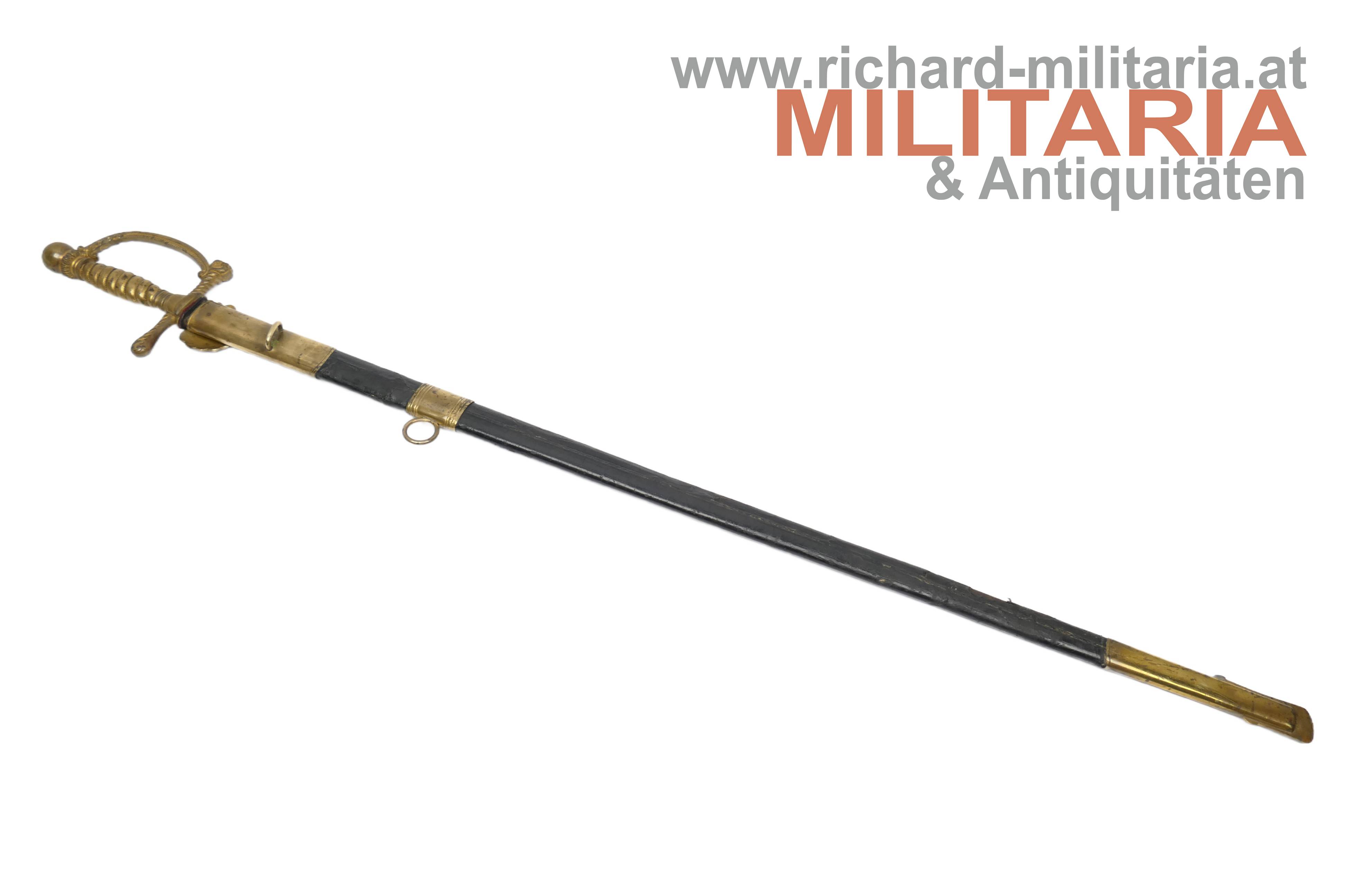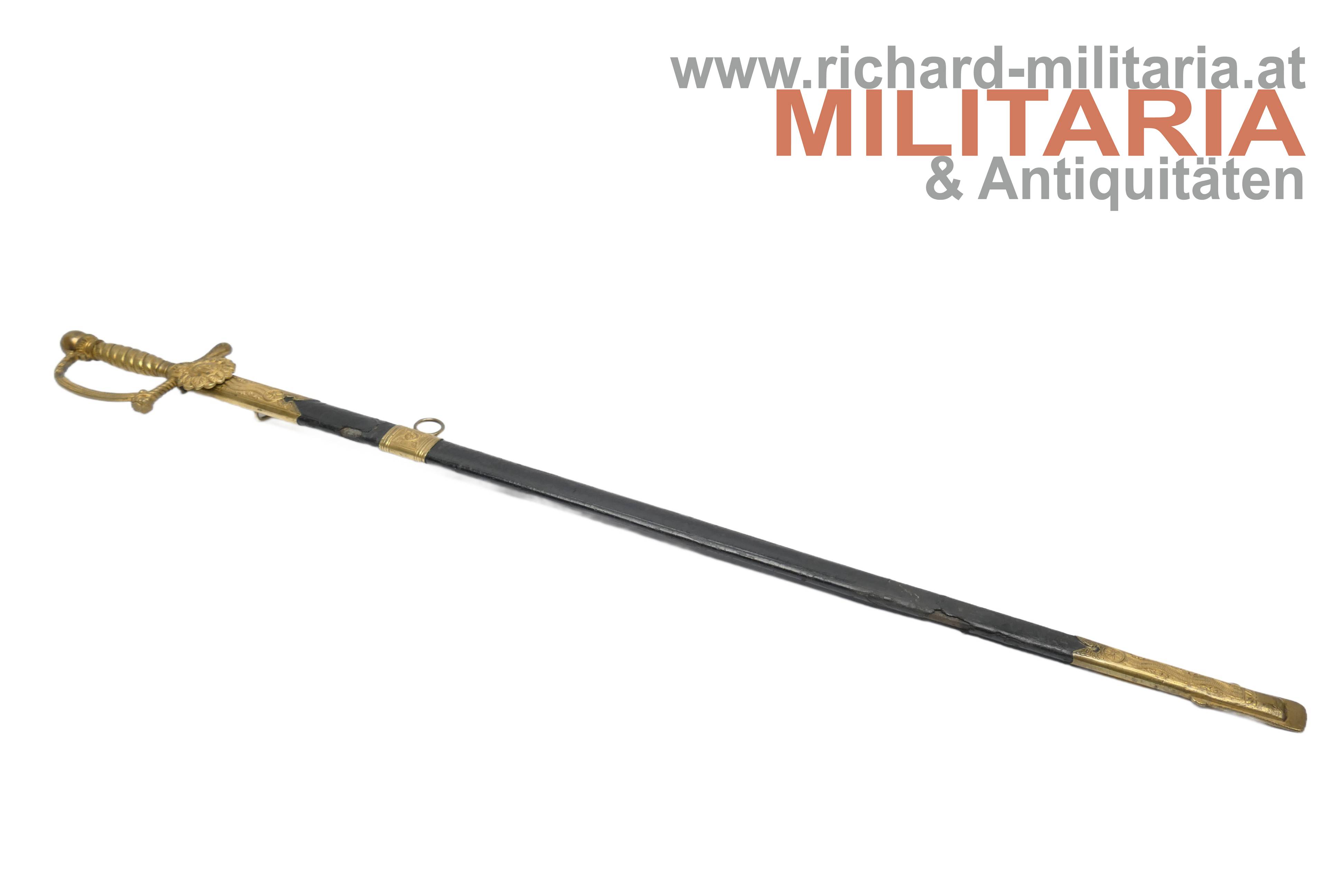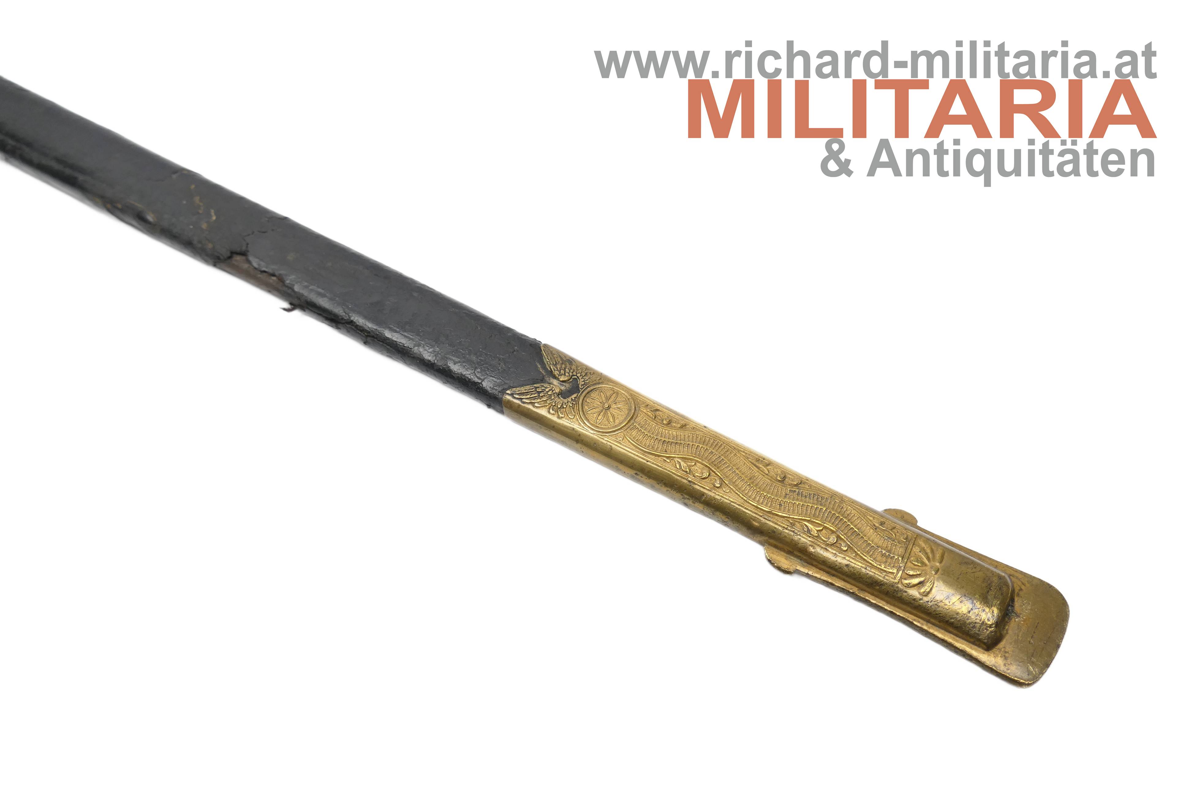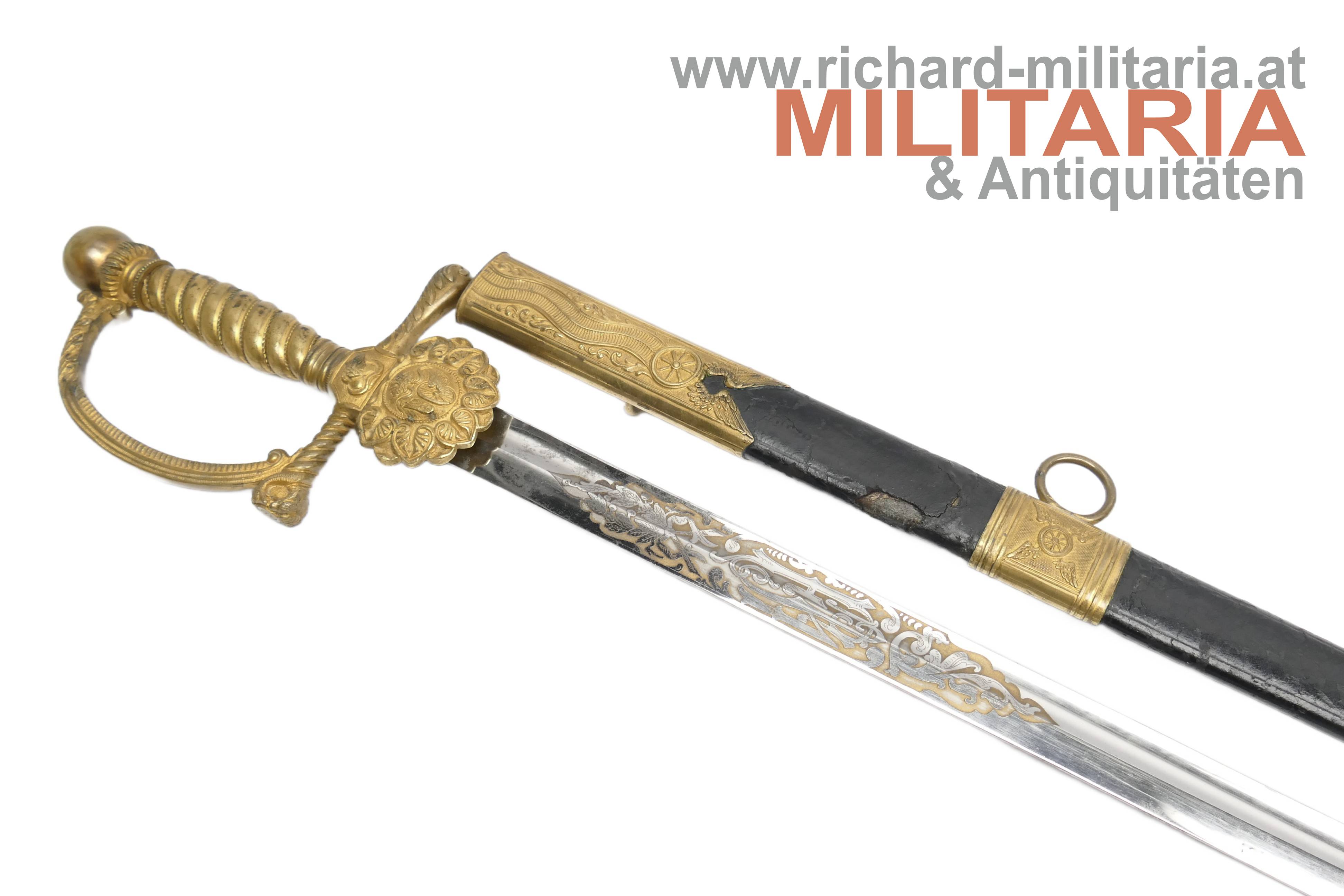 k.k. Degen für Eisenbahnbeamte der Staatsbahnen M1891; unüblich lange massive Rückenklinge; vernickelt und beidseitig gekehlt; im oberen Drittel der Klinge beidseitg eine Klingenätzung mit Goldtauschierung (!); der Allerhöchste Namenszug "FJ1" und auf der anderen Seite der kaiserlicher Doppeladler jeweils mit floralen Verzierungen; Klinge in sehr guter Erhaltung; vergoldetes Bügelgefäß; am Stichblatt das geflügelte Rad überhöht von der Kaiserkrone; der Knauf ist bei diesem Stück komplett glatt ausgeführt; üblicherweise wird der Knauf als Weltkugel ausgeführt; original belderte Scheide; Beldererung mit zwei Fehlstellen; vergoldete Messingbeschläge; unüblich lange Ausführung;