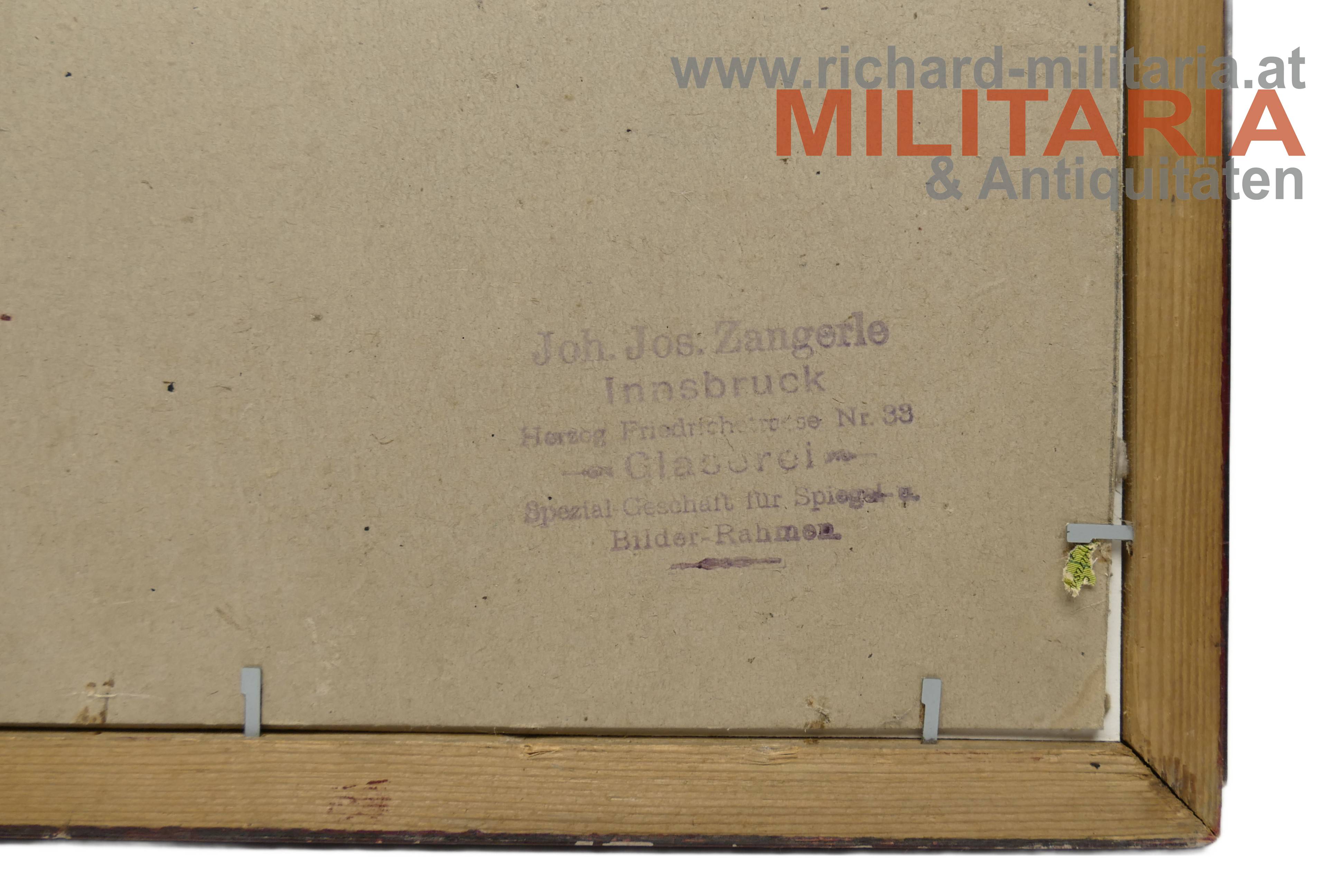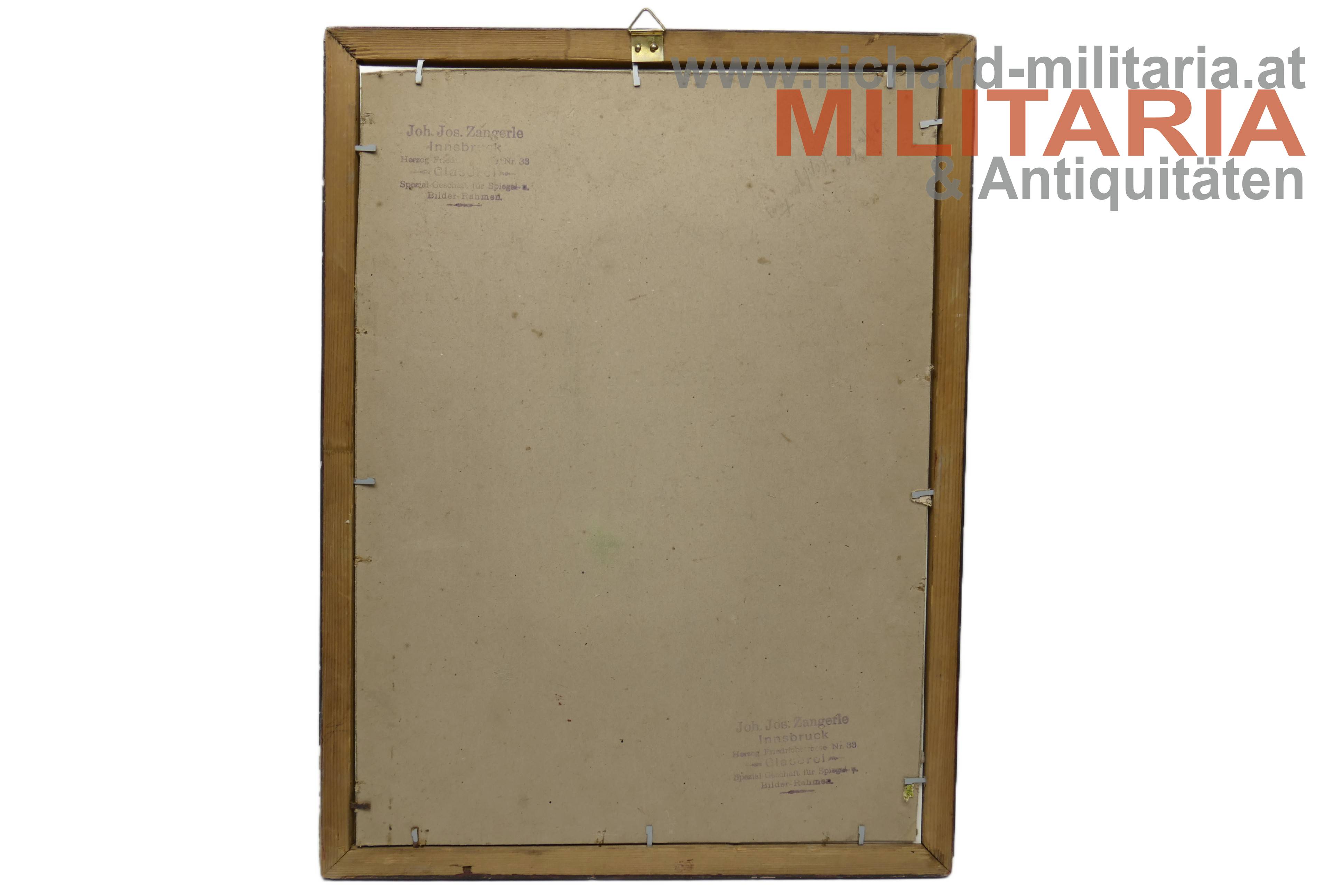 k.k. Portrait des Eisenbahndirektors Dr. Hermann Tschigg-Frey mit persönlicher Widmung; Foto mit Ordensschmuck; u.a. Franz Joseph-Orden Komtur; gewidmet an einen Inspektor Oskar Wehr; "Teschen 16. X. 1918"; hinter Glas; in rotem Holzrahmen mit goldenen Randverzierungen; Aufhängevorrichtung und zweimal die Stempelung eines Innsbrucker Bilderrahmenherstellers revers;