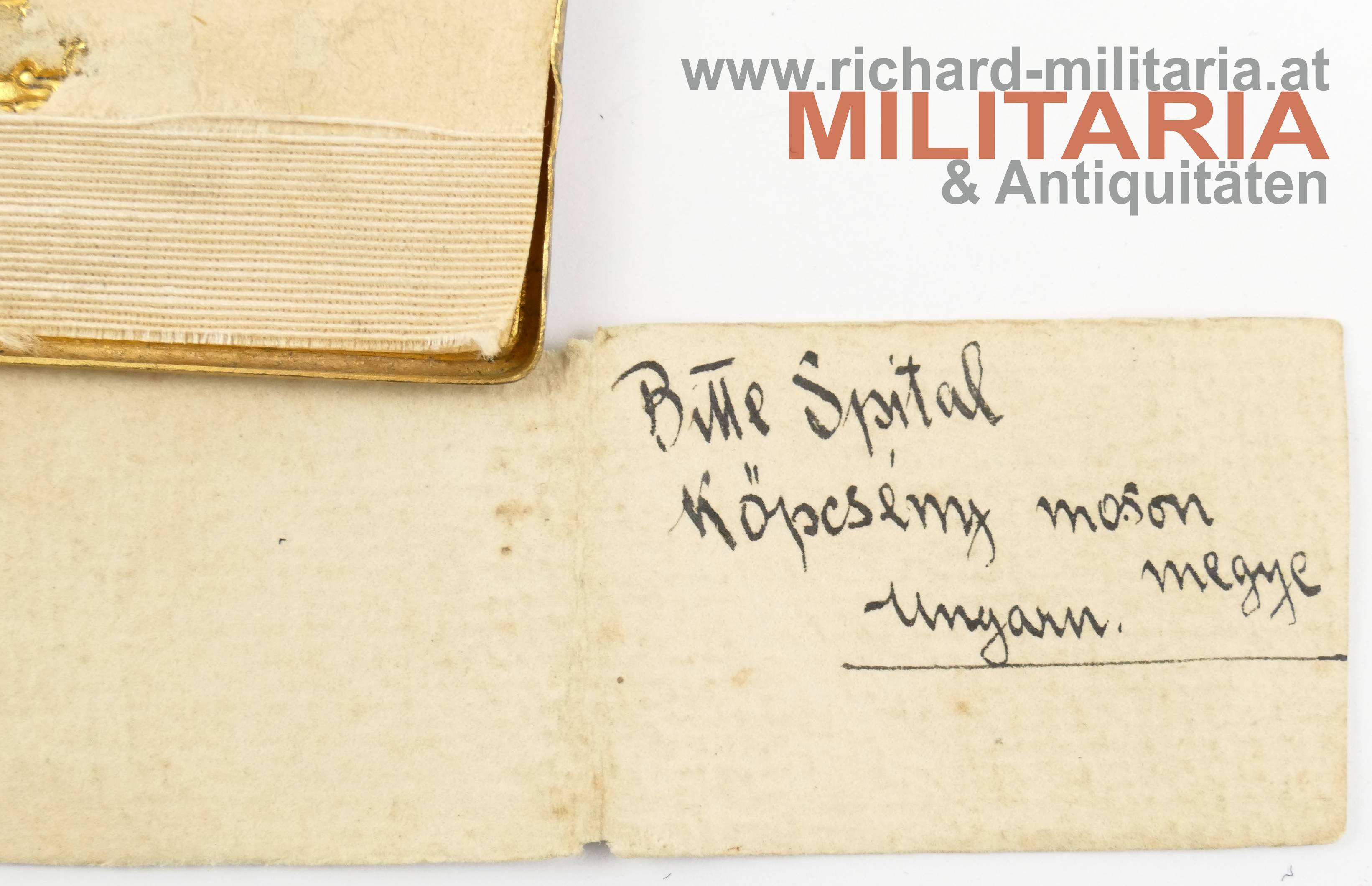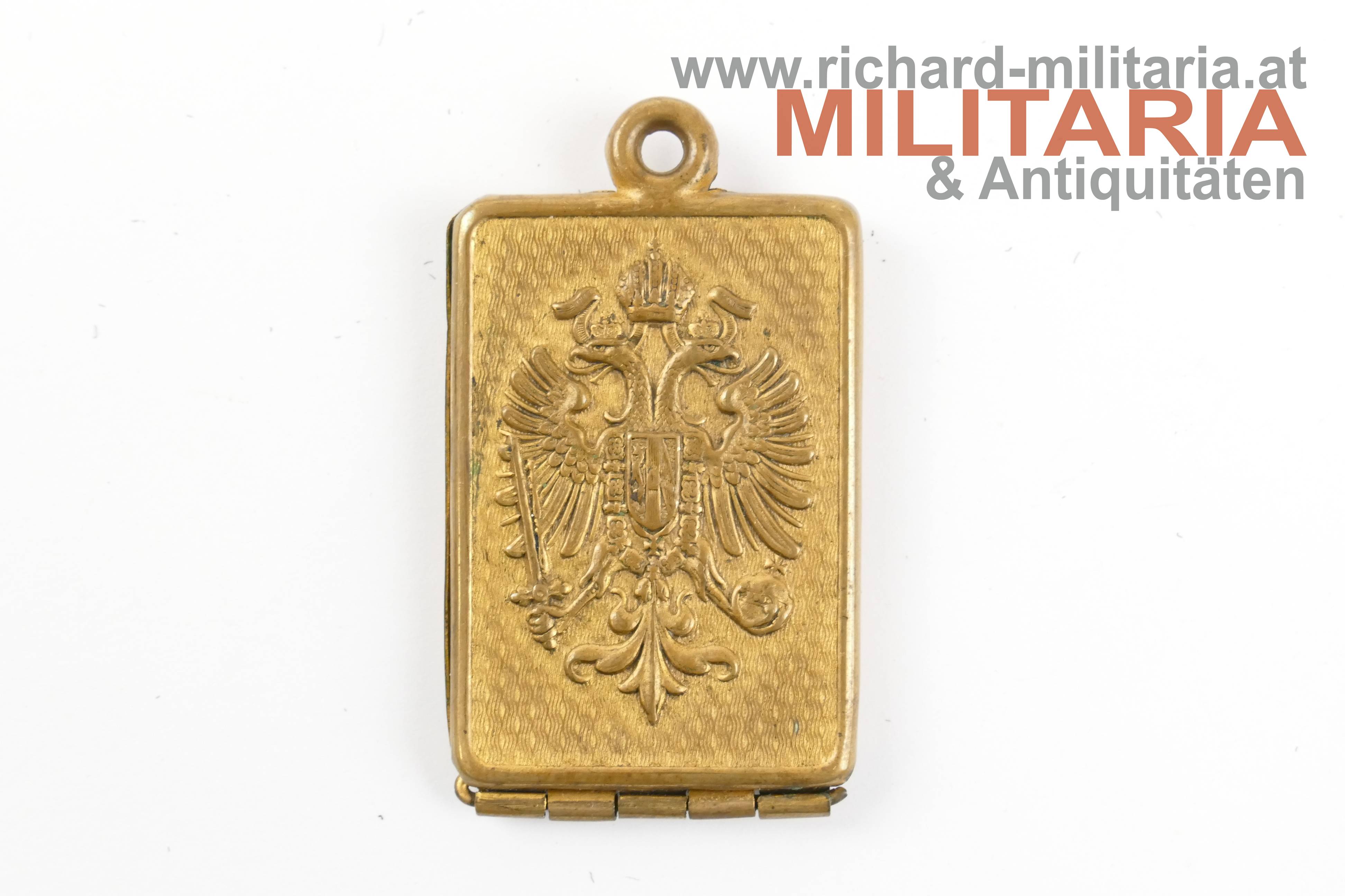k.k. Erkennungsmarke für Offiziere des Graf Max Coreth (von Coredo zu Starkenberg) als Leutnant beim kk. Landwehrulanenregiment 6 - 8. Eskadron; Kapsel aus Tombak mit viel Restvergoldung; beide Innenseite ausgekleidet;