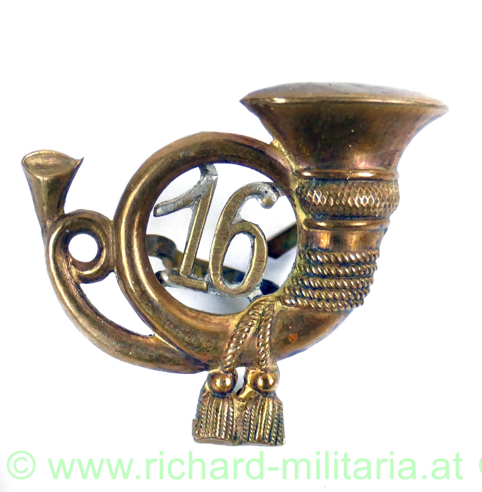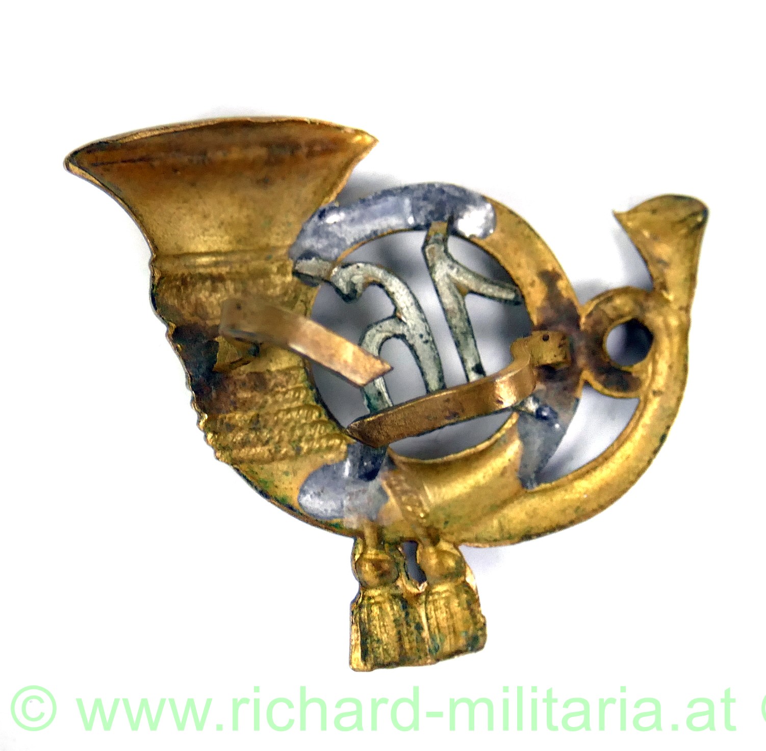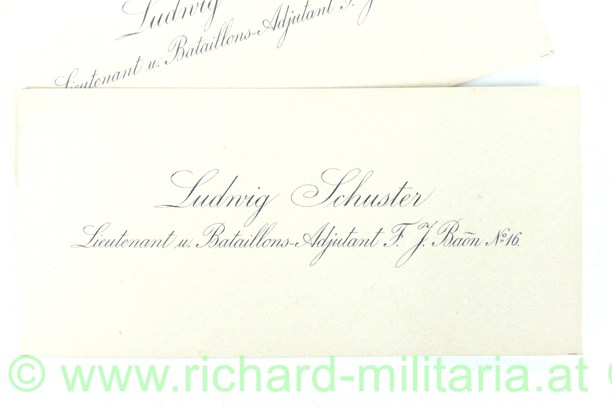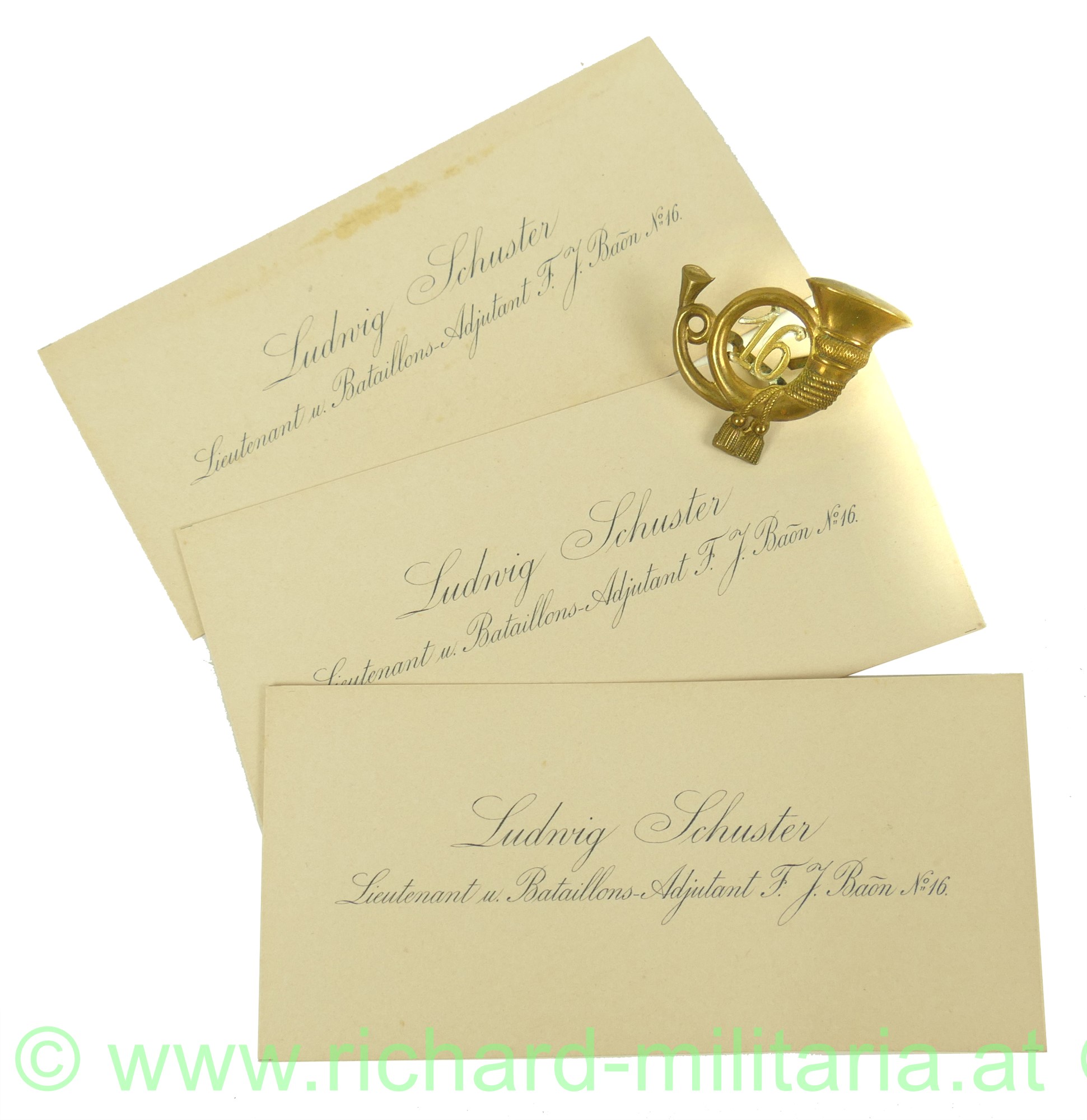3 Visitkarten und ein Jägerhorn vom k.k. FeldjägerBaon Nr. 16; Visitkarten von "Ludwig Schuster; Lieutenant u. Bataillons-Adjutant F.J. Baon N. 16"; Jägerhorn für die Kappe; guter Zustand mit originalen Klammern auf der Rückseite;