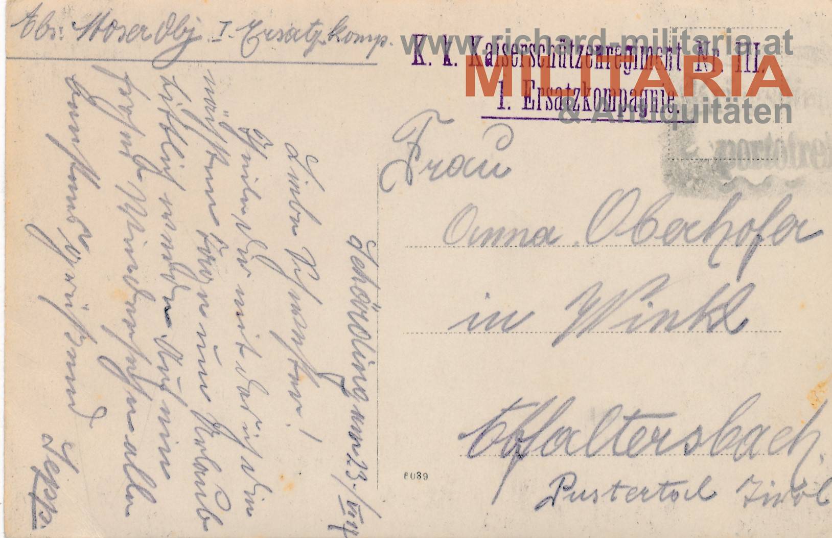 k.k. Foto - Kaiserschützenregiment Nr. 3 - 1. Ersatzkompagnie; Postkartenformat; Text datiert auf 23. Juni 1917;