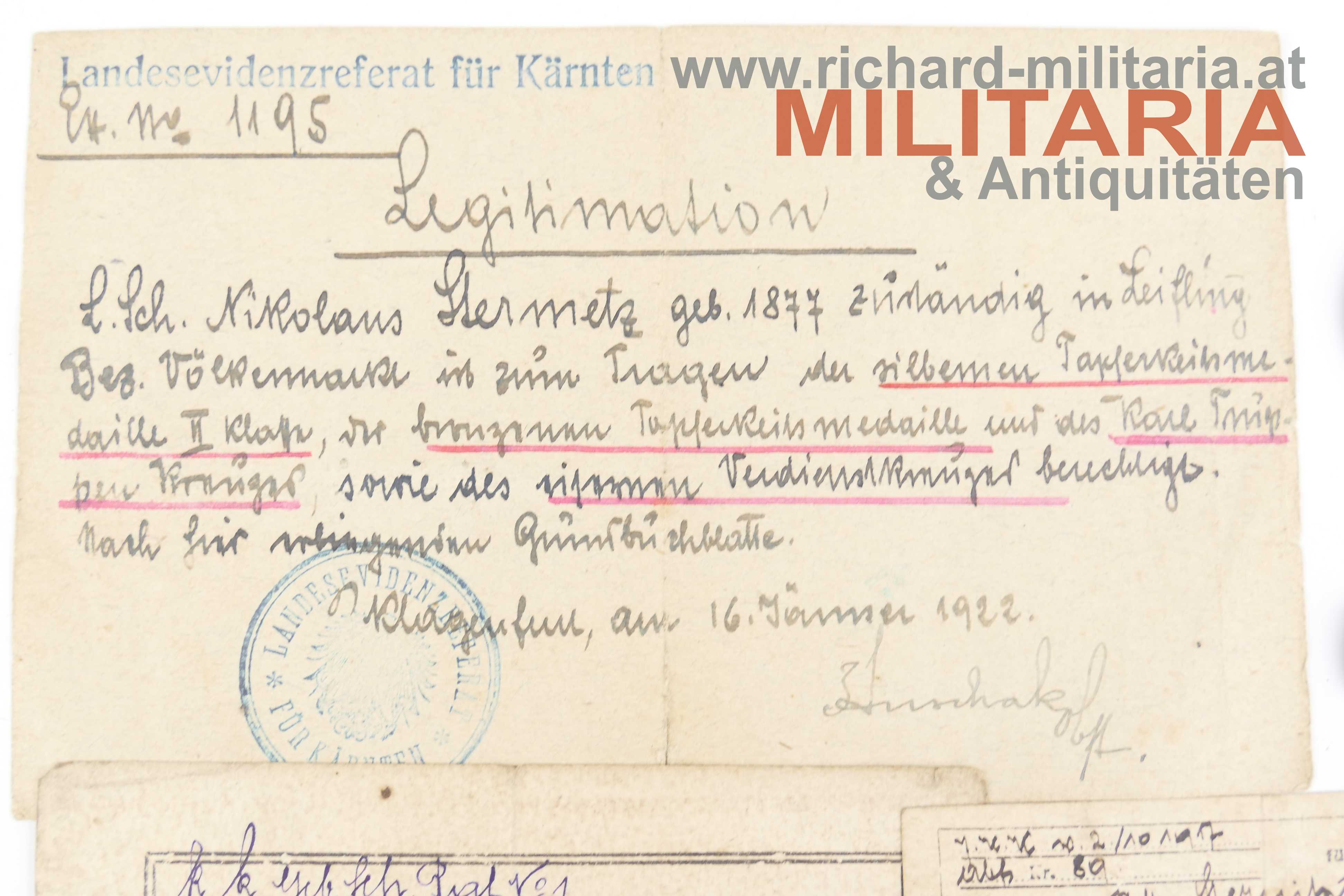- Bestätigung / Legitimation vom Landesevidenzeferat in Kärnten (1922) zum Tragen der Silbernen und bronzenen Tapferkeitsmedaille, des Karl Truppenkreuzes und des Eisernen Verdienstkreuzes.