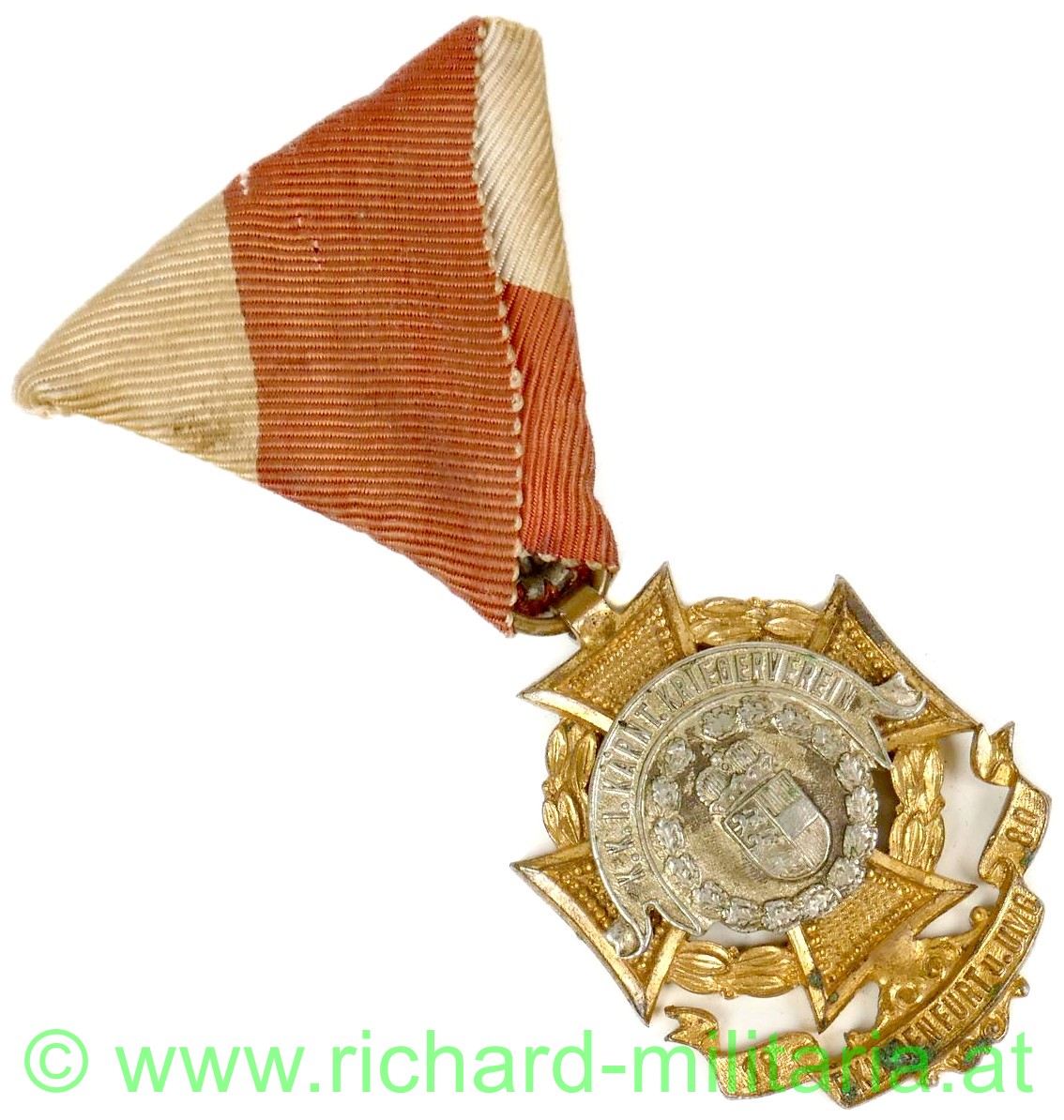 k.k. I. Kärnt. Kriegerverein 1880 f. Klagenfurt u. Umgebung - Mitgliedsauszeichnung, 4-armiges Kreuz aus Tombak vergoldet mit integriertem Schriftband: "1880 - f. Klagenfurt u. Umgebung", aufgenietetes silbernes Mittelmedaillon: "K.K. I. Kärnt. Kriegerverein." mit Kärntner Wappen; am weiß/roten Dreiecksband