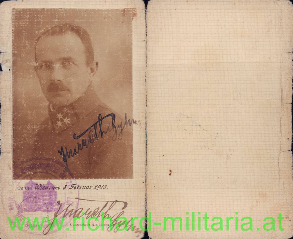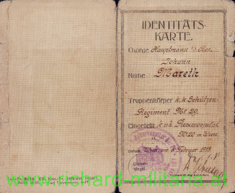 k.k. Identitätskarte des Hauptmann Johann Mareth beim Schützen-Regiment Nr. 29; eingeteilt beim k.u.k. Reservespital Nr. 20 in Wien; ausgestellt am 8. Februar 1918; innen mit einem Bild und zwei Unterschriften von ihm; doppelt gestempelt;