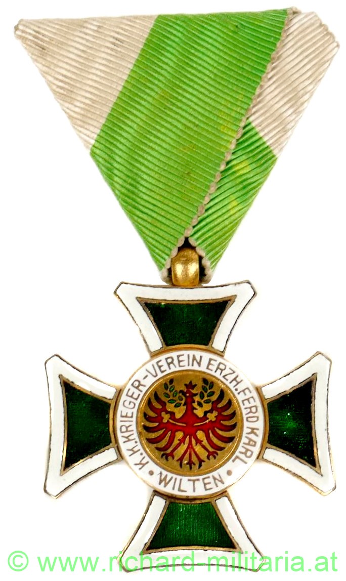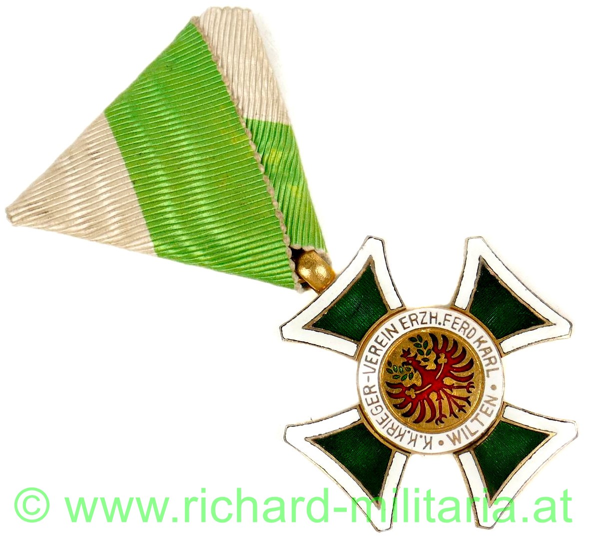 k.k. Krieger-Verein Erzh. Ferd. Karl - Wilten - Kreuz, Tombak vergoldet emailliert, aufgesetztes Mittelmedaillon: "k.k. Krieger-Verein Erzh. Ferd. Karl WILTEN", 4 armiges Kreuz, mit weiß/grünem Dreiecksband;