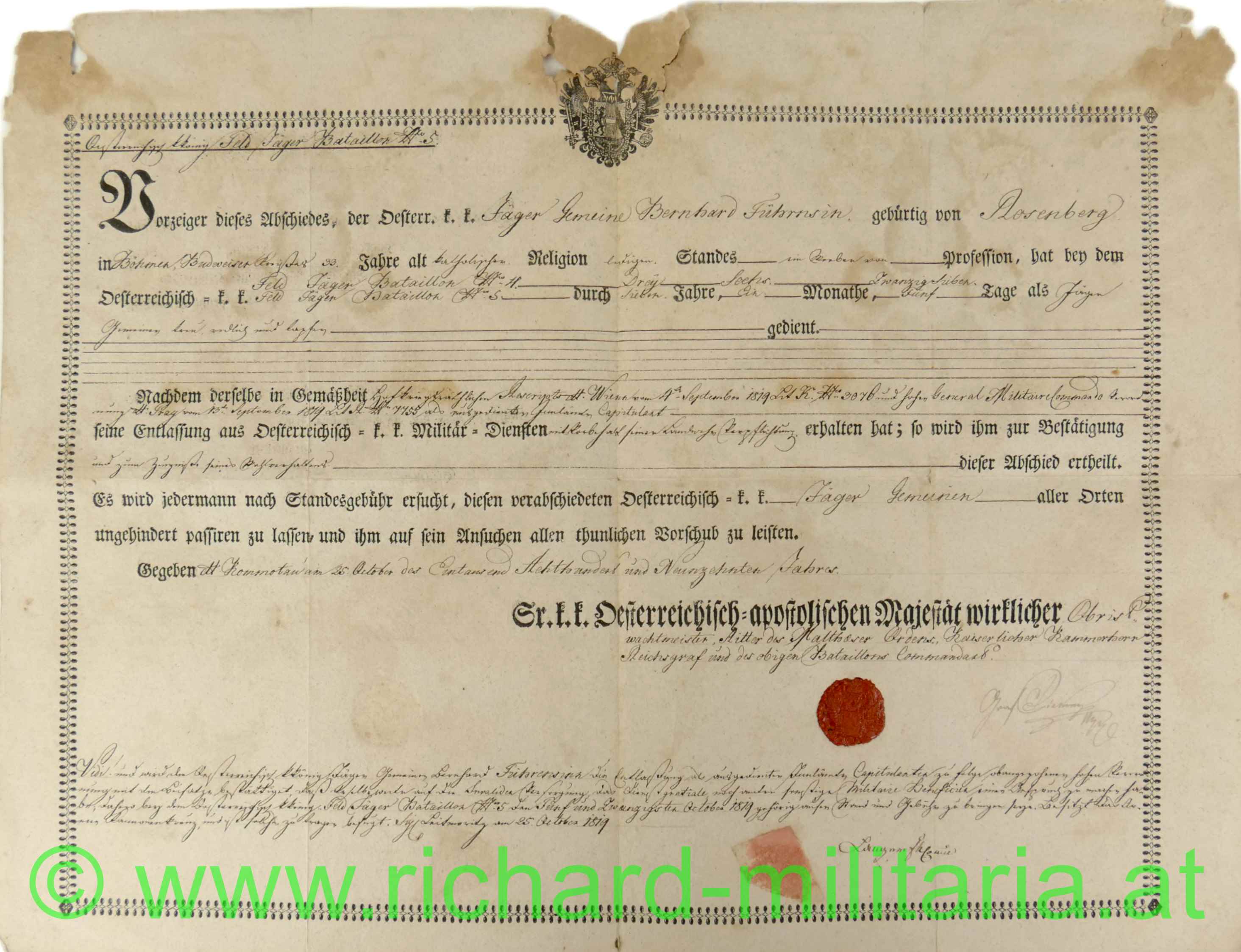 Produktinformationen "k.k. Landsturmabschied Bernhard Führsin - 1819 - Feld-Jäger-Baon Nr. 5 / Nr. 18"