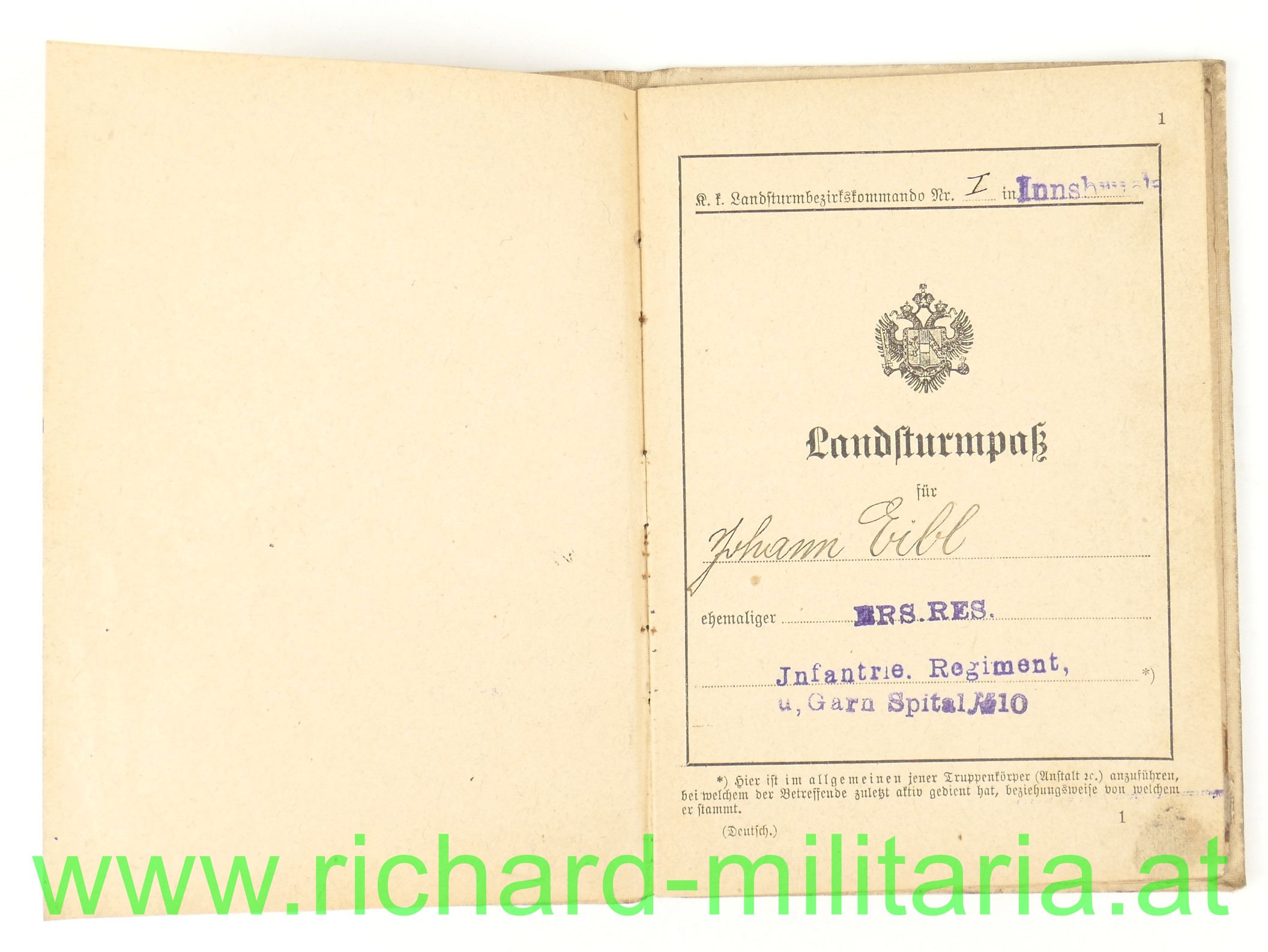Produktinformationen "k.k. Landsturmpass Innsbruck Garn.Spital Nr. 10"