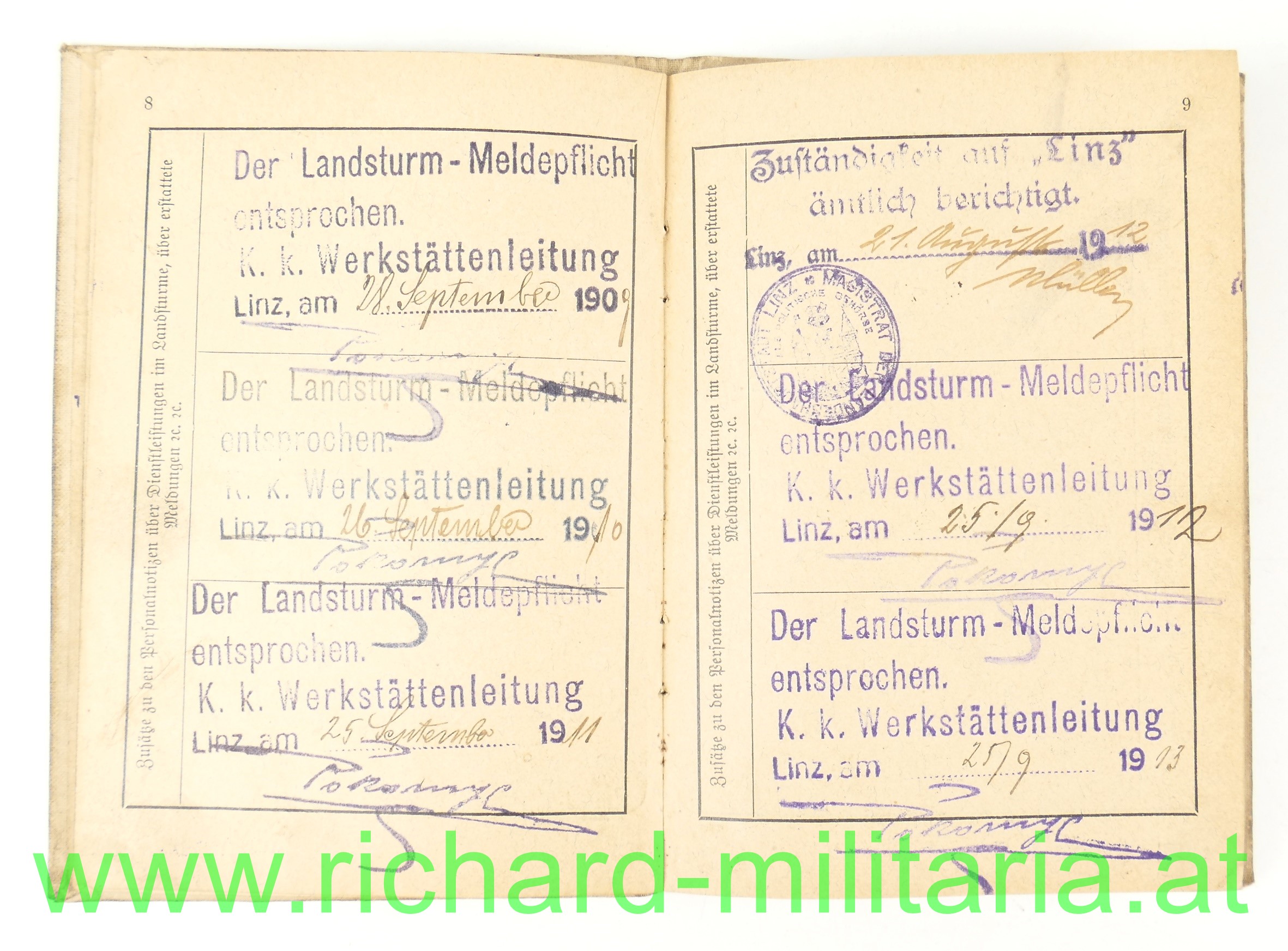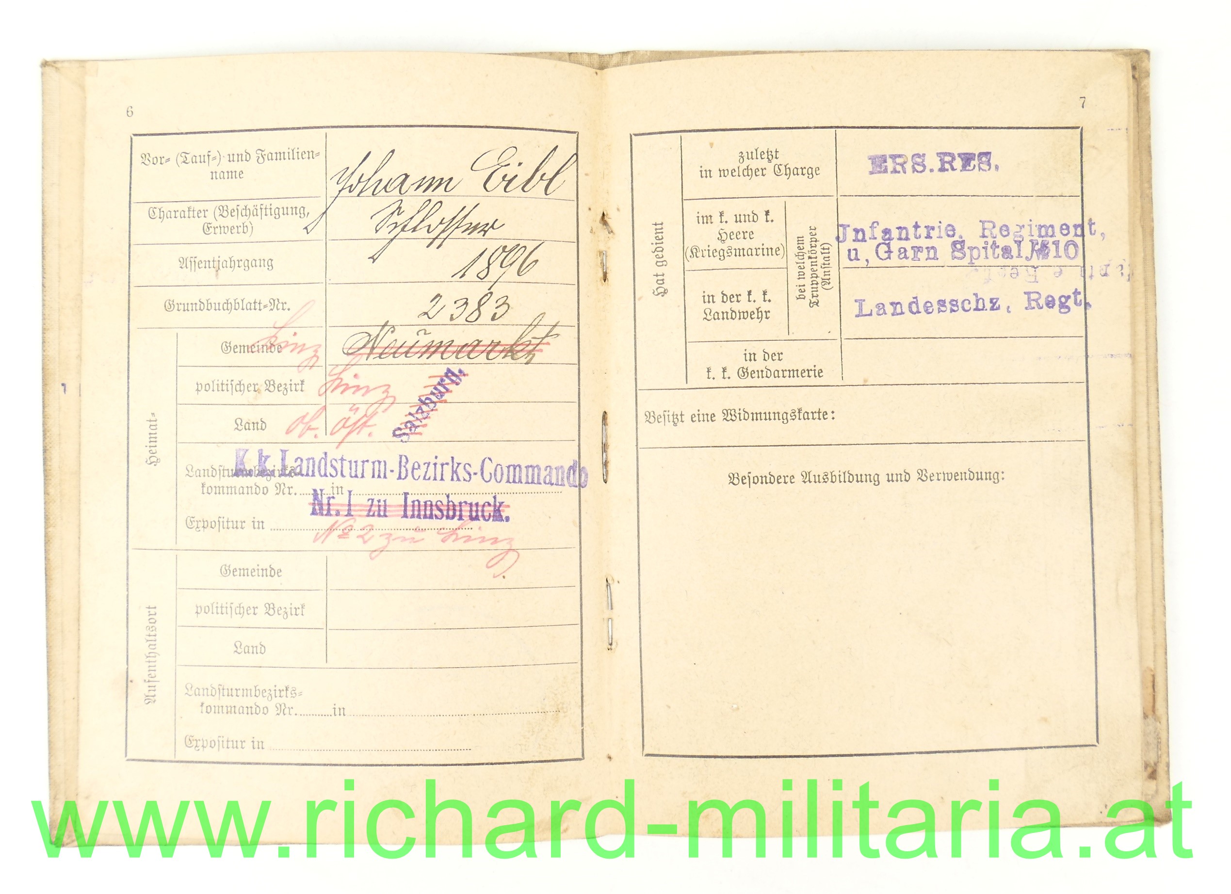 Landsturmpass des k.k. Landsturmbezirkskommandos Nr. I in Innsbruck für Johann Eibl, Ers.Res. beim Infanterie Regiment u. Garn. Spital Nr. 10; vollständig mit einigen Eintragungen und Beilagen; ausgestellt 1908; landsturmpflichtig bis 1913