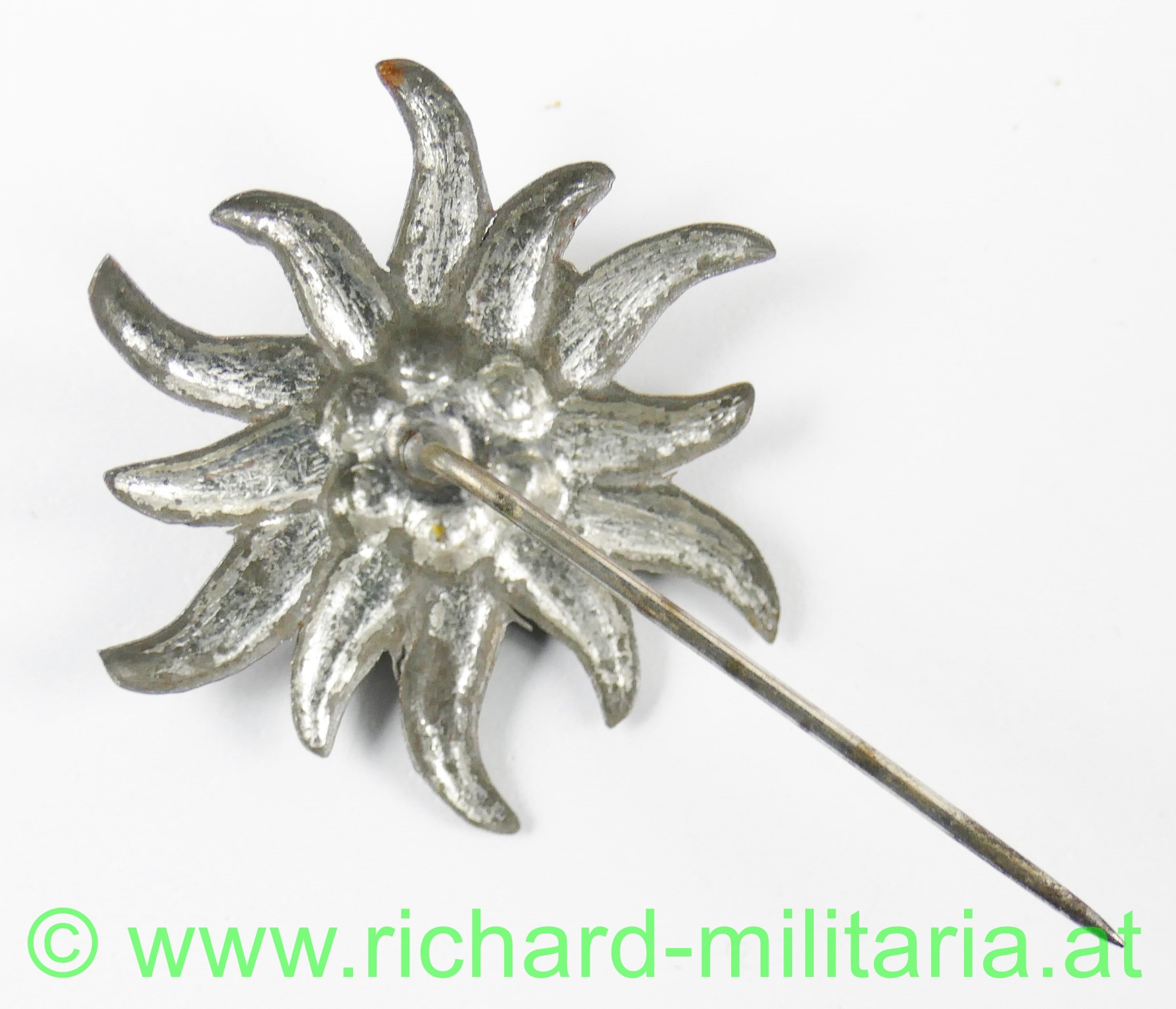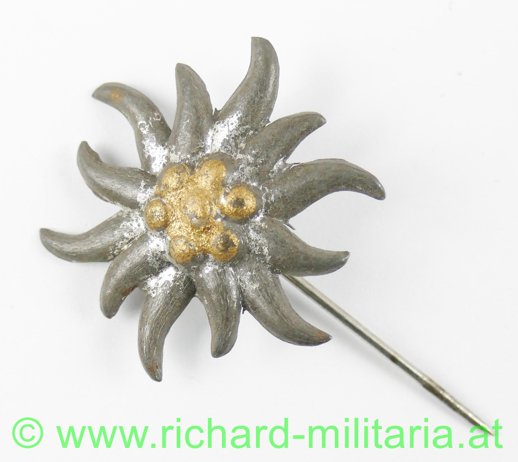 Edelweiss zum Anstecken der k.k. Landwehr Gebirgstruppen aus dem 1. Weltkrieg, Eisenblech mit vergoldeter Blütenmitte, Anstecknadel, Durchmesser des Edelweiss 27,7 mm (breiteste Stelle)