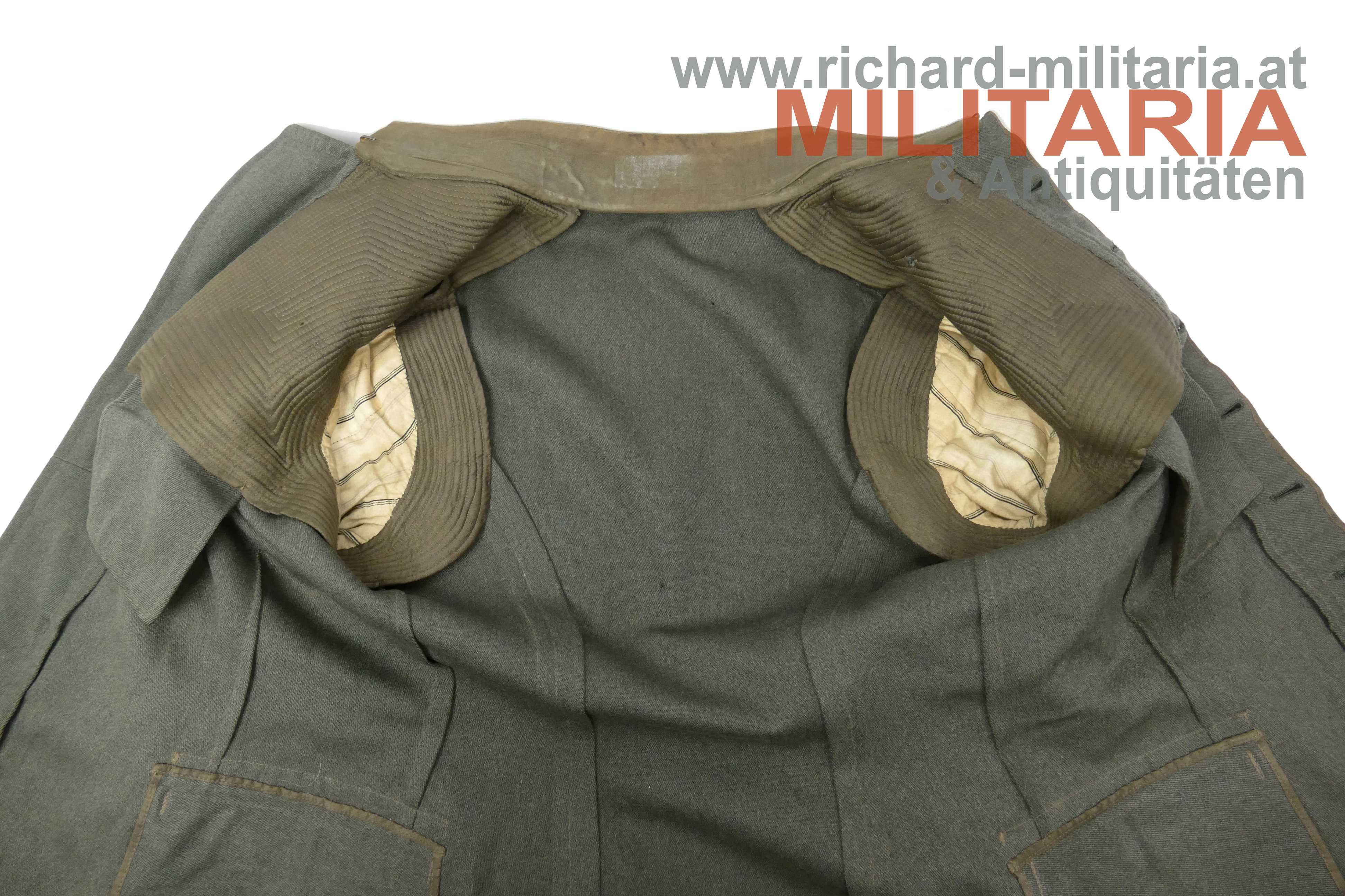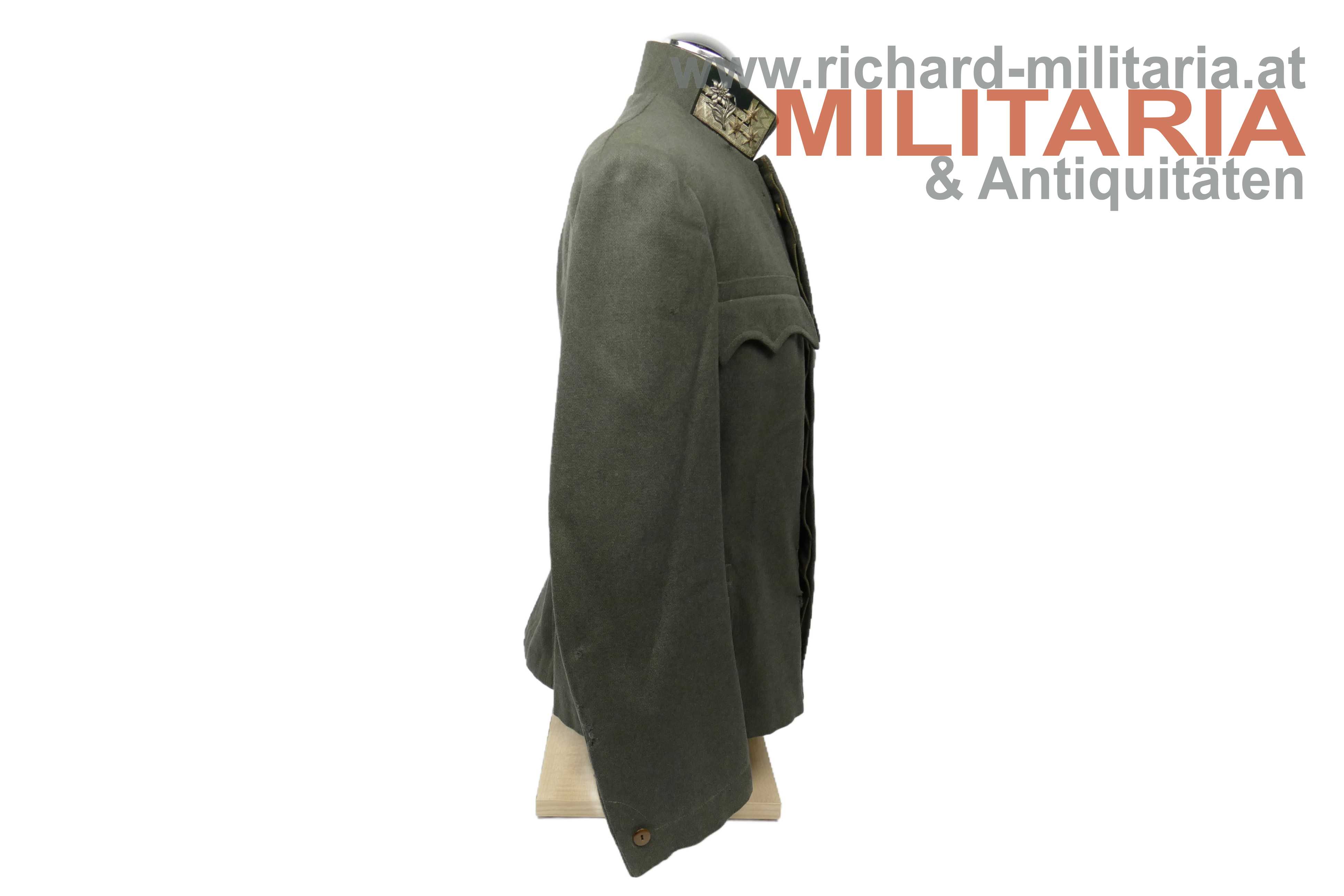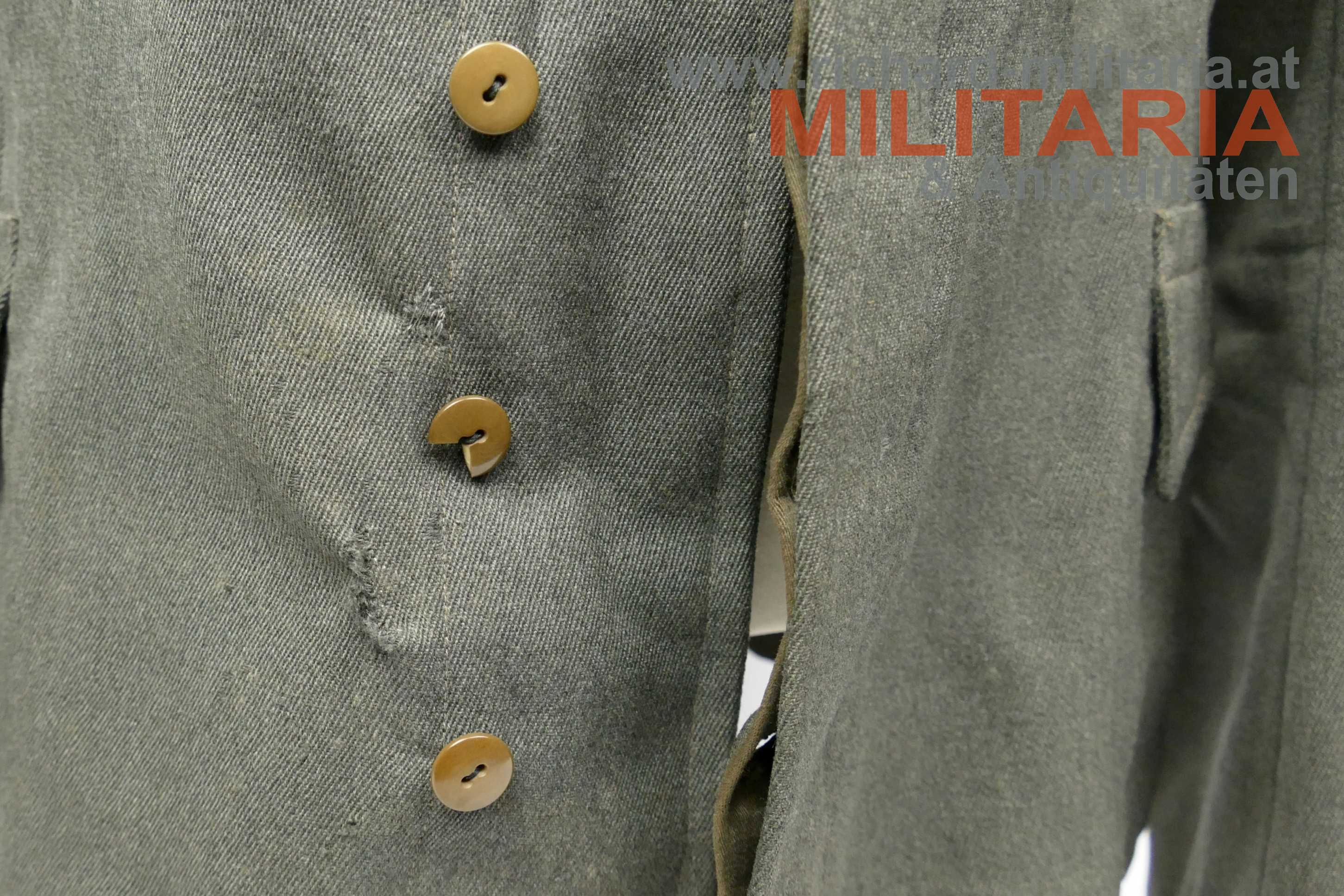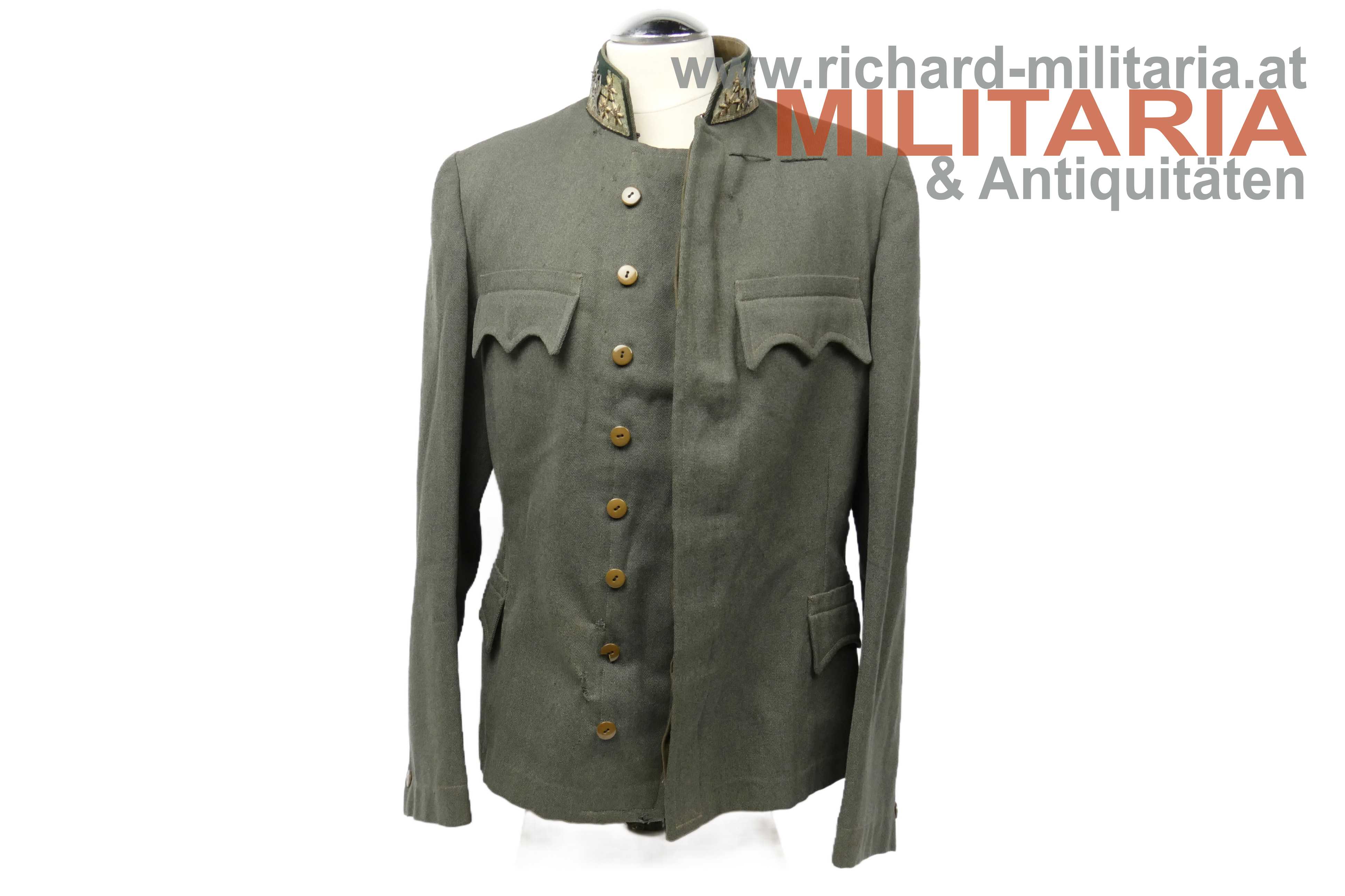 k.k. feldgraue Bluse eines Stabsoberjägers der Landwehr-Gebirgstruppen; Bluse aus feldgrauem Kammgarn; dunkelgrüne Kragenspiegel mit einer 3cm breiten Silberborte sowie einem 0,5cm breiten, dessiniertem Silberbörtchen; darüber drei gestickten Seidensterne sowie die Kragenedelweiss der Landwehr-Gebirgstruppen; einreihig zu 8 braunen Hornknöpfen; der zweite Knopf von unten beschädigt; an den Ärmeln ebenfalls je ein brauner Hornknopf; eingesetzte voll ausgeführte Brust- und Schoßtaschen; auf der linken Brust zwei Wollschlaufen für Auszeichnungen; Bluse innen ungefüttert und nur im Bereich der Ärmel verstärkt; kleinere Mottenlöcher und -aufrauungen sowie kleinere Reparaturstellen; Wie für Stabsoberjäger vorgeschrieben - keine Achselspange!
