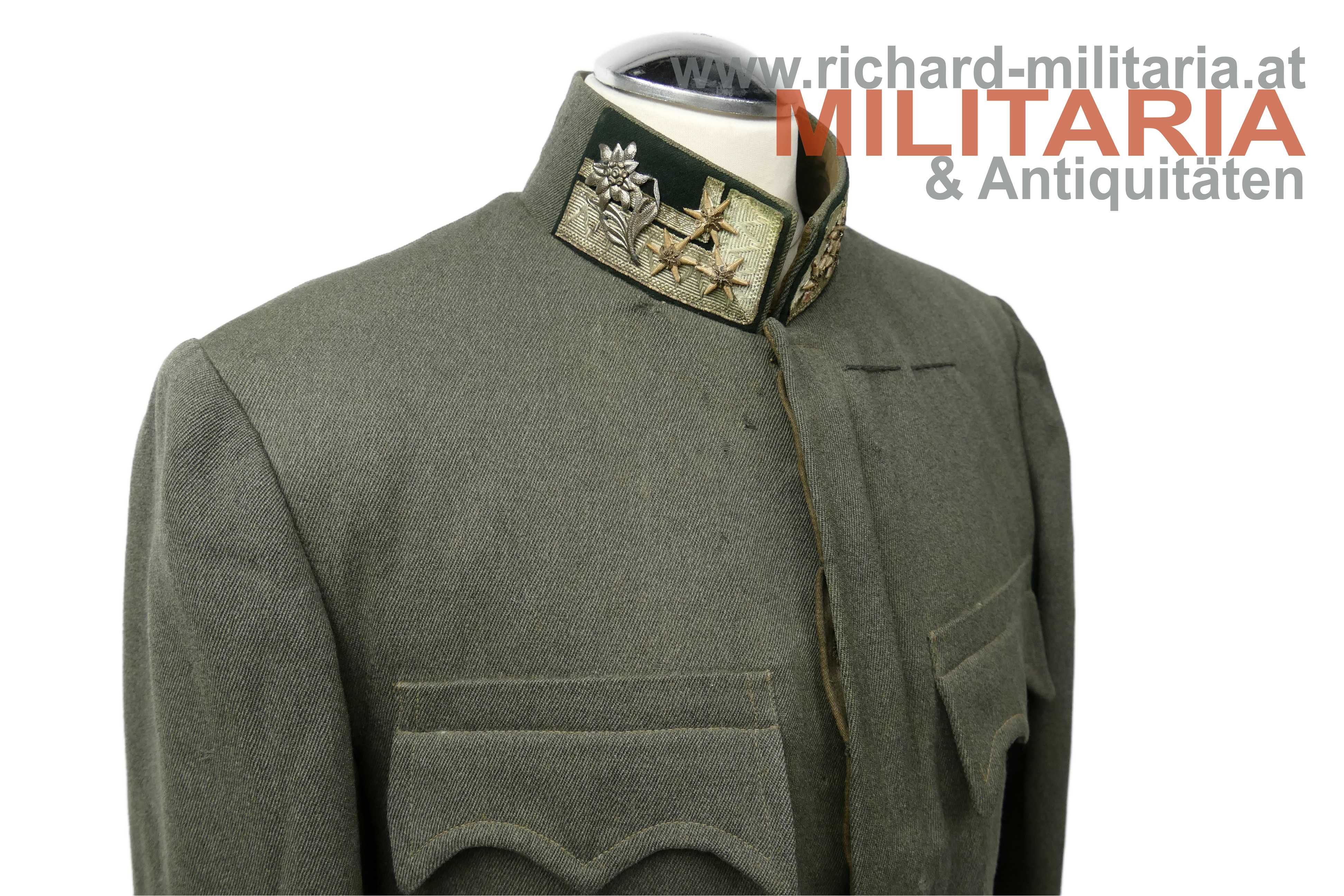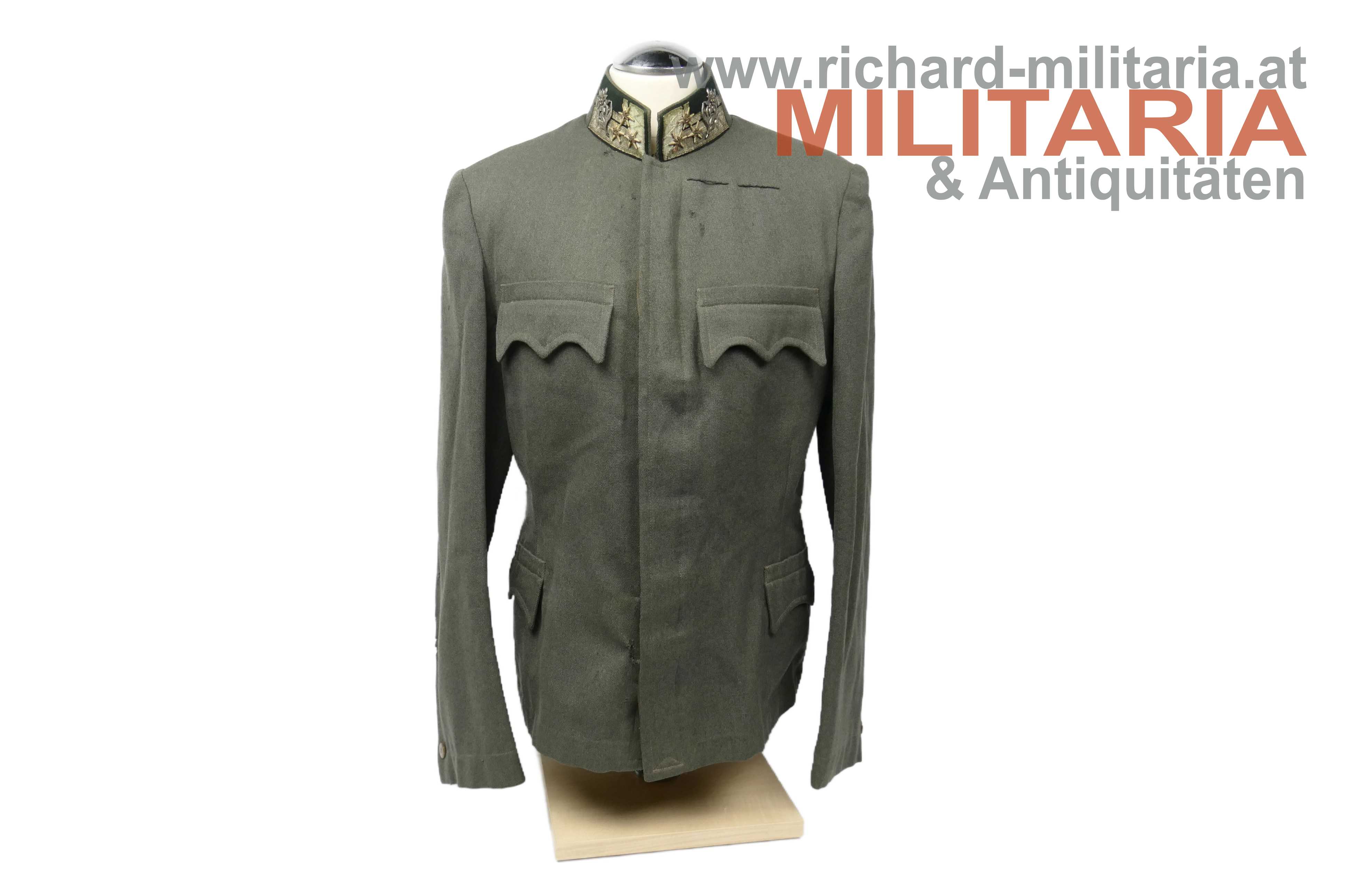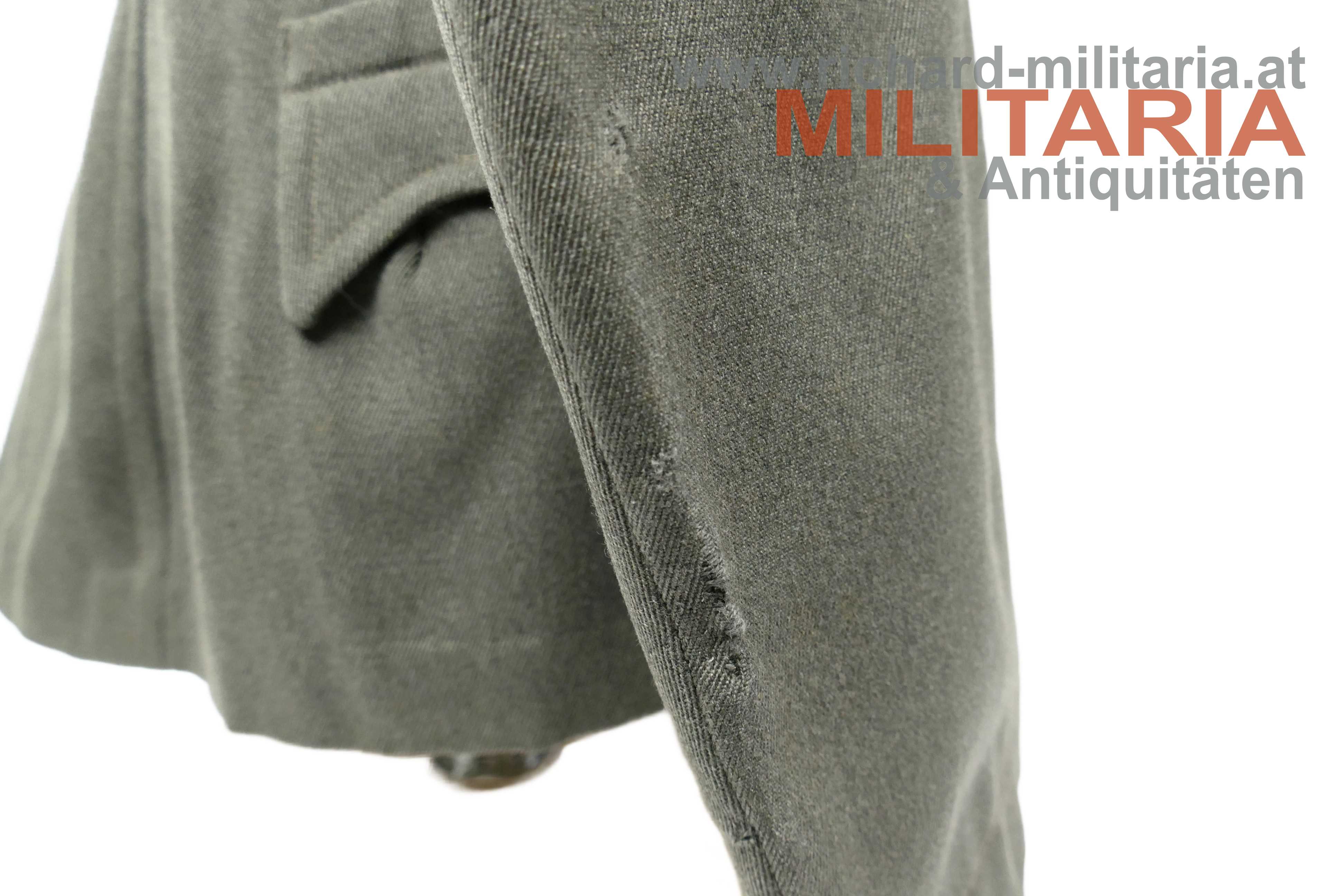k.k. feldgraue Bluse eines Stabsoberjägers der Landwehr-Gebirgstruppen; Bluse aus feldgrauem Kammgarn; dunkelgrüne Kragenspiegel mit einer 3cm breiten Silberborte sowie einem 0,5cm breiten, dessiniertem Silberbörtchen; darüber drei gestickten Seidensterne sowie die Kragenedelweiss der Landwehr-Gebirgstruppen; einreihig zu 8 braunen Hornknöpfen; der zweite Knopf von unten beschädigt; an den Ärmeln ebenfalls je ein brauner Hornknopf; eingesetzte voll ausgeführte Brust- und Schoßtaschen; auf der linken Brust zwei Wollschlaufen für Auszeichnungen; Bluse innen ungefüttert und nur im Bereich der Ärmel verstärkt; kleinere Mottenlöcher und -aufrauungen sowie kleinere Reparaturstellen; Wie für Stabsoberjäger vorgeschrieben - keine Achselspange!