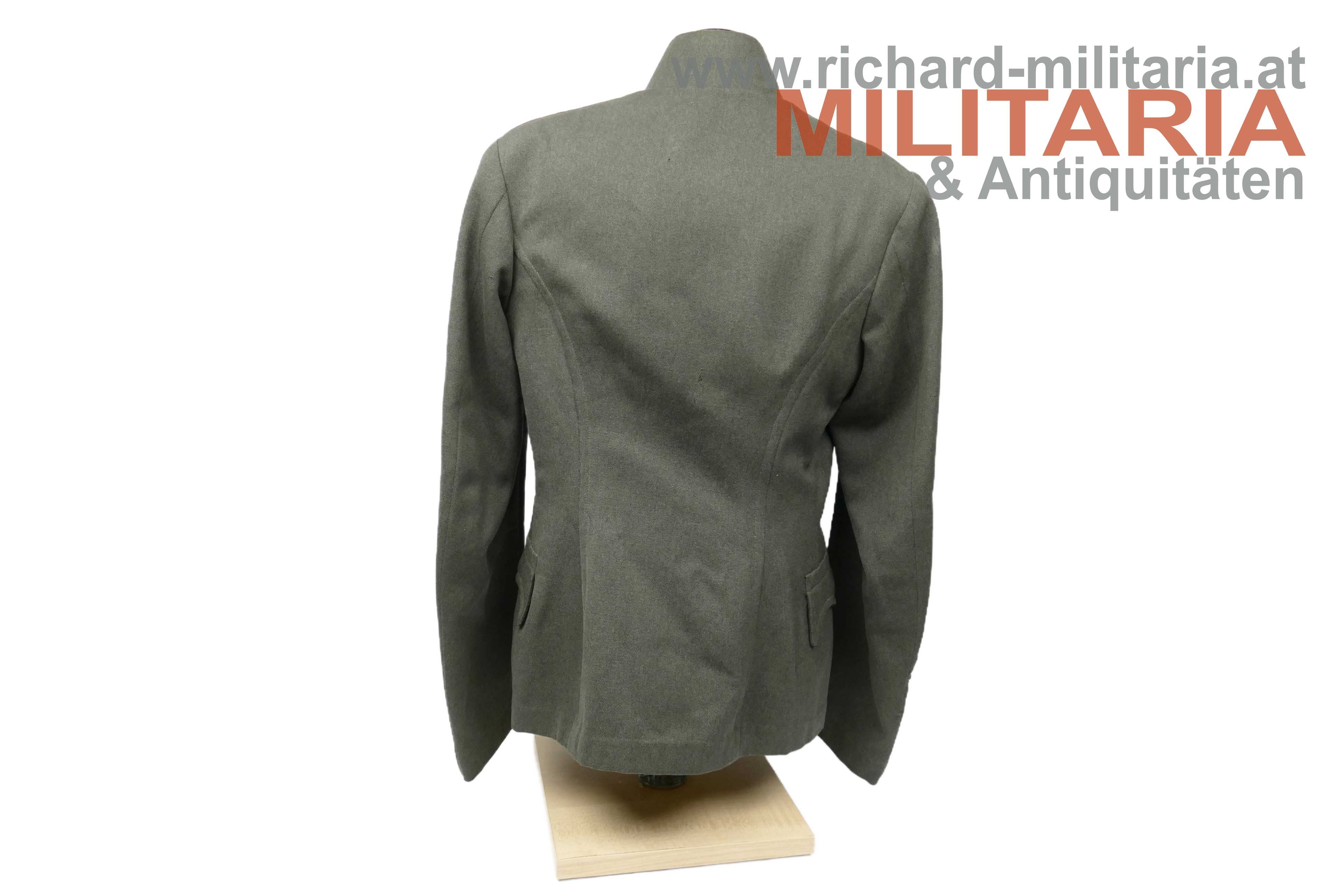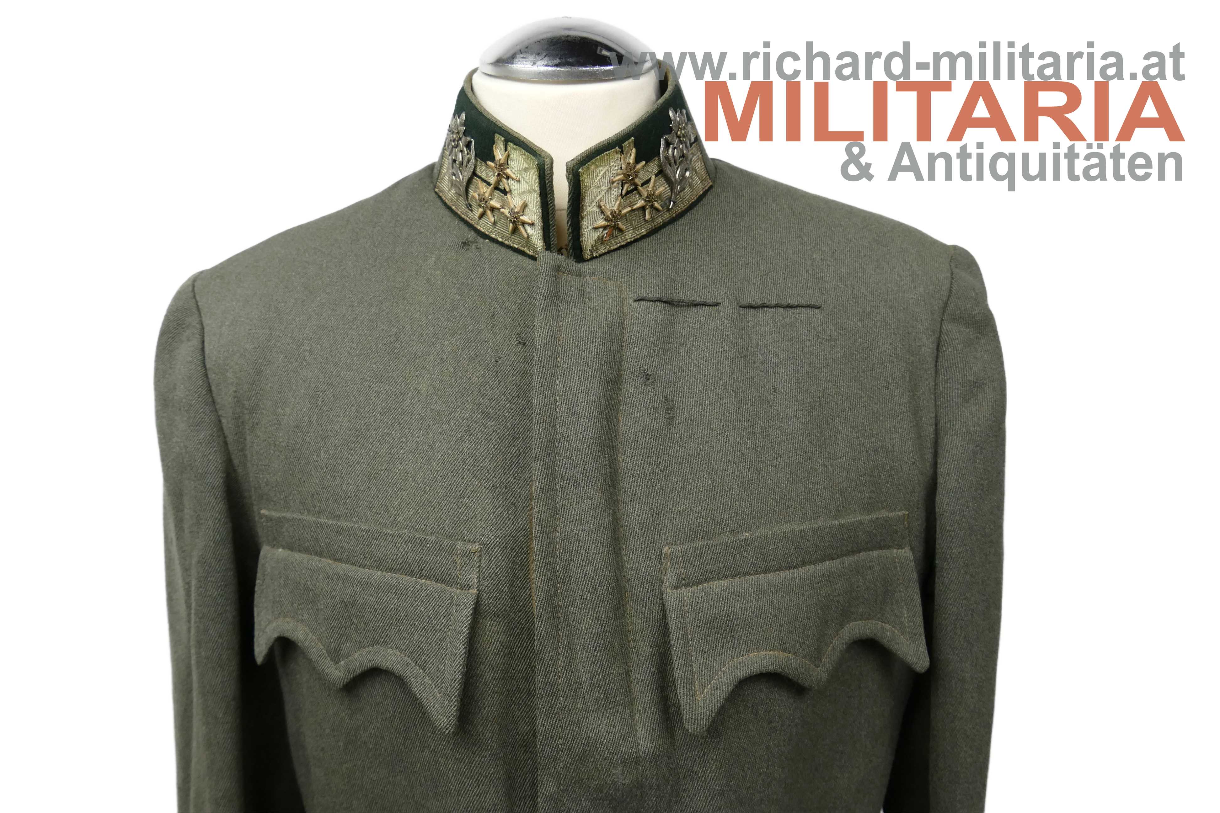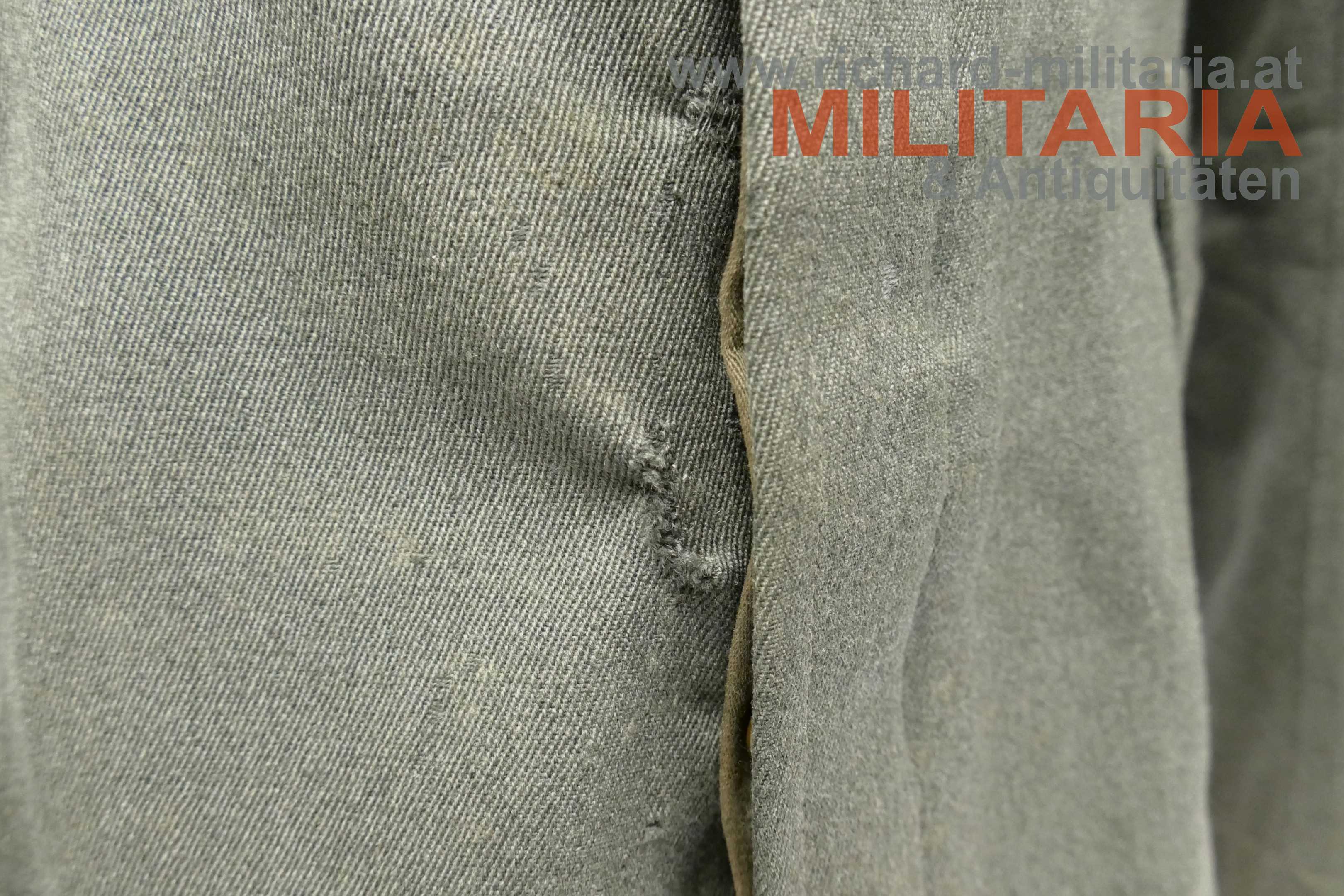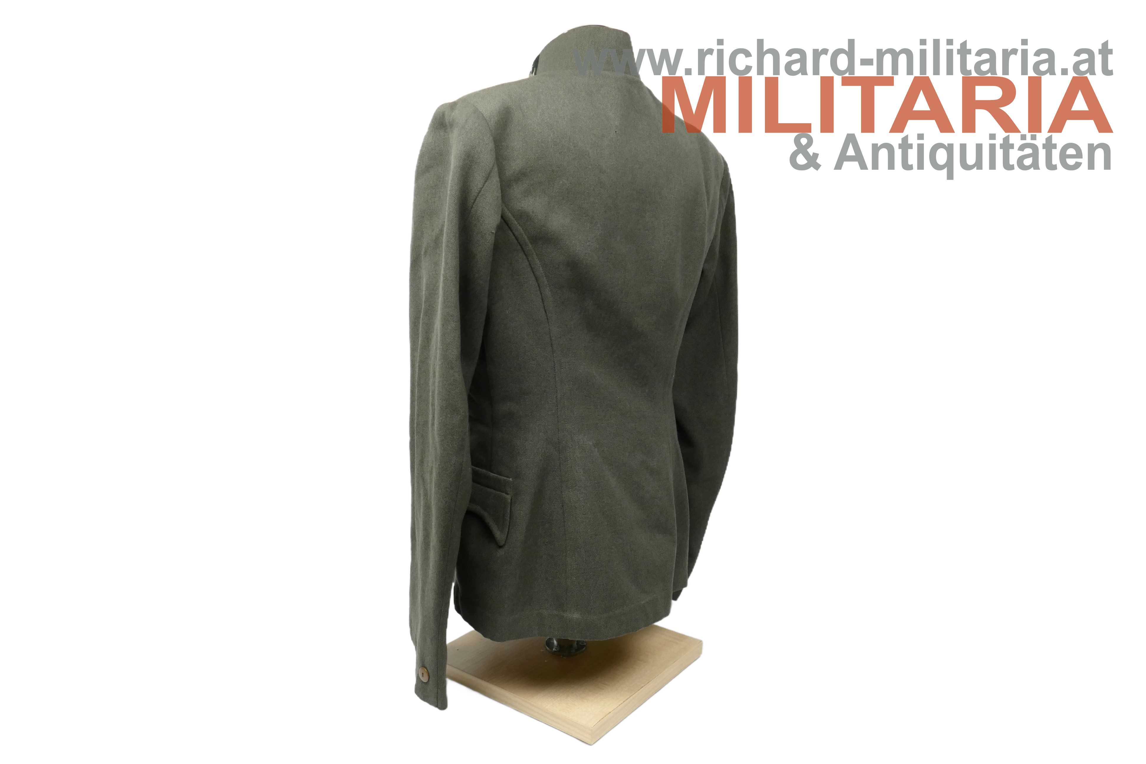 k.k. feldgraue Bluse eines Stabsoberjägers der Landwehr-Gebirgstruppen; Bluse aus feldgrauem Kammgarn; dunkelgrüne Kragenspiegel mit einer 3cm breiten Silberborte sowie einem 0,5cm breiten, dessiniertem Silberbörtchen; darüber drei gestickten Seidensterne sowie die Kragenedelweiss der Landwehr-Gebirgstruppen; einreihig zu 8 braunen Hornknöpfen; der zweite Knopf von unten beschädigt; an den Ärmeln ebenfalls je ein brauner Hornknopf; eingesetzte voll ausgeführte Brust- und Schoßtaschen; auf der linken Brust zwei Wollschlaufen für Auszeichnungen; Bluse innen ungefüttert und nur im Bereich der Ärmel verstärkt; kleinere Mottenlöcher und -aufrauungen sowie kleinere Reparaturstellen; Wie für Stabsoberjäger vorgeschrieben - keine Achselspange!