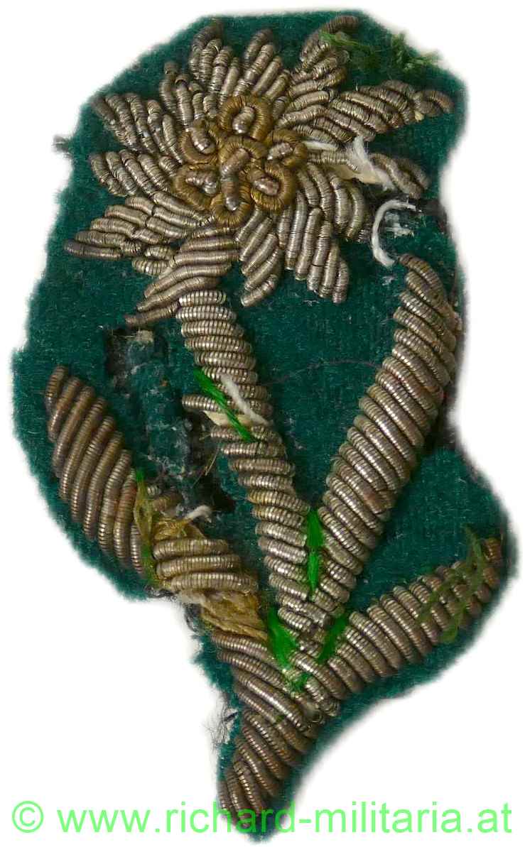 k.k. Landwehr - Gebirgstruppen Edelweiß für den Kragenspiegel; Offiziersausführung - grünes Egalisierungstuch mit silbern aufgesticktem Edelweiß; Abmessungen: ca. 5 x 3 cm;