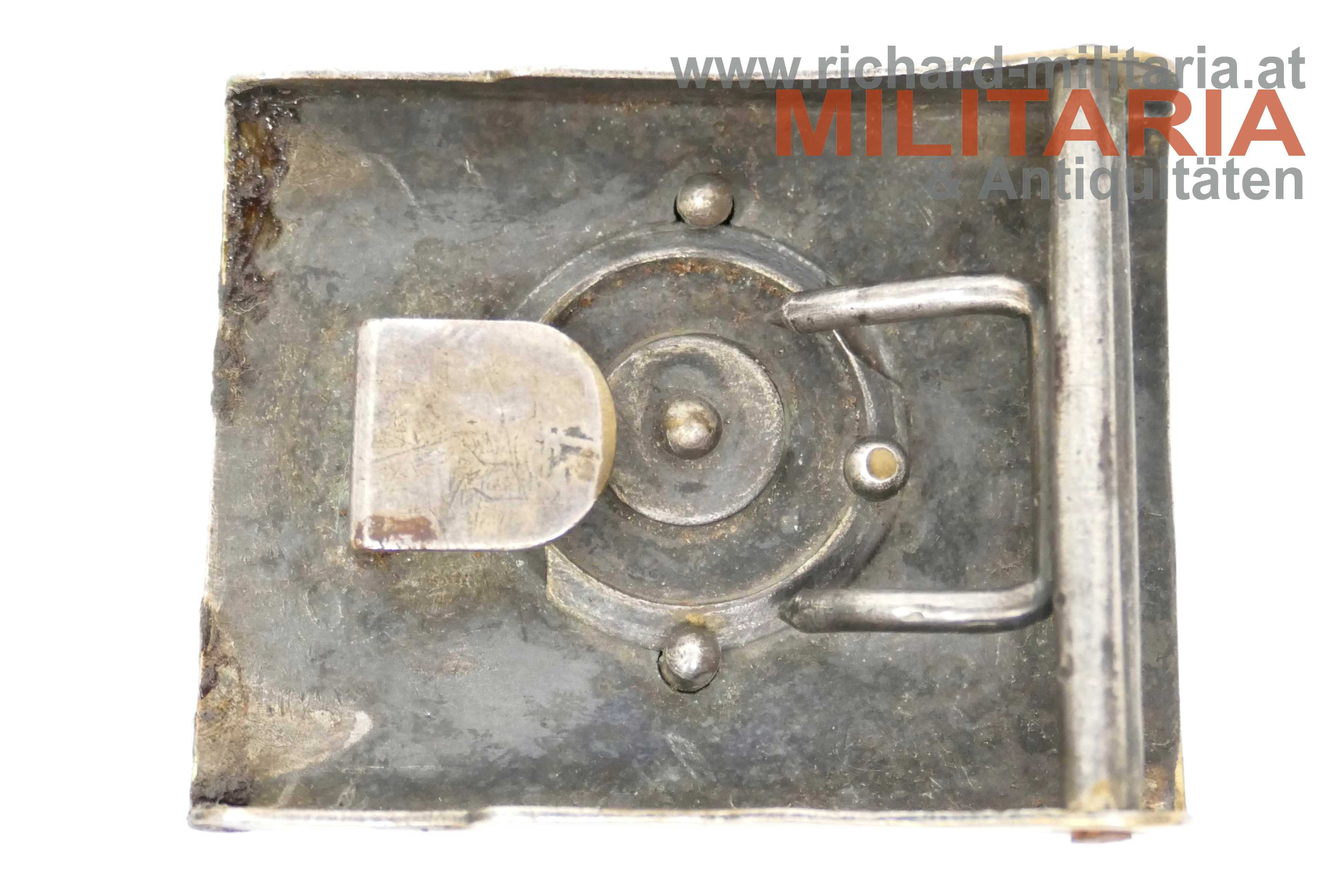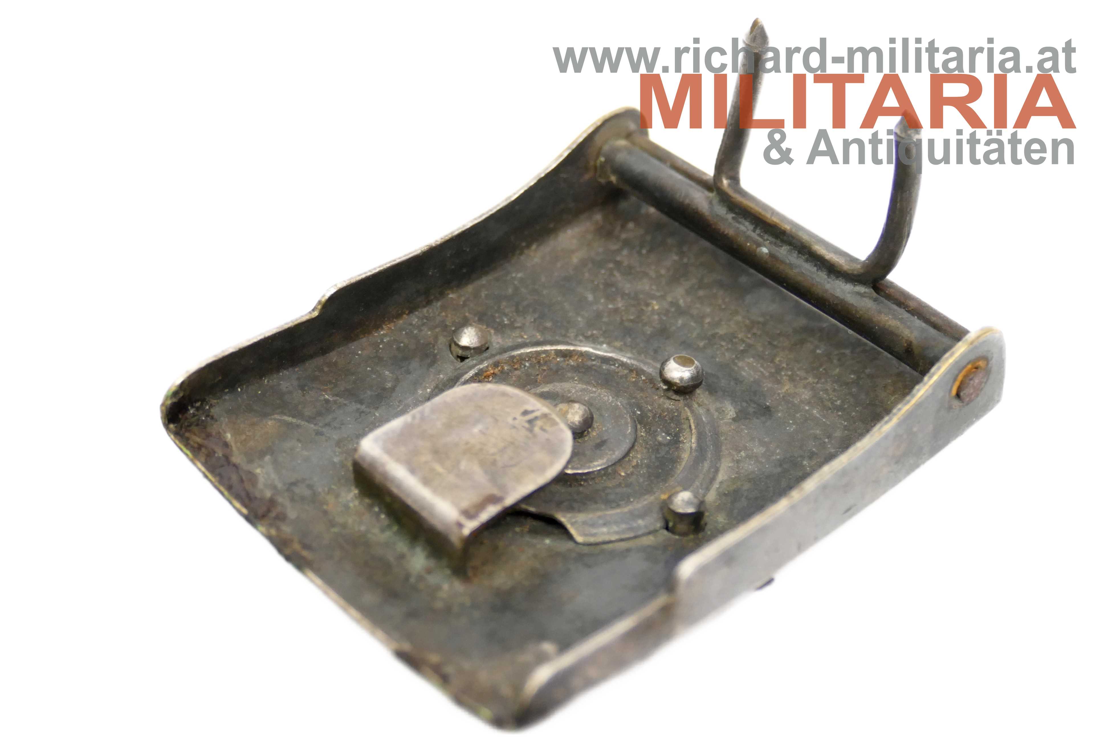 Leibriemenschließe für Mannschaften der k.k. Landwehr-Gebirgstruppen (vernickelt!) mit abnehmbarem Adler; Luxus-Sonderausführung mit dem runden Verschlußsystem und abgeschrägten Längskanten; sehr plastisch und fein geprägter Adler; schöne Patina (!); unmagnetisches Metall vernickelt; ohne Hersteller; guter getragener Zustand