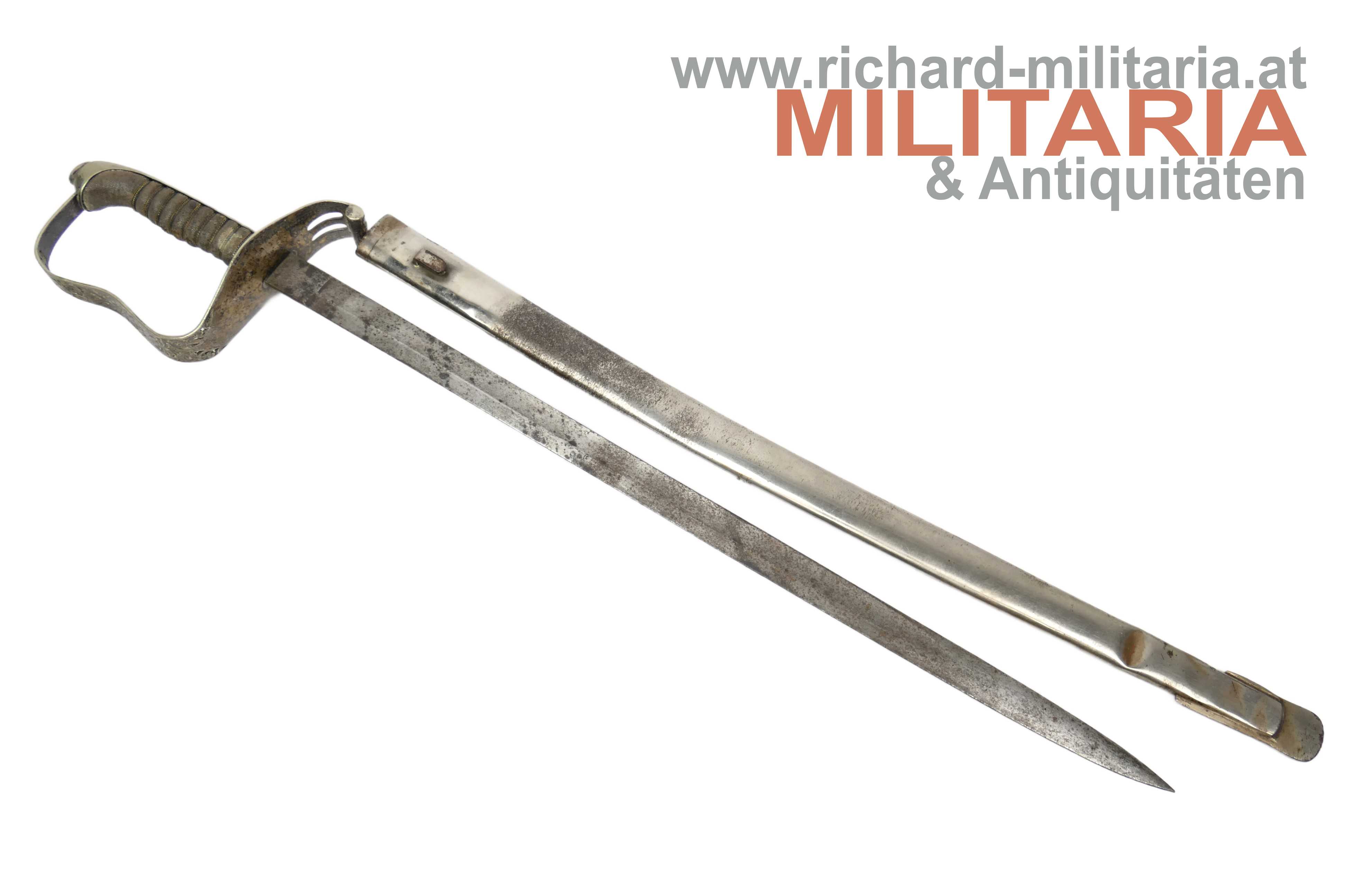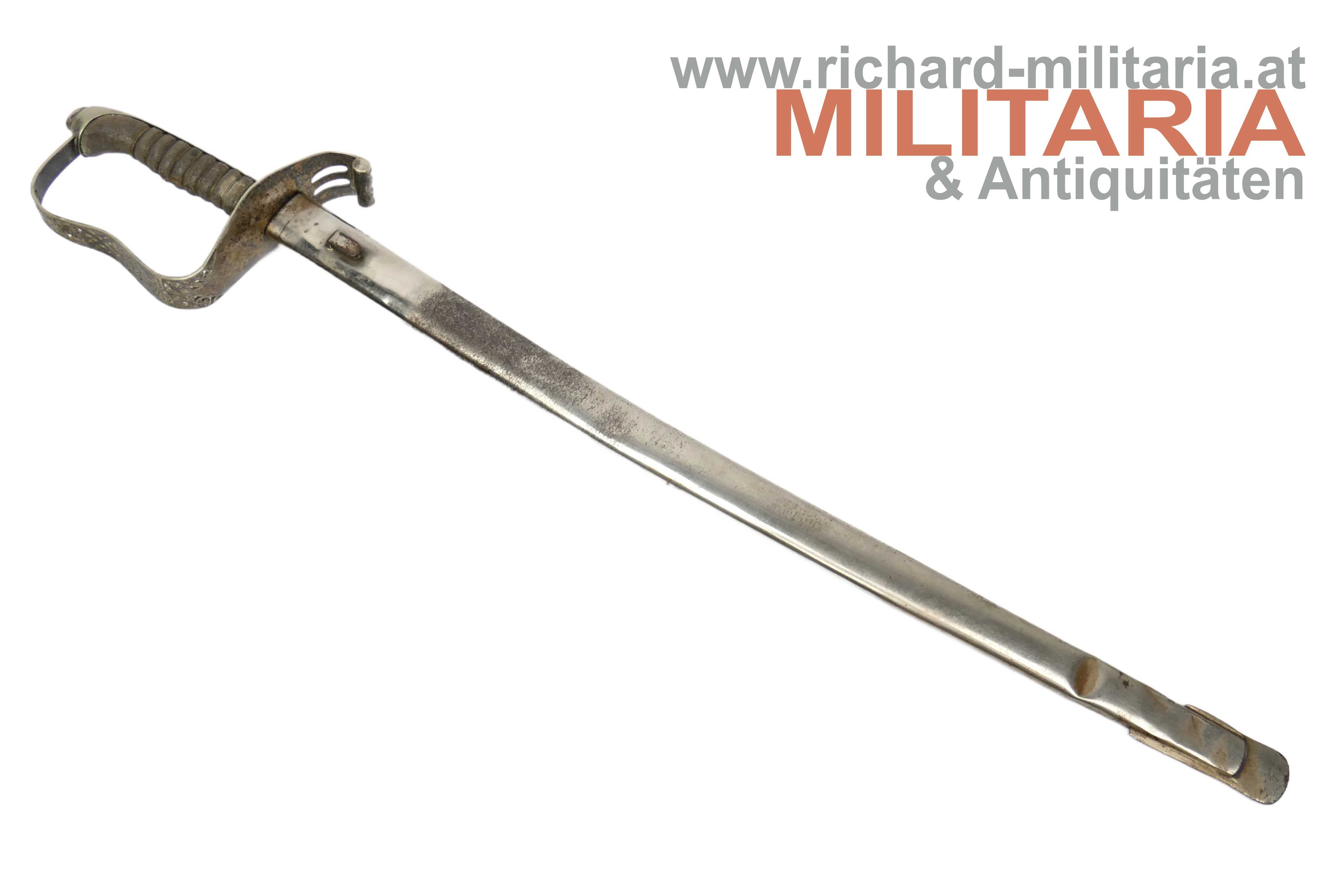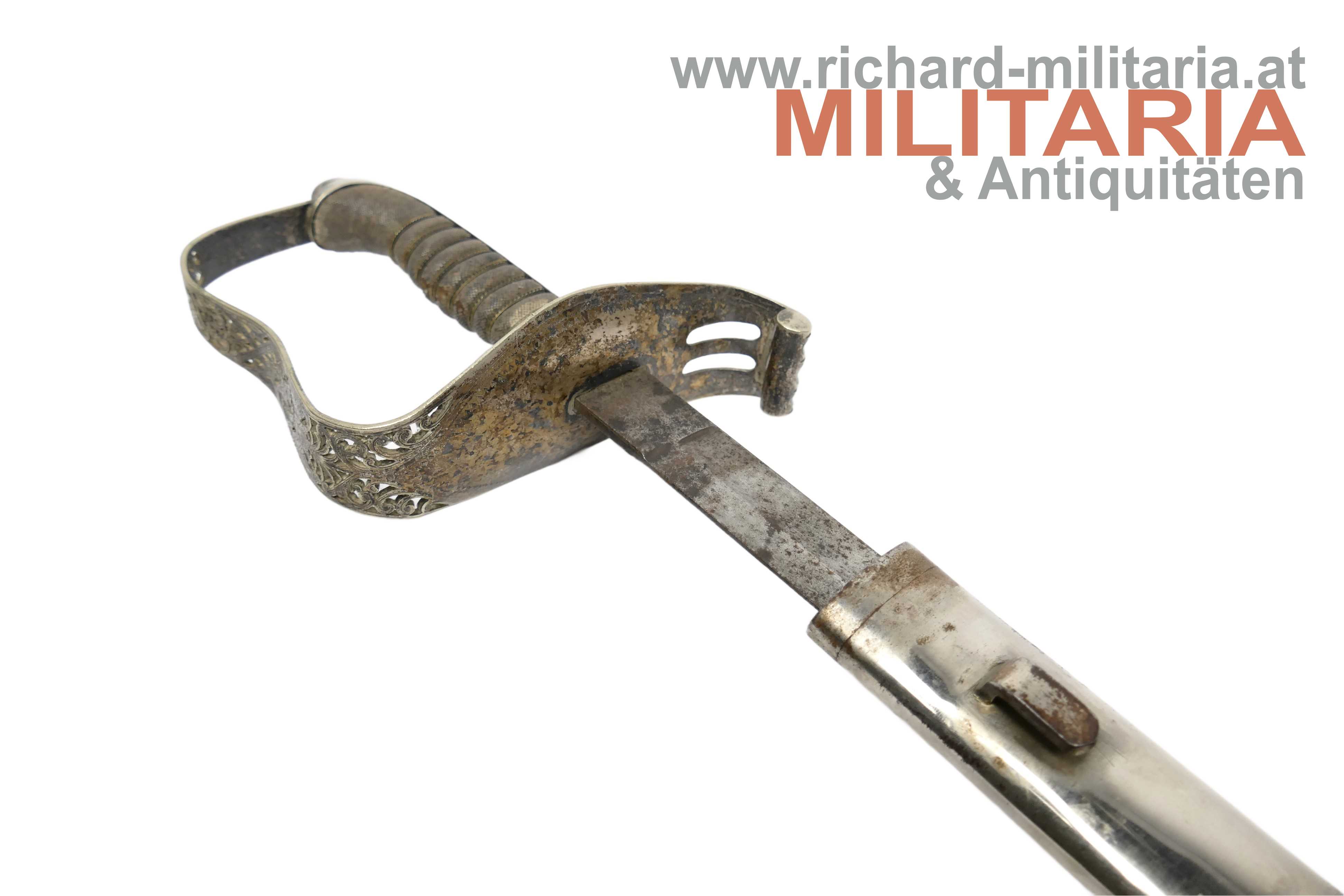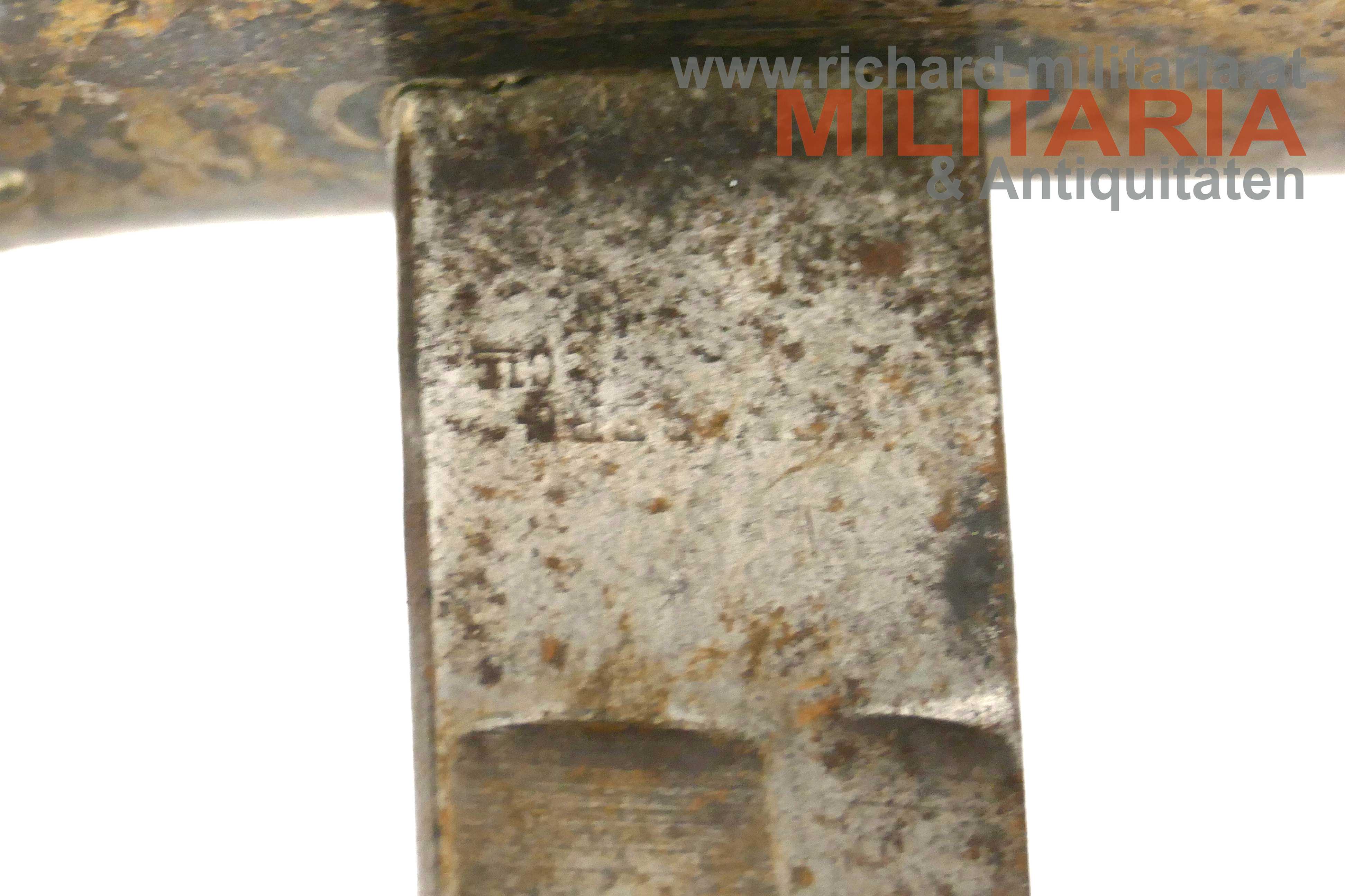 k.k. Landwehr-Gebirgstruppen Säbel für Offiziere; Ausführung Kaiser Franz Josef; fleckige und flugrostige Klinge; auf der Fehlschärfe beidseitg und teilweise lesbar gestempelt (W. Kralk Linz ?); Griff aus Fischhaut mit dreifacher Drahtwicklung; durchbrochener Korb mit dem Allerhöchsten Namenszug "FJ1"; pflege- und reinigungsbedürftig; vernickelte Scheide mit mehreren Dellen; flugrostig; Abdruck eines Koppelschuhs gut zu erkennen; Scheide im Modell des M1861 jedoch mit Trageöse für den Koppelschuh (!)