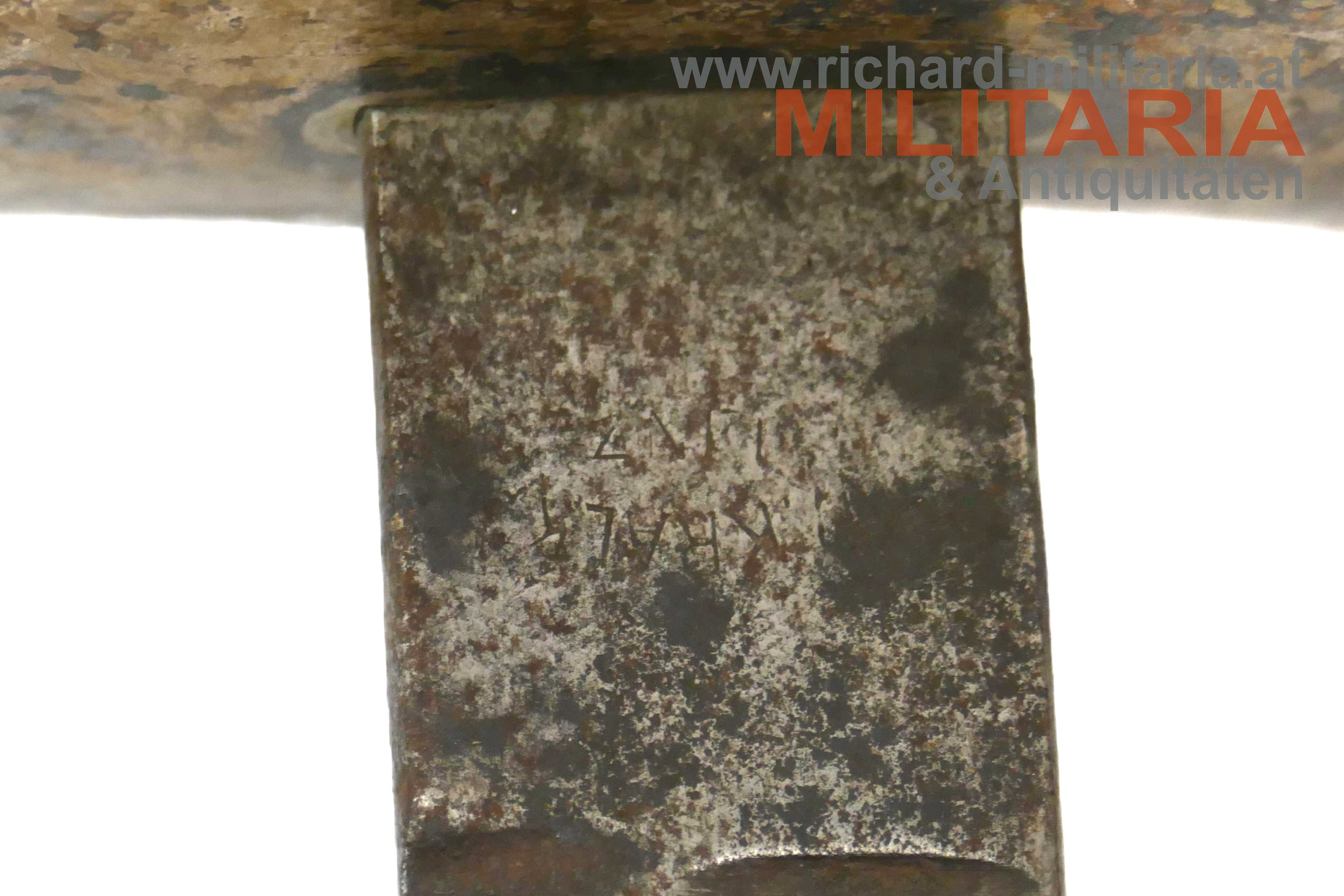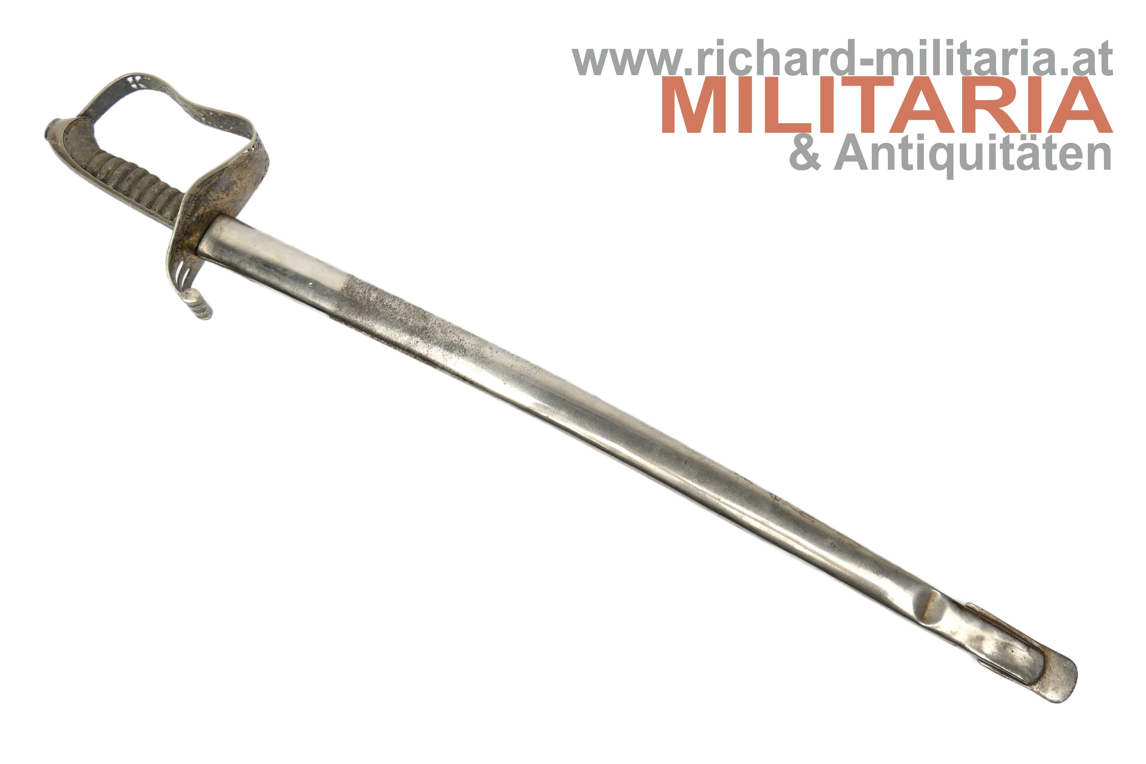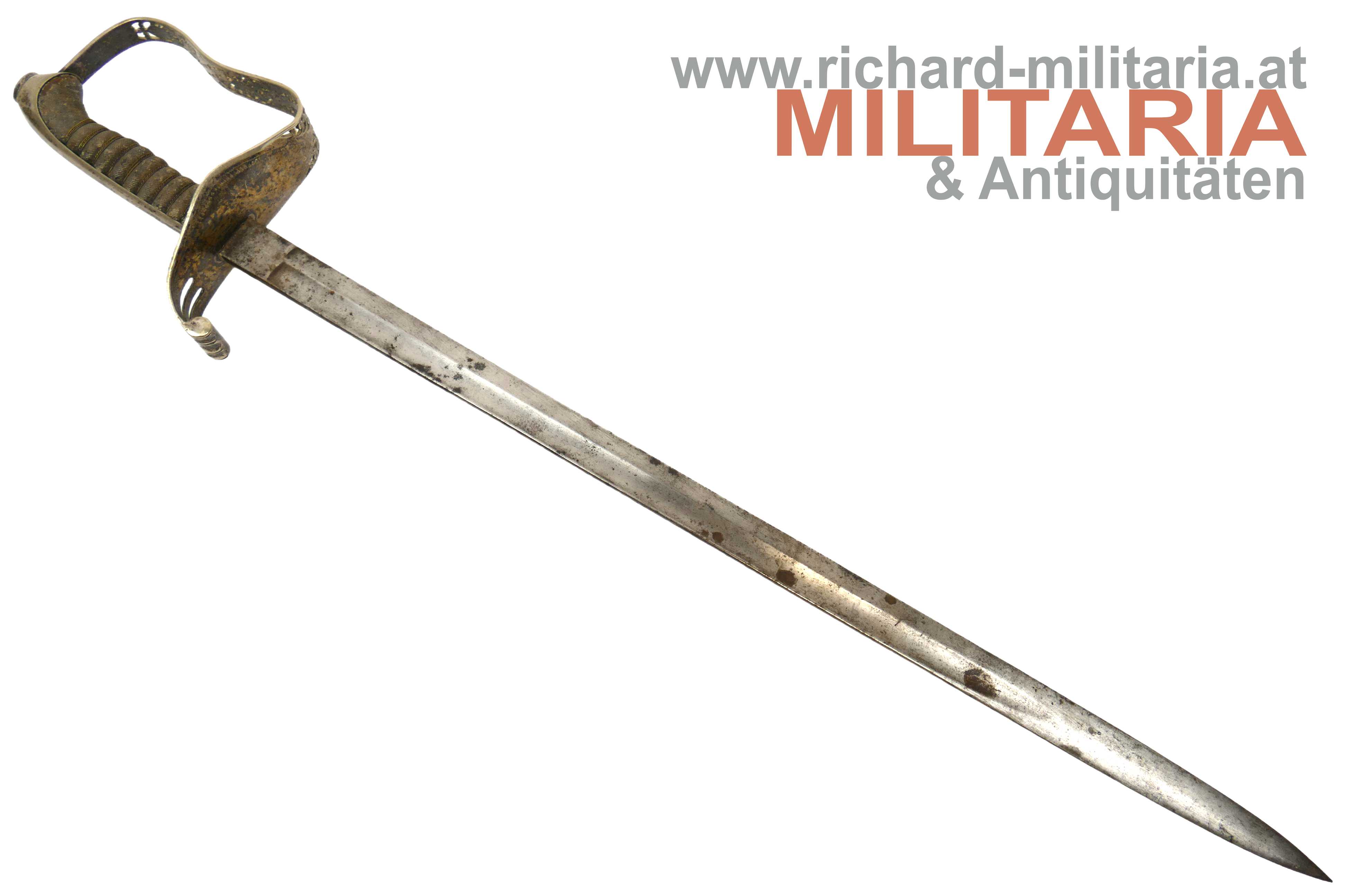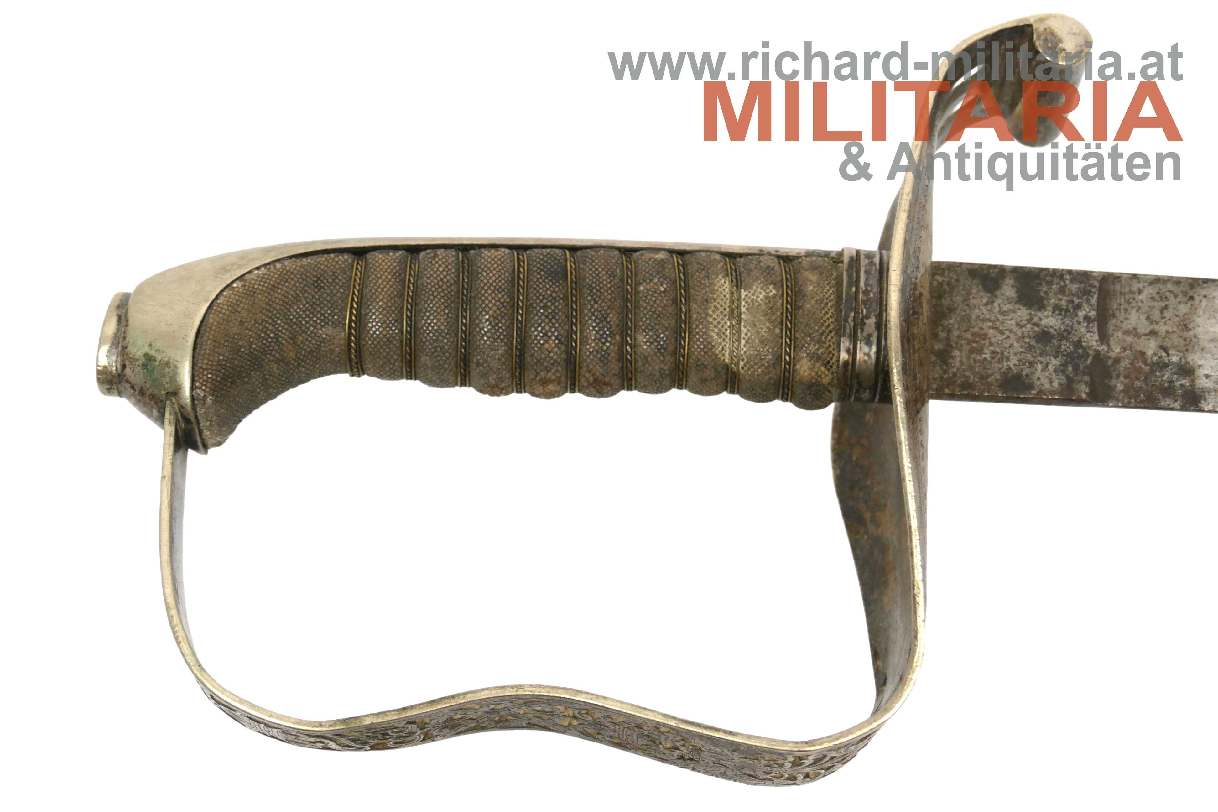 k.k. Landwehr-Gebirgstruppen Säbel für Offiziere; Ausführung Kaiser Franz Josef; fleckige und flugrostige Klinge; auf der Fehlschärfe beidseitg und teilweise lesbar gestempelt (W. Kralk Linz ?); Griff aus Fischhaut mit dreifacher Drahtwicklung; durchbrochener Korb mit dem Allerhöchsten Namenszug "FJ1"; pflege- und reinigungsbedürftig; vernickelte Scheide mit mehreren Dellen; flugrostig; Abdruck eines Koppelschuhs gut zu erkennen; Scheide im Modell des M1861 jedoch mit Trageöse für den Koppelschuh (!)