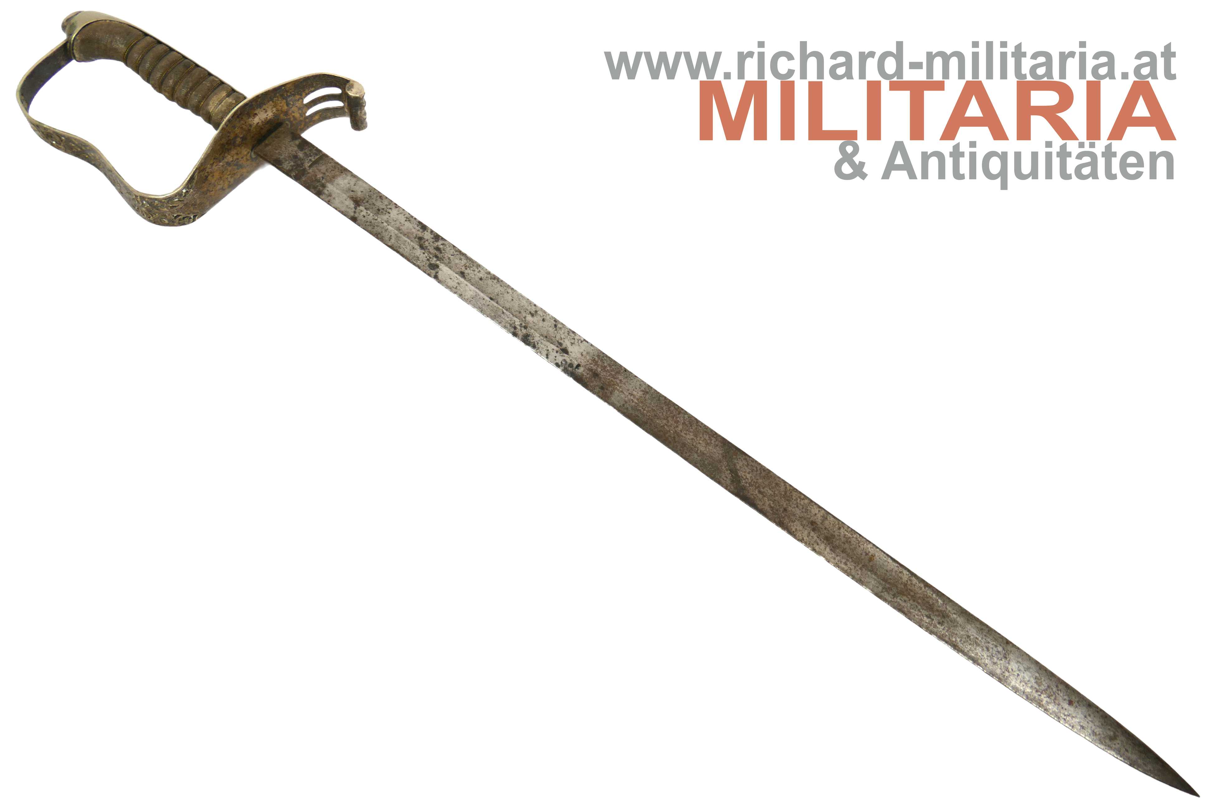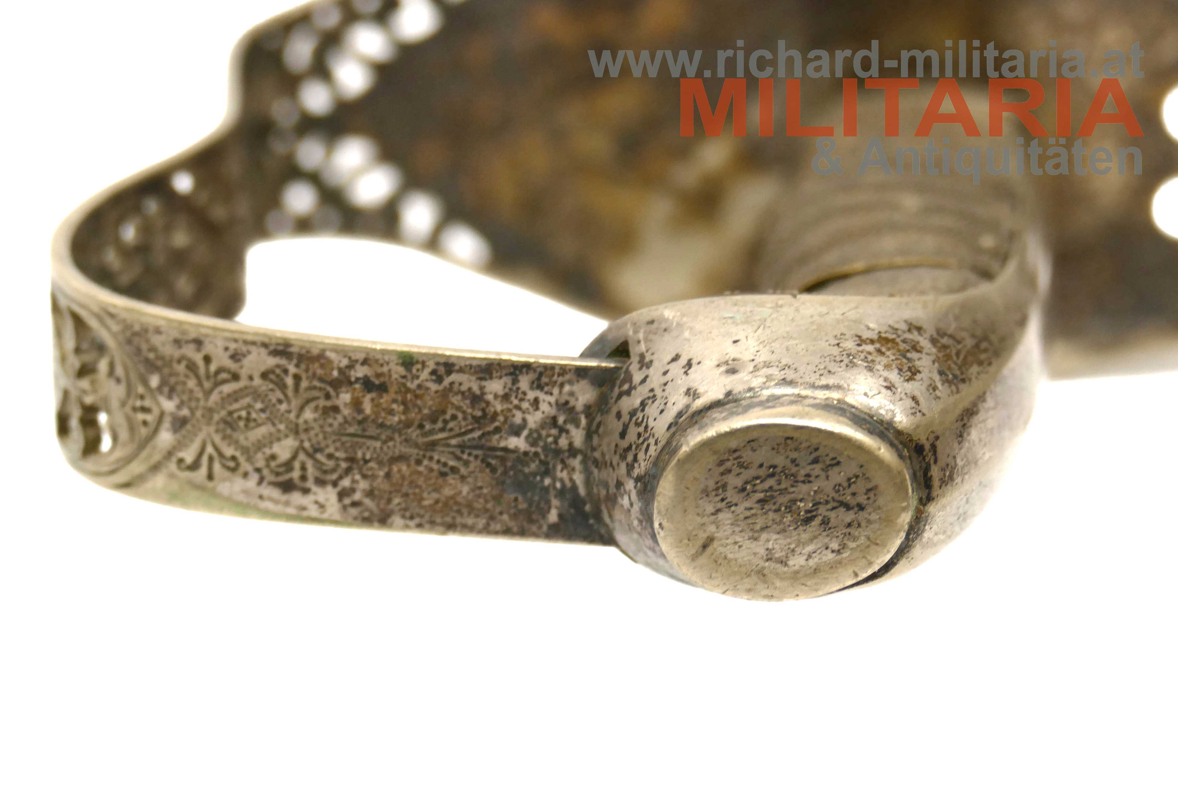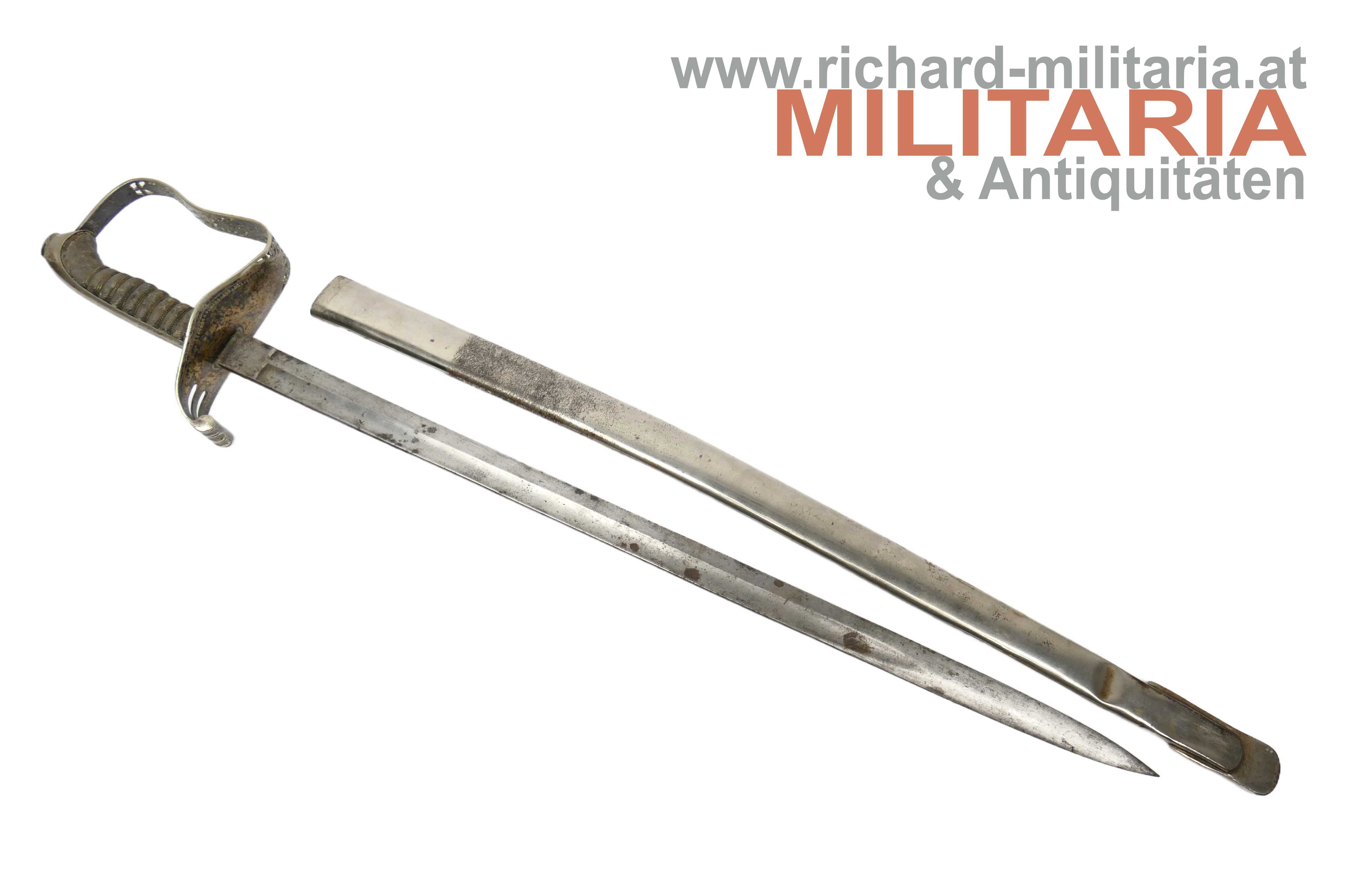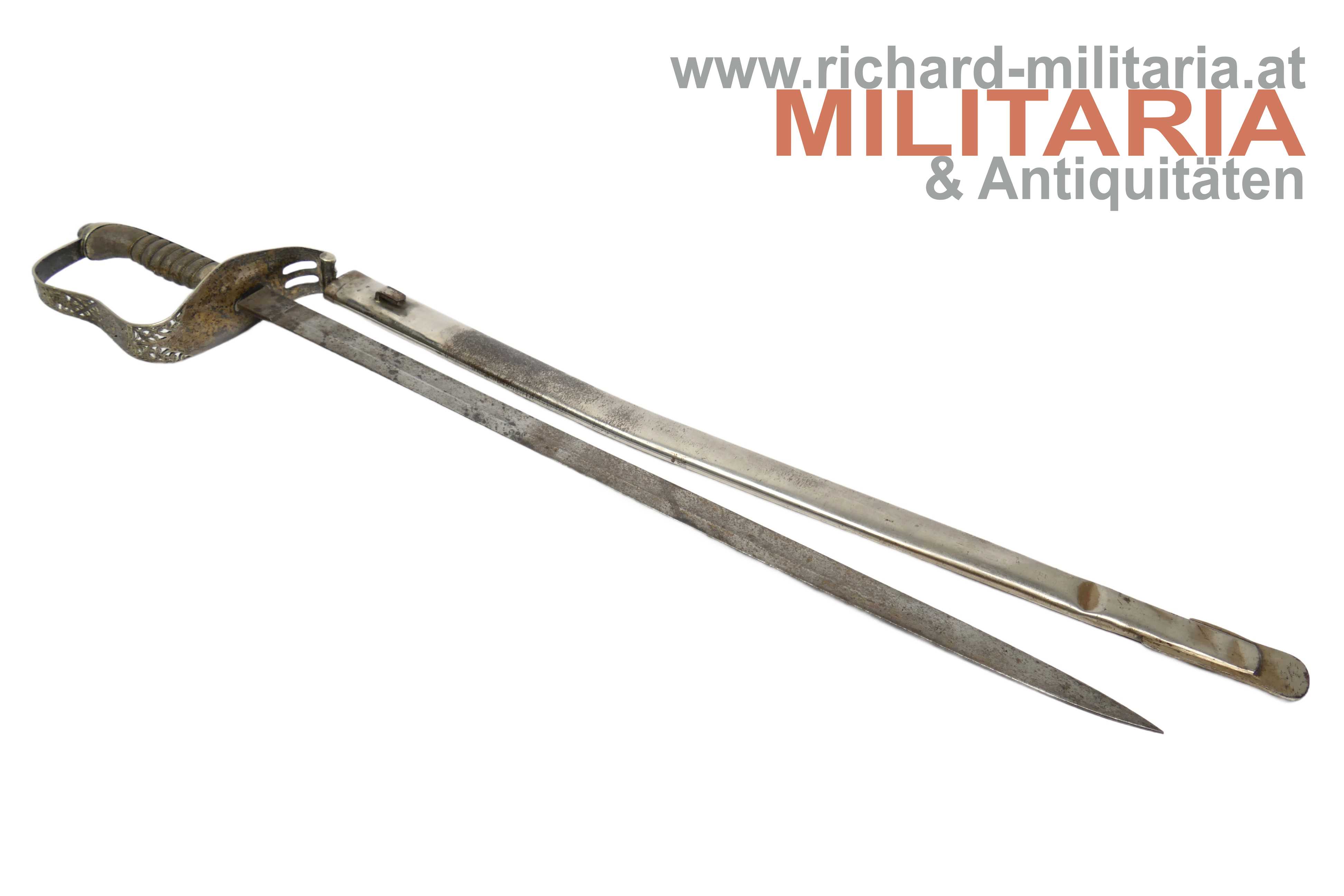 k.k. Landwehr-Gebirgstruppen Säbel für Offiziere; Ausführung Kaiser Franz Josef; fleckige und flugrostige Klinge; auf der Fehlschärfe beidseitg und teilweise lesbar gestempelt (W. Kralk Linz ?); Griff aus Fischhaut mit dreifacher Drahtwicklung; durchbrochener Korb mit dem Allerhöchsten Namenszug "FJ1"; pflege- und reinigungsbedürftig; vernickelte Scheide mit mehreren Dellen; flugrostig; Abdruck eines Koppelschuhs gut zu erkennen; Scheide im Modell des M1861 jedoch mit Trageöse für den Koppelschuh (!)