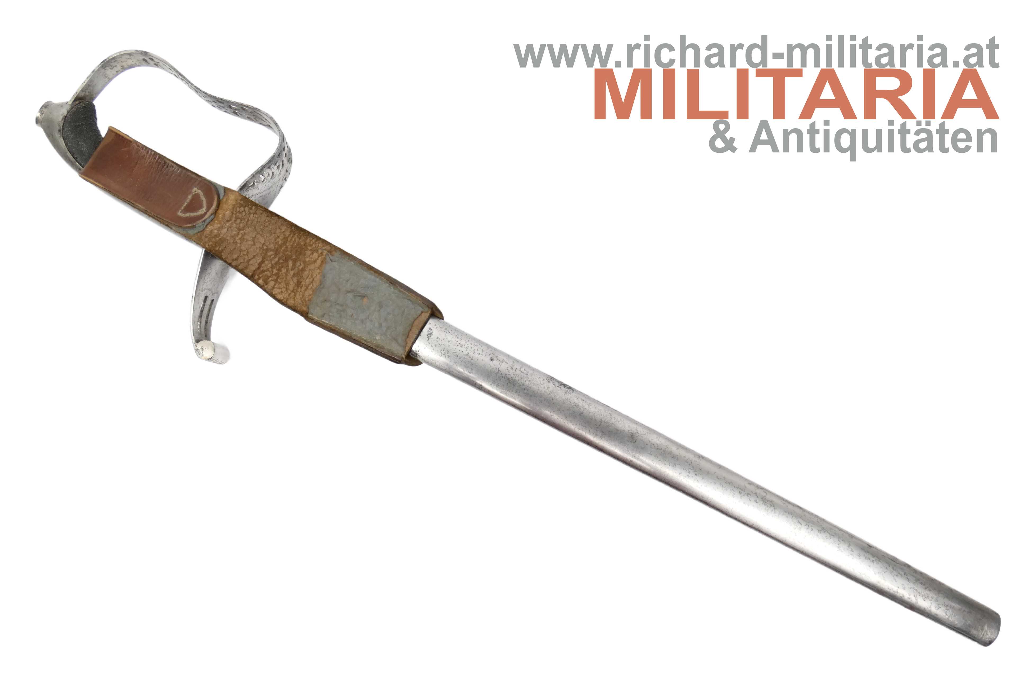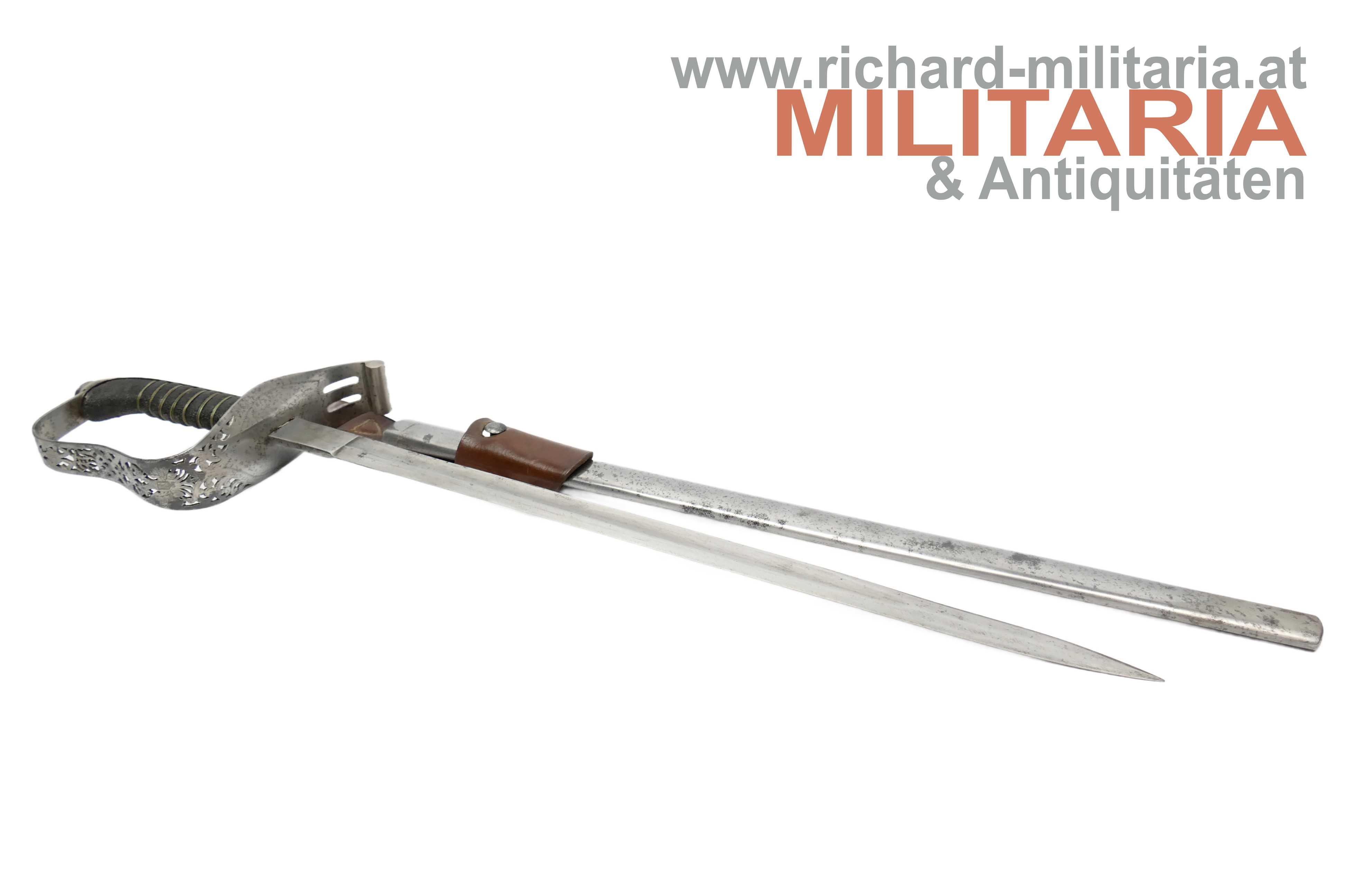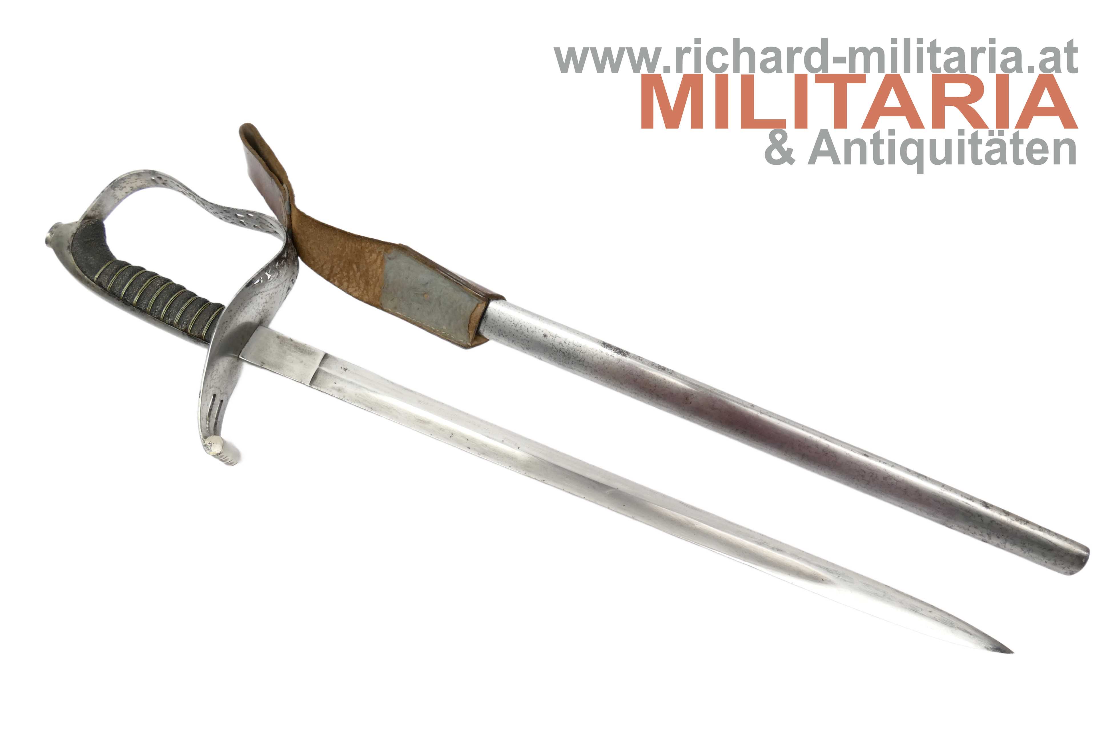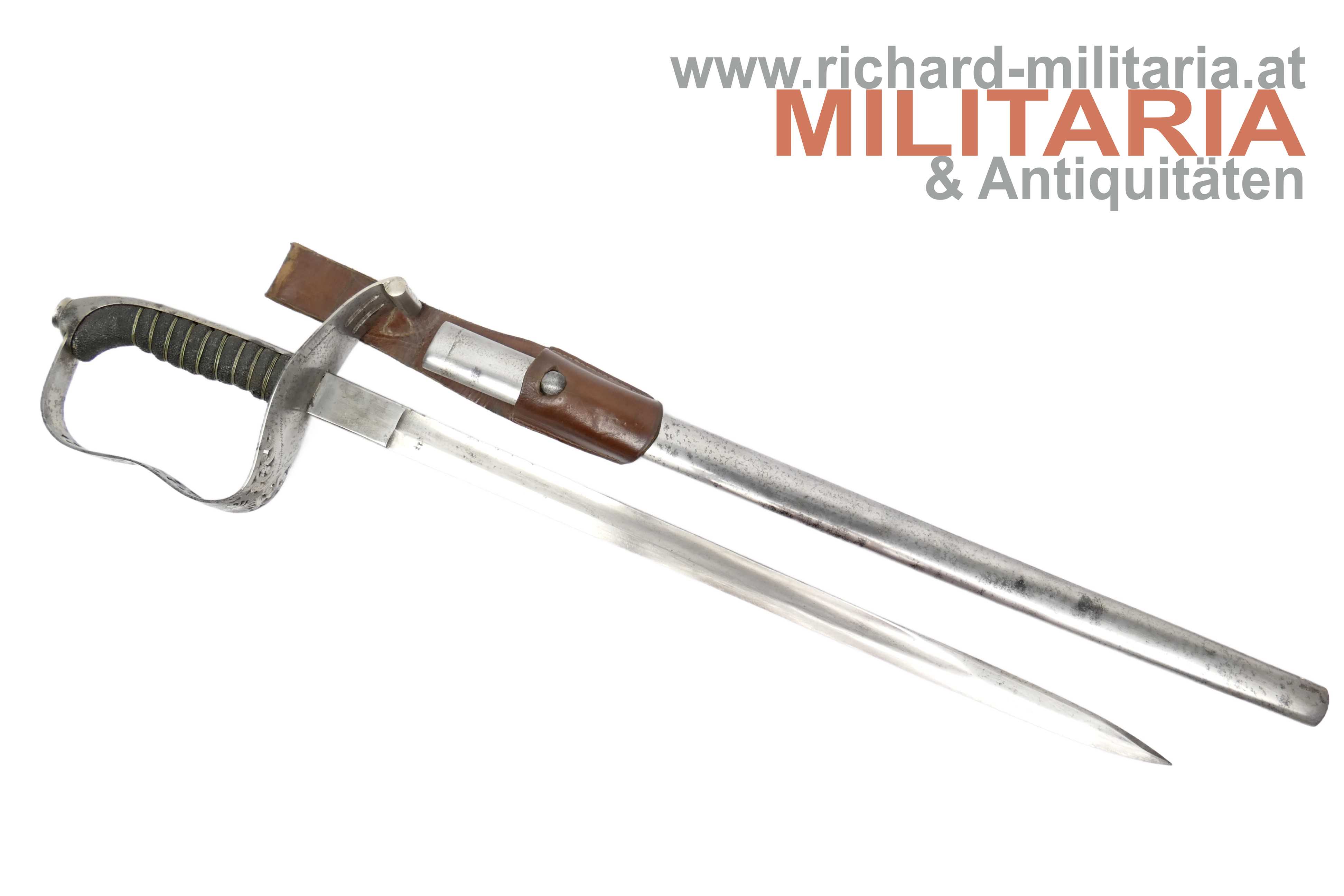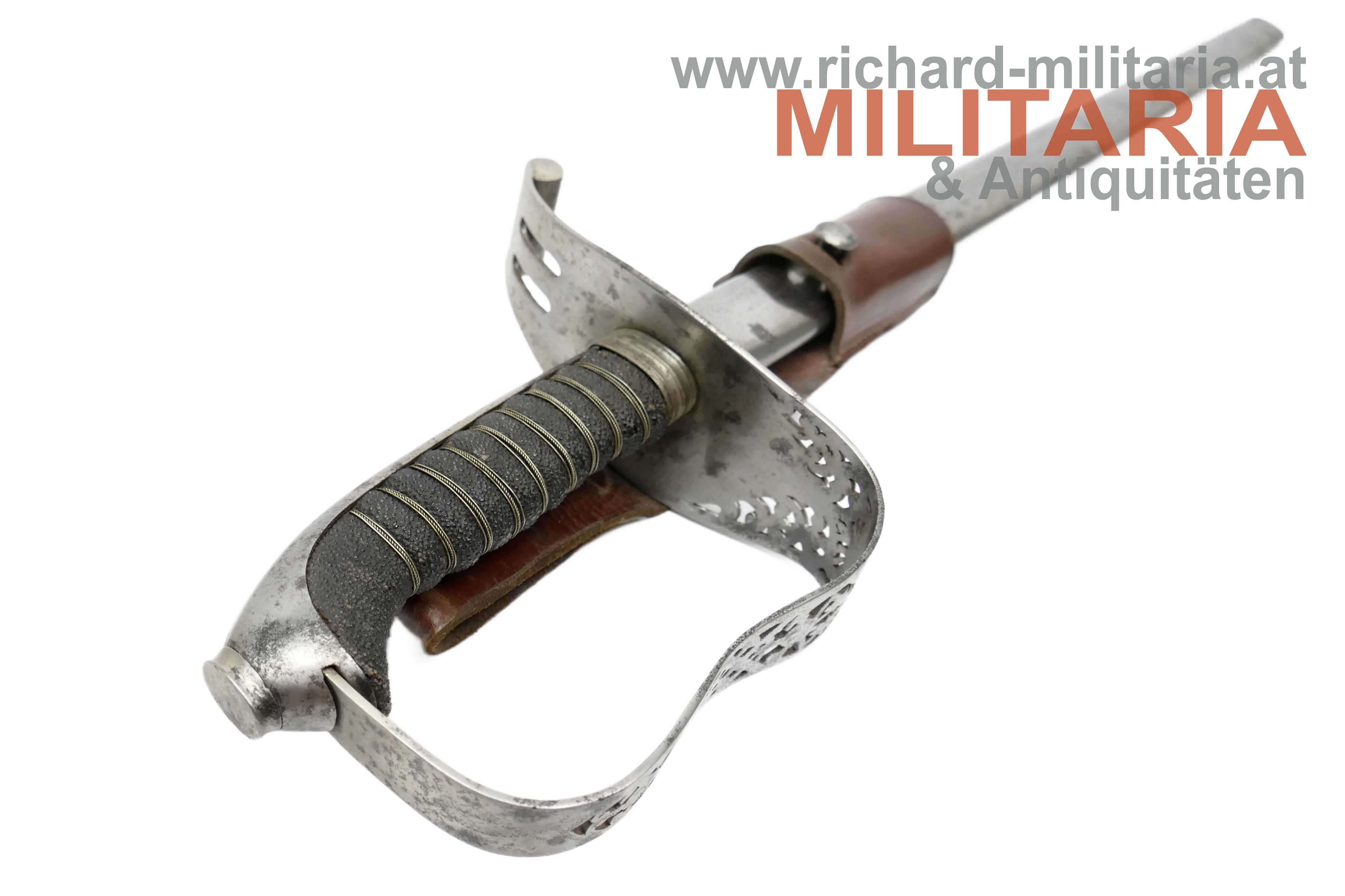 k.k. Landwehr-Gebirgstruppen - Säbel für Offiziere - FJ1; gut erhaltene vernickelte Klinge ohne Stempelungen - minimal fleckig; Griff aus Fischhaut mit dreifacher Drahtwicklung; durchbrochener Korb mit Allerhöchsten Namenszug "FJ1"; gereinigte etwas fleckige und minimal narbige Scheide mit Steckkuppelmontierung; zugehöriger geschmeidiger Lederkoppelschuh; alle Nähte fest; revers am Koppelschuh noch Reste der hechtgrauen Wollabdeckung vorhanden;